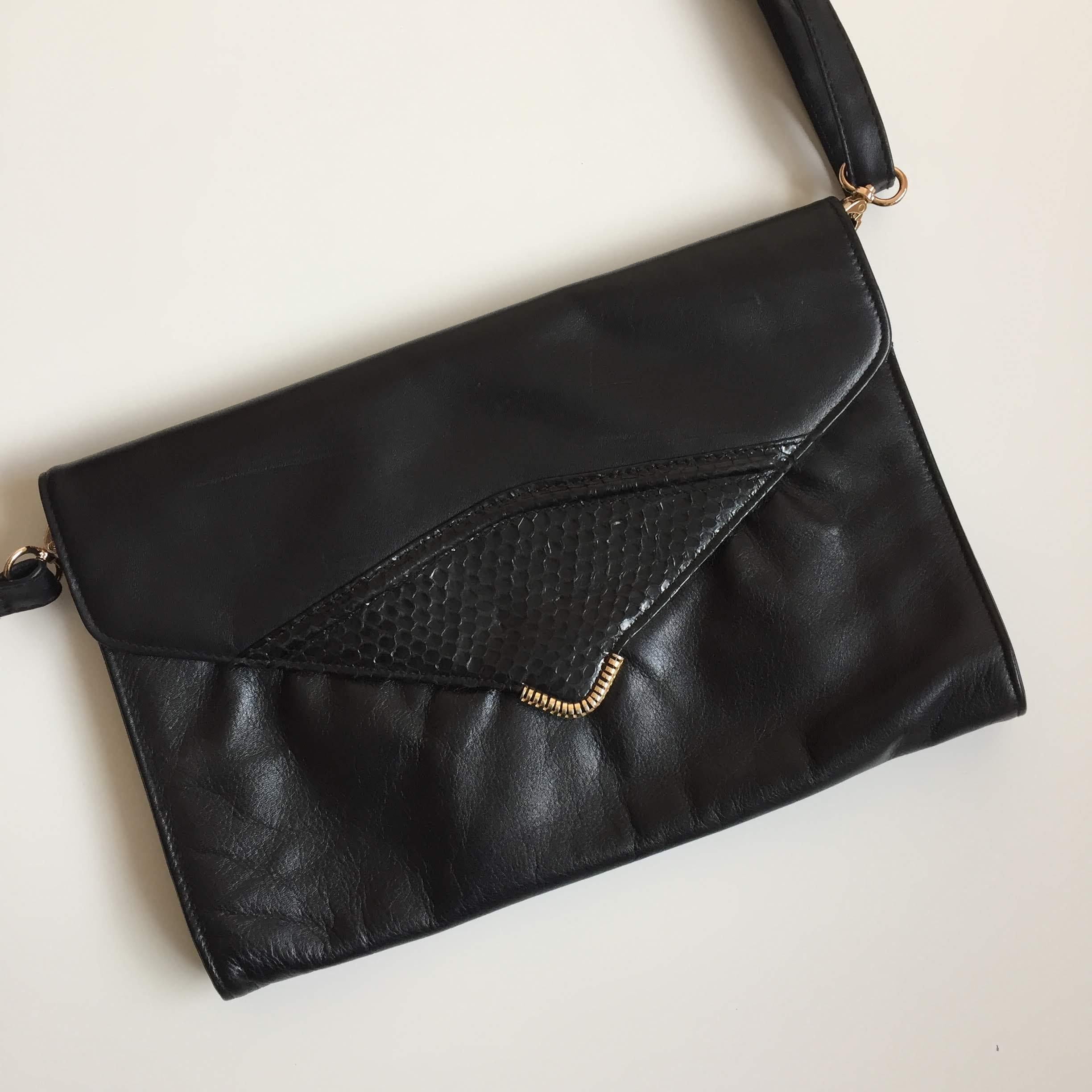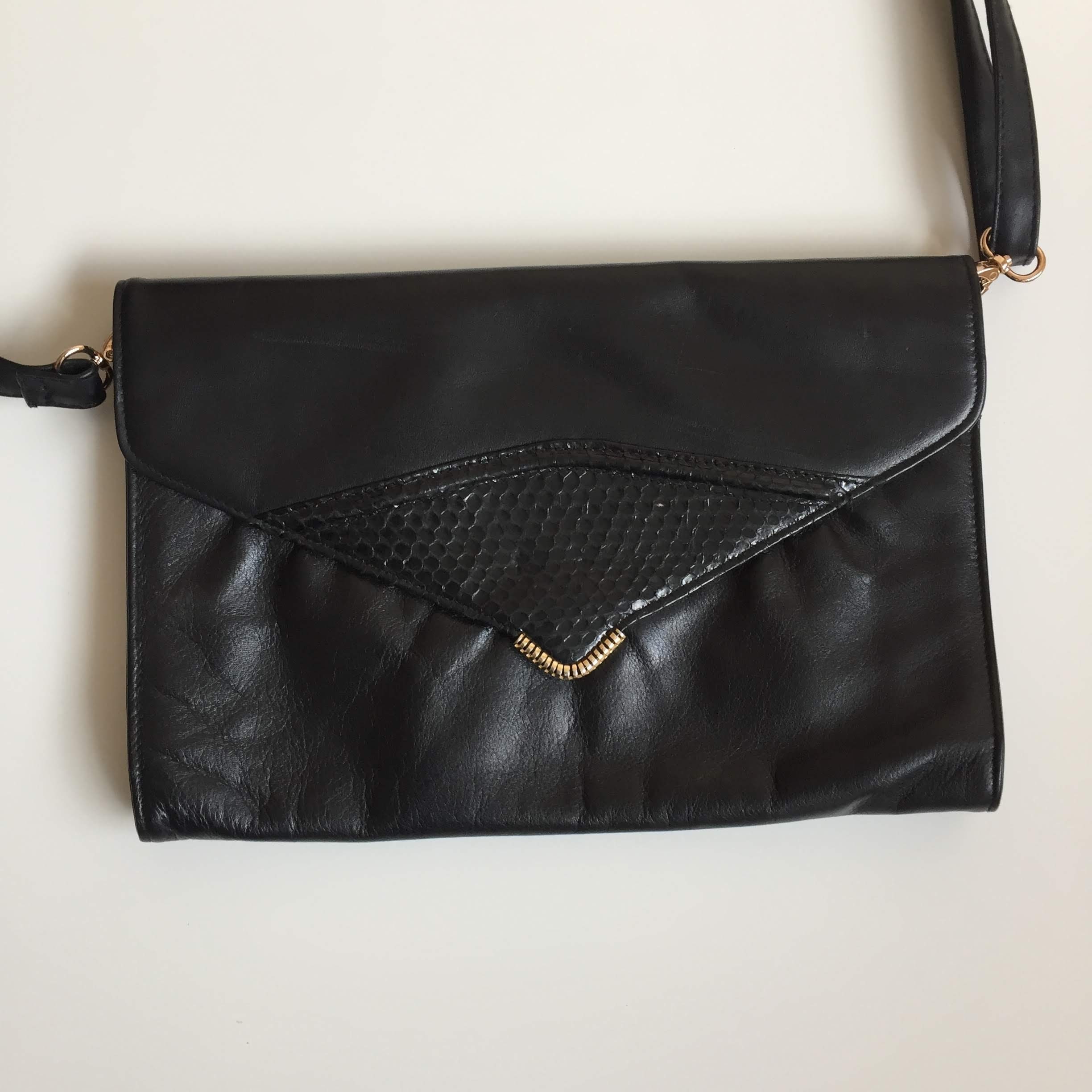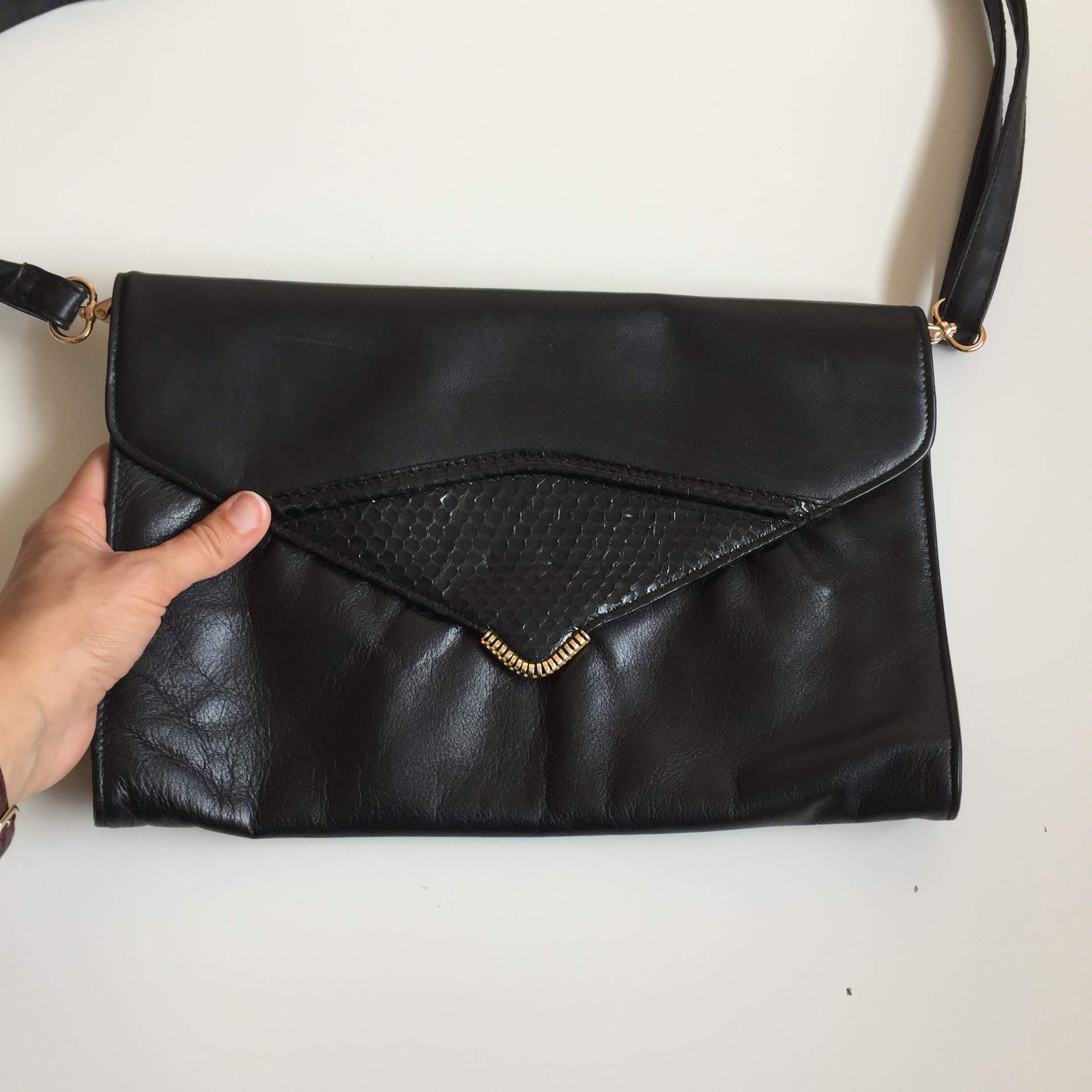 This is a large envelope crossbody clutch wallet with detachable shoulder strap. This 80s envelope handbag is made of genuine leather, it has a magnetic closure. The interior is lined in faux leather. There is one compartment and one pocket with zip closure. When I originally got this purse the original strap was missing. I found a faux leather strap with gold tone hardware to match the purse and they look great together.