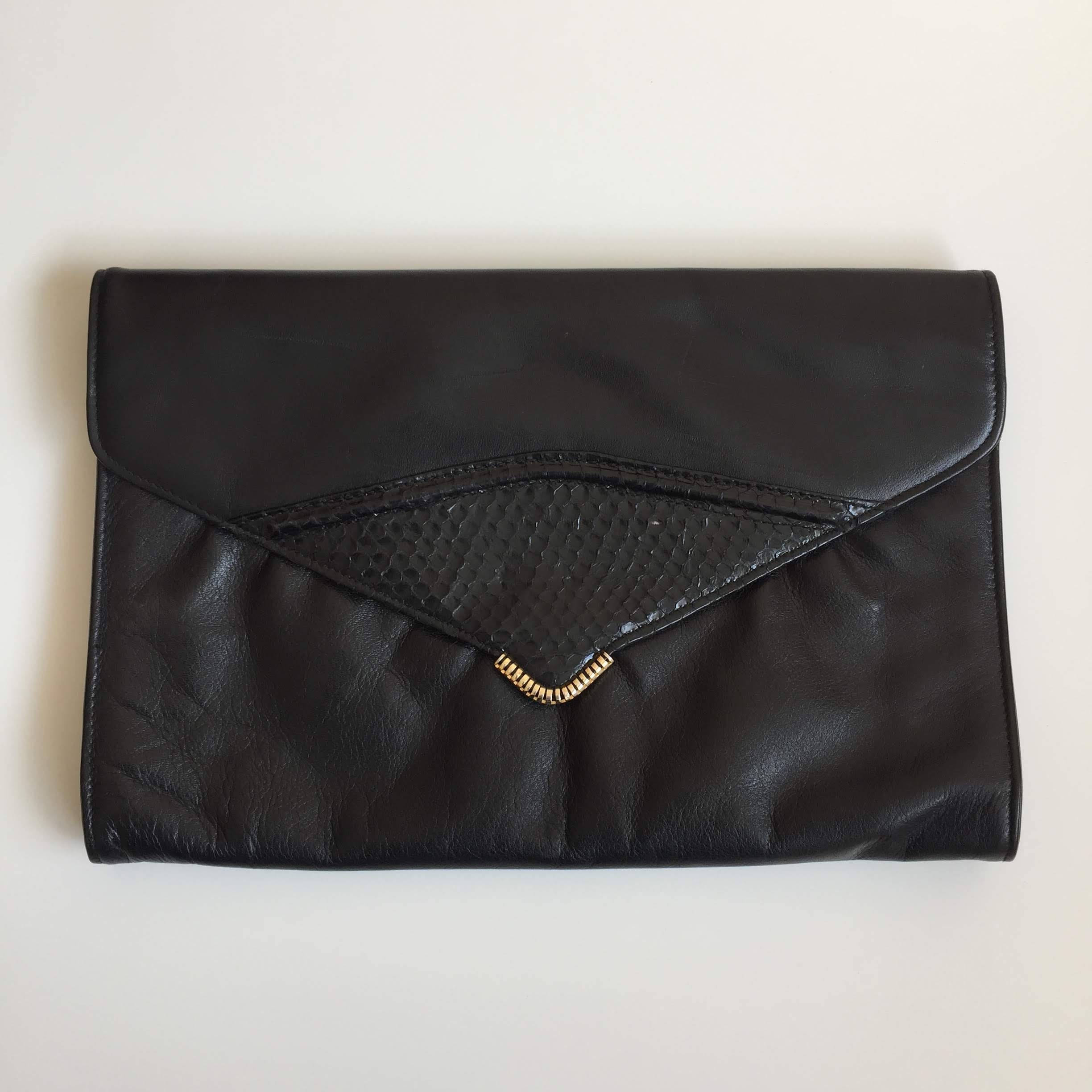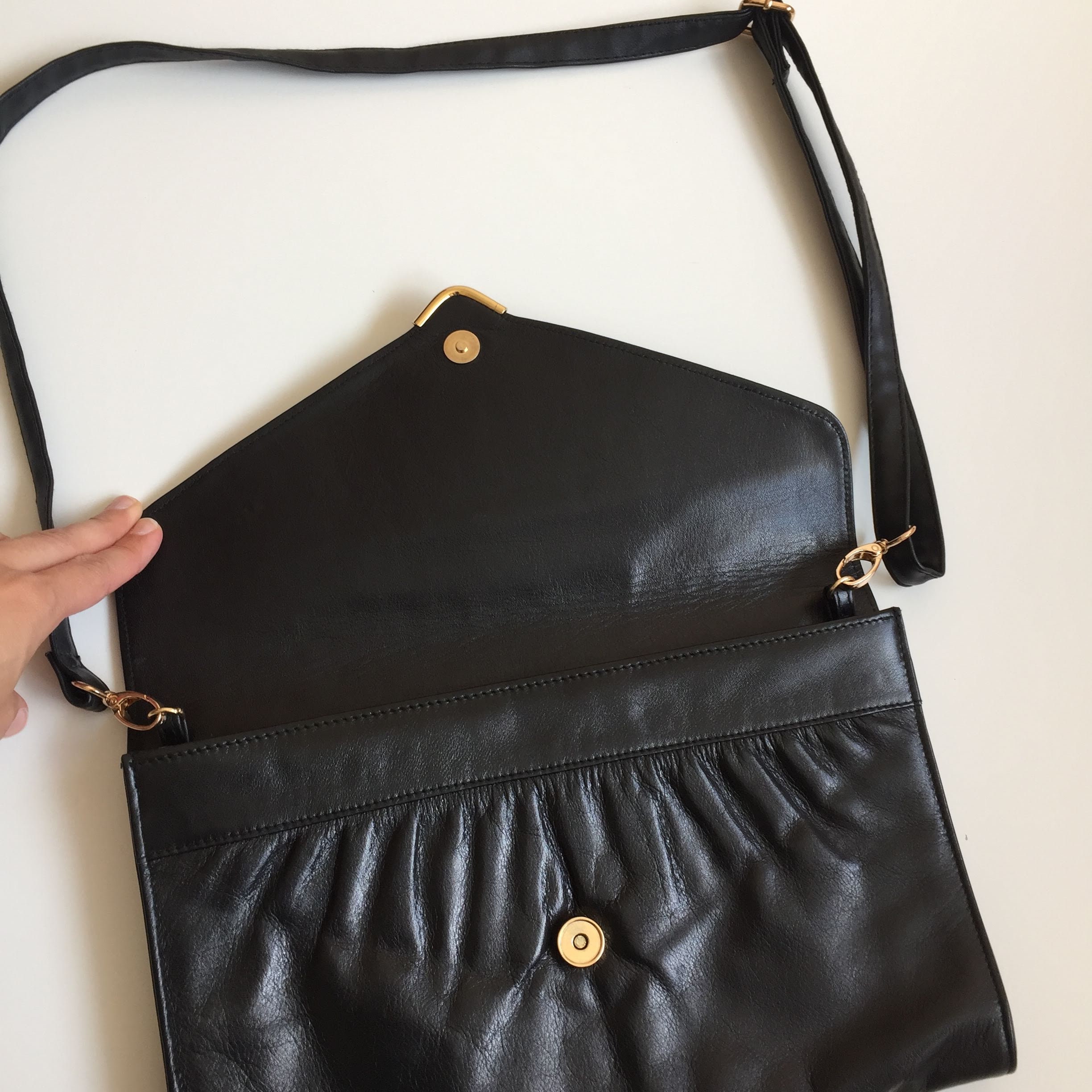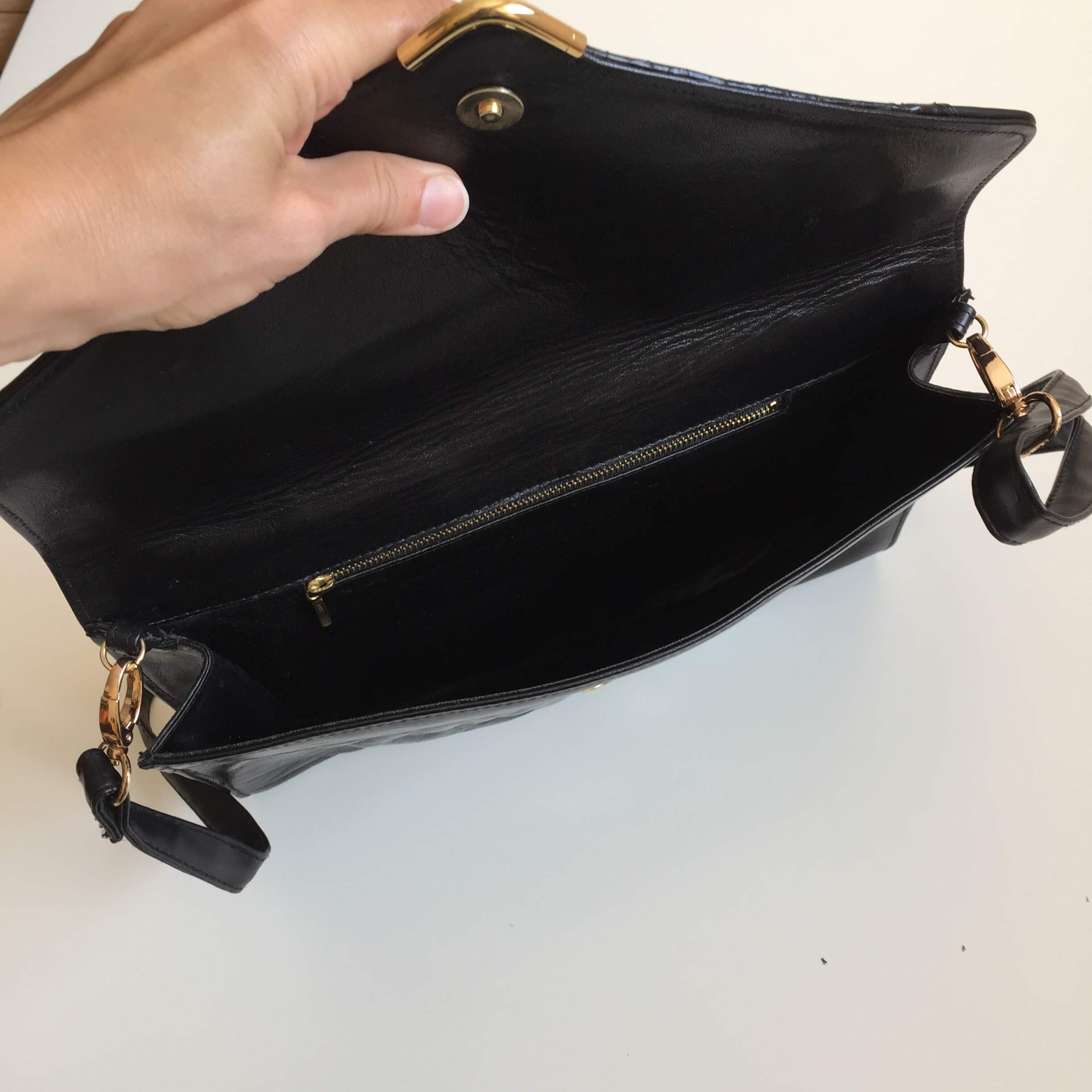 This is a large envelope crossbody clutch wallet with detachable shoulder strap. This 80s envelope handbag is made of genuine leather, it has a magnetic closure. The interior is lined in faux leather. There is one compartment and one pocket with zip closure. When I originally got this purse the original strap was missing. I found a faux leather strap with gold tone hardware to match the purse and they look great together.