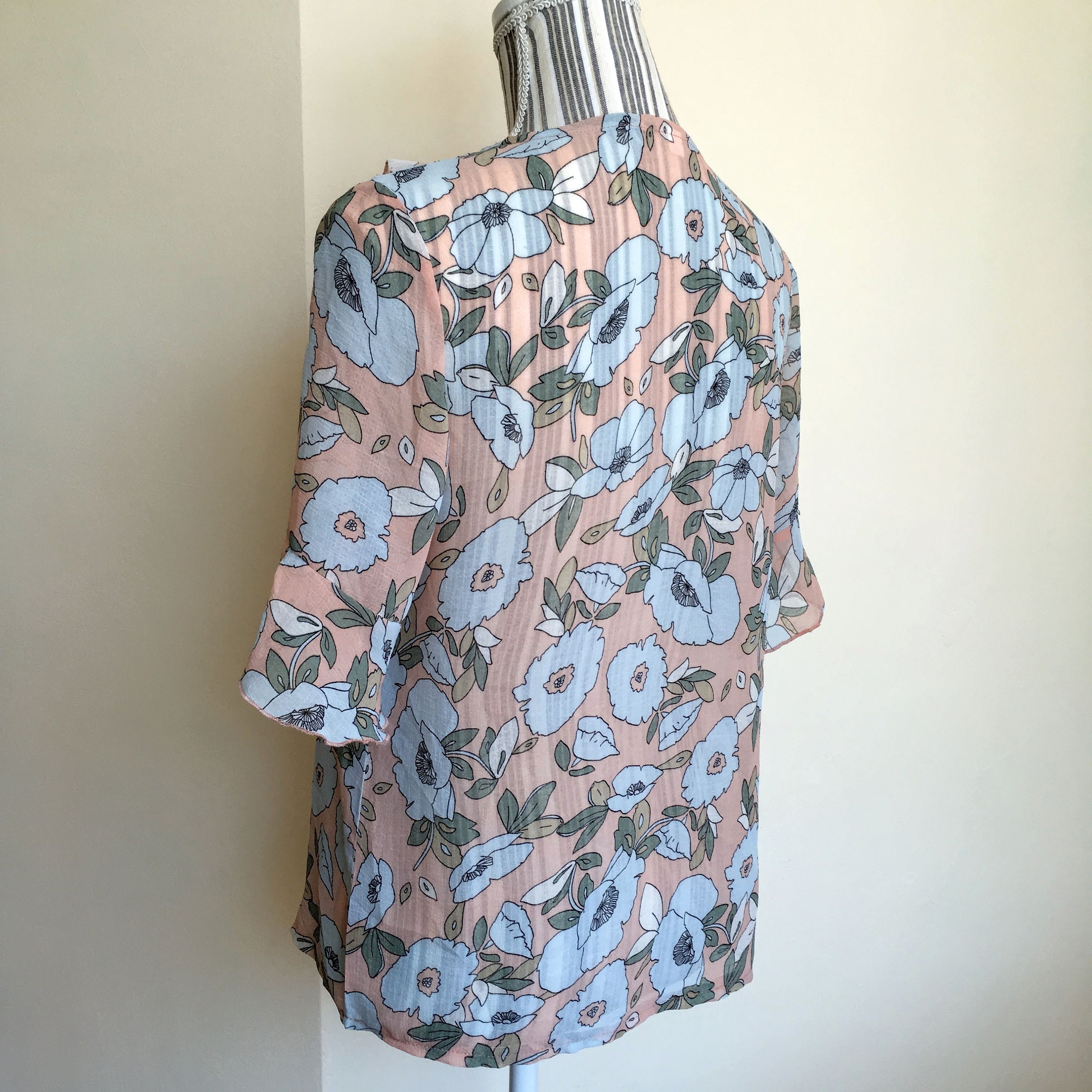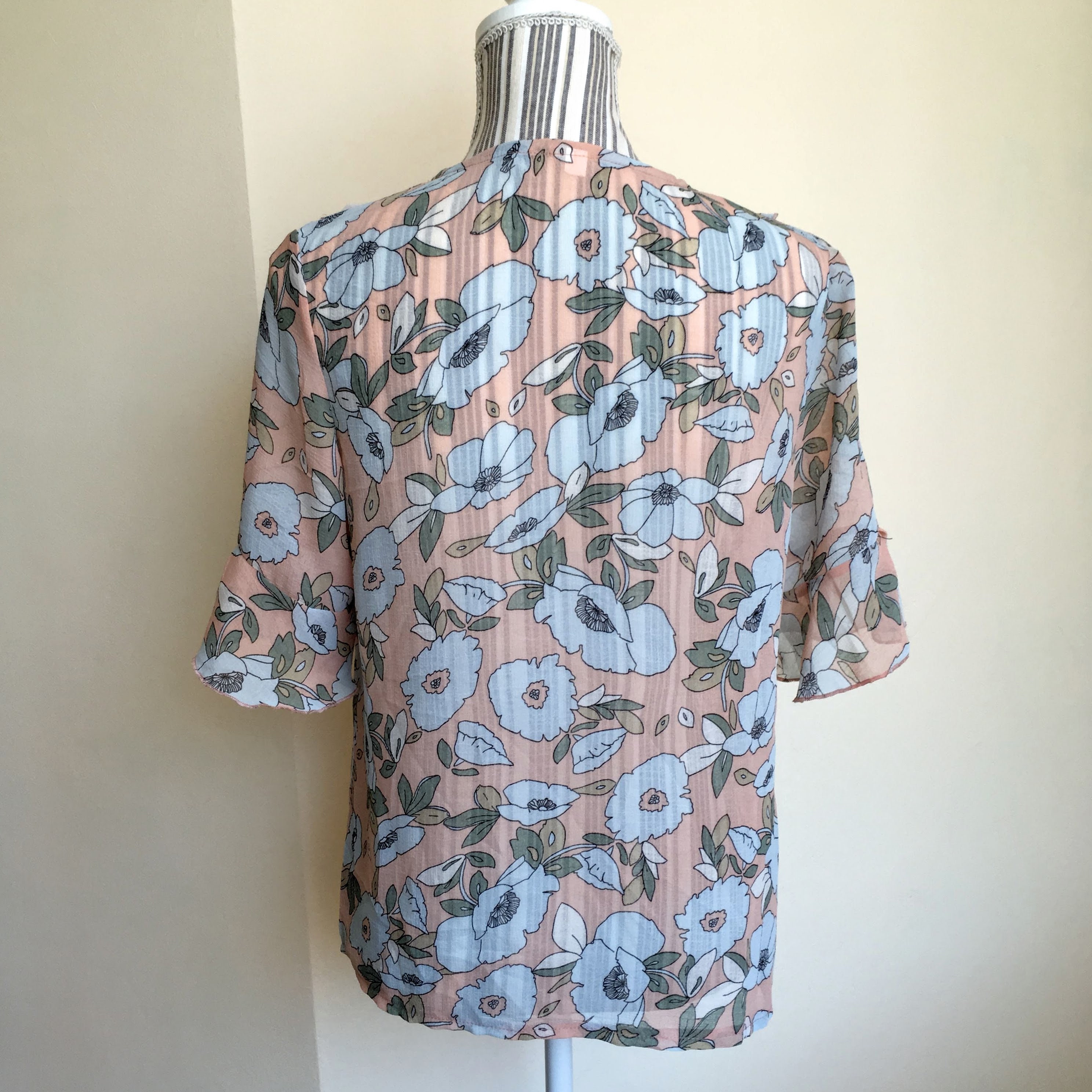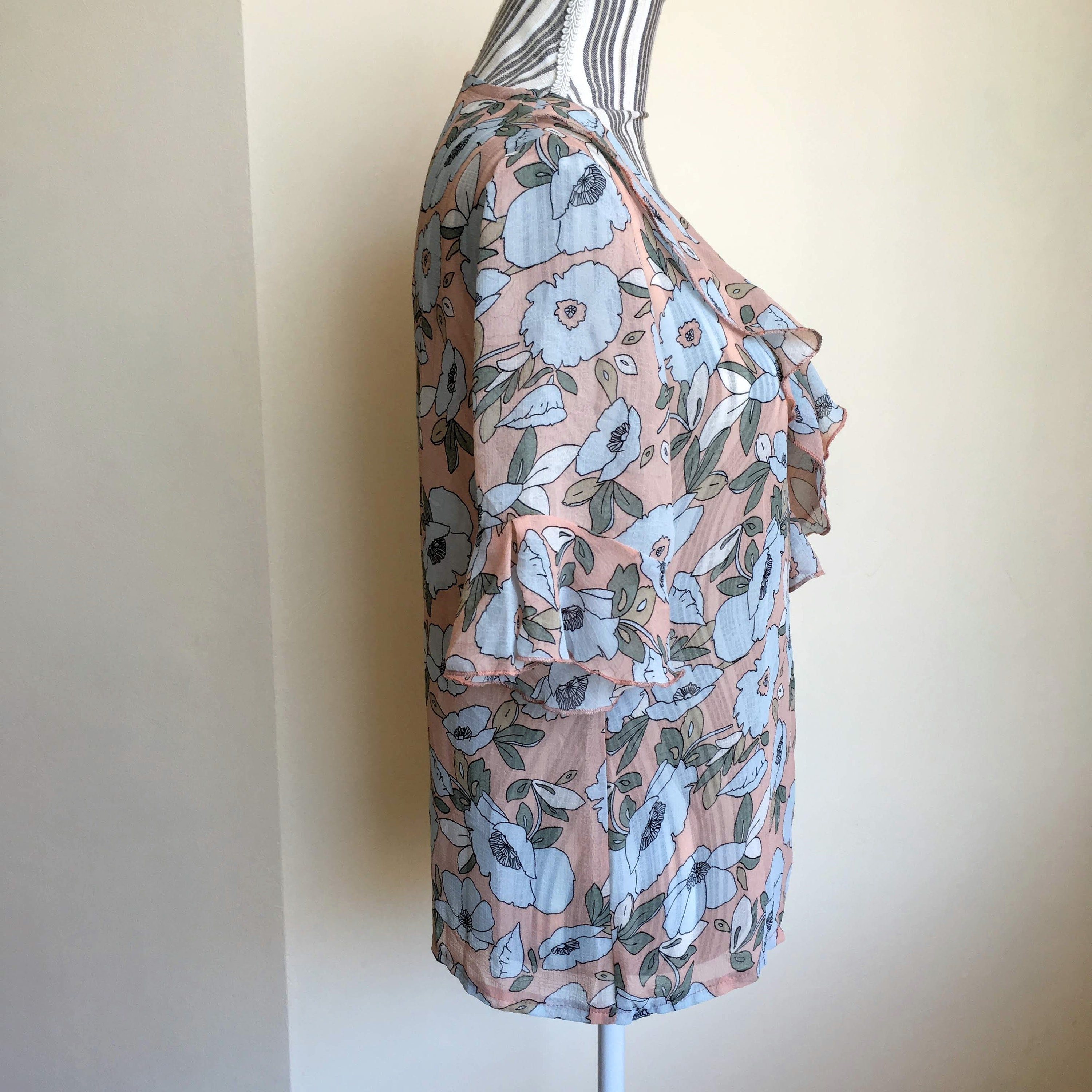 This is a sheer floral top with ruffled neck and sleeves, made of see through light and breathable polyester fabric. The size marked on the label is L, but it feels more like S or M