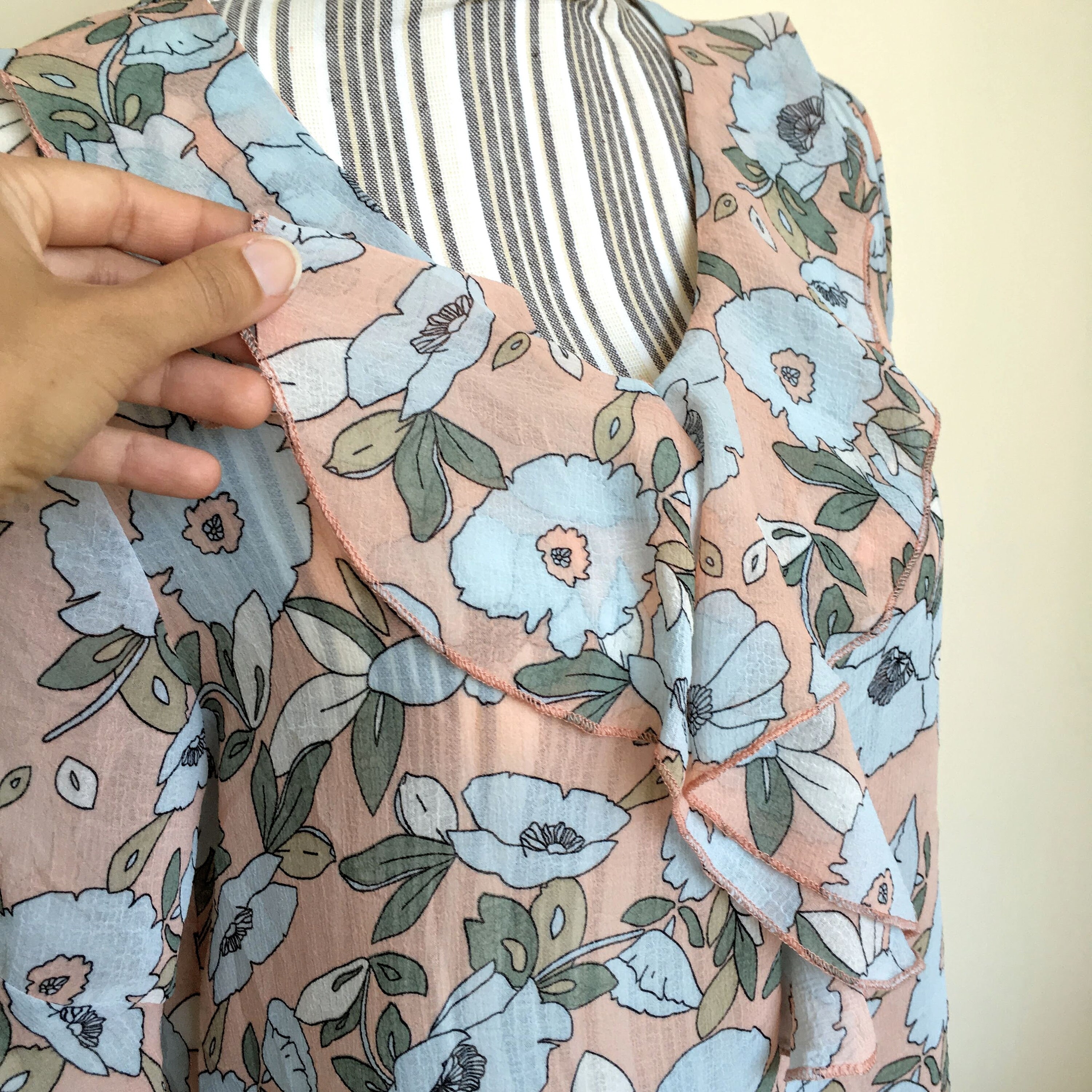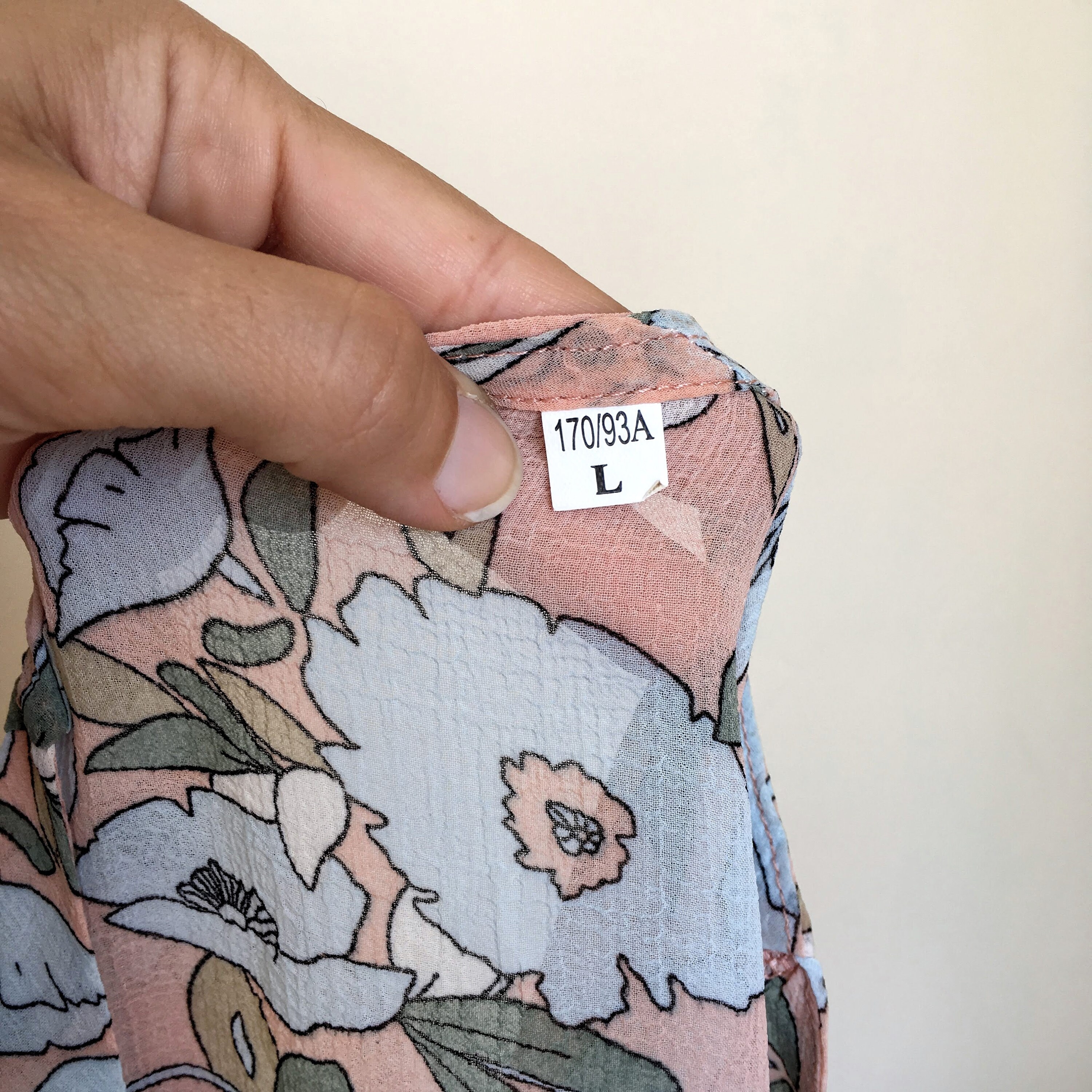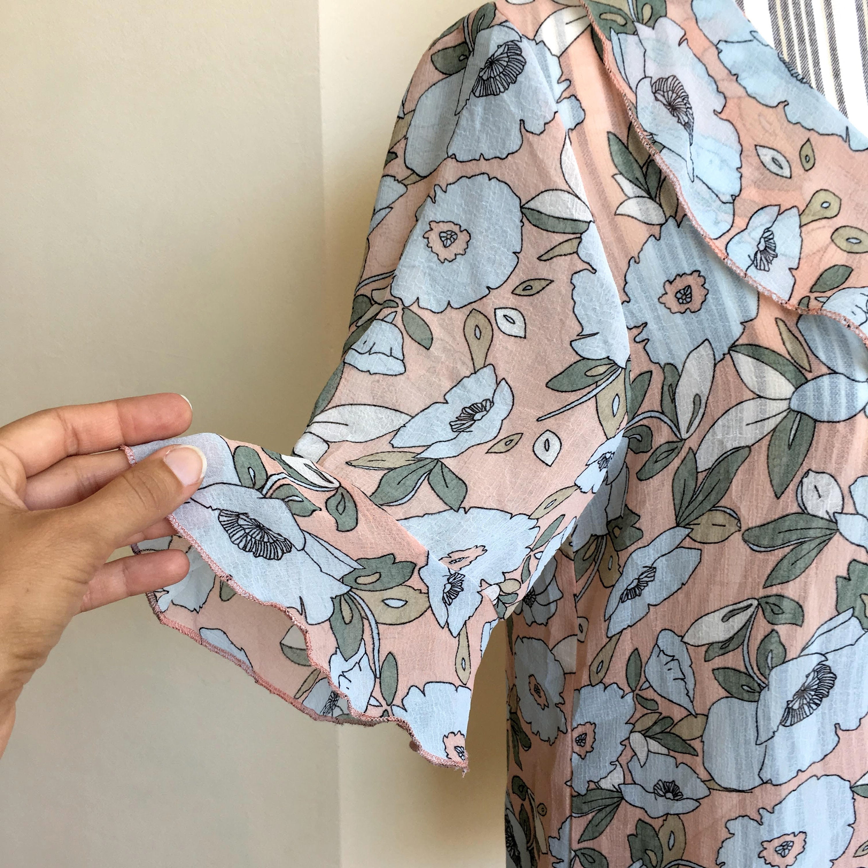 This is a sheer floral top with ruffled neck and sleeves, made of see through light and breathable polyester fabric. The size marked on the label is L, but it feels more like S or M