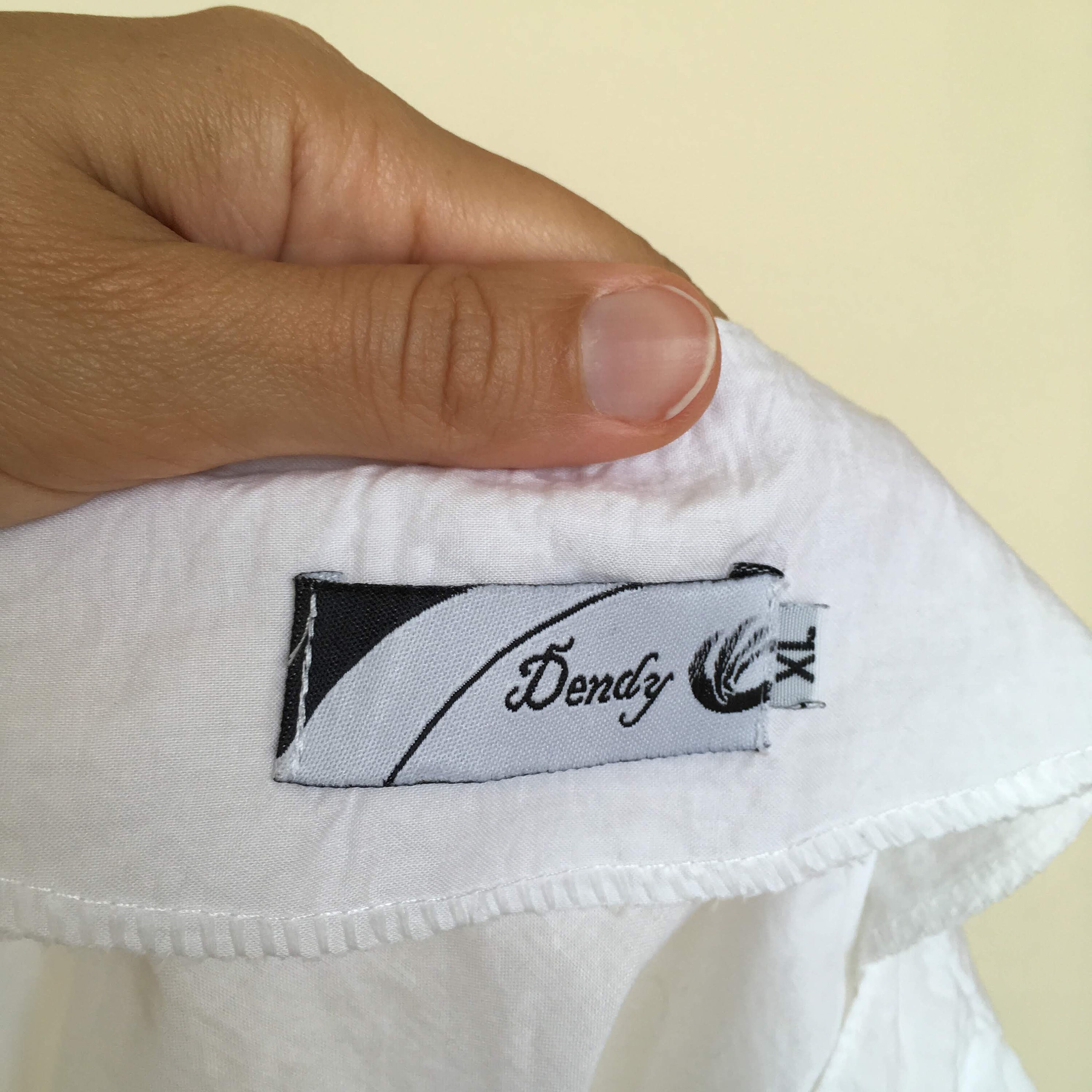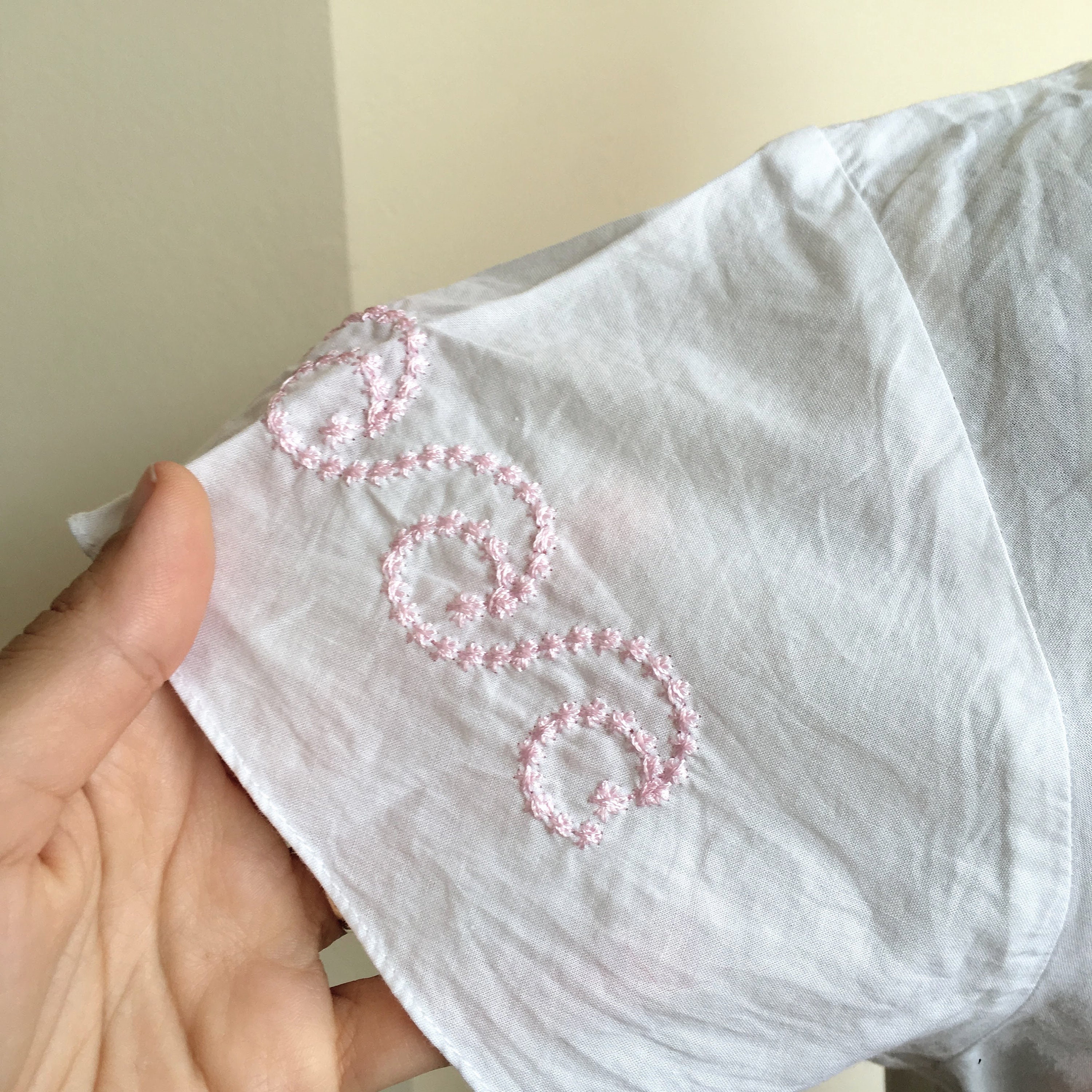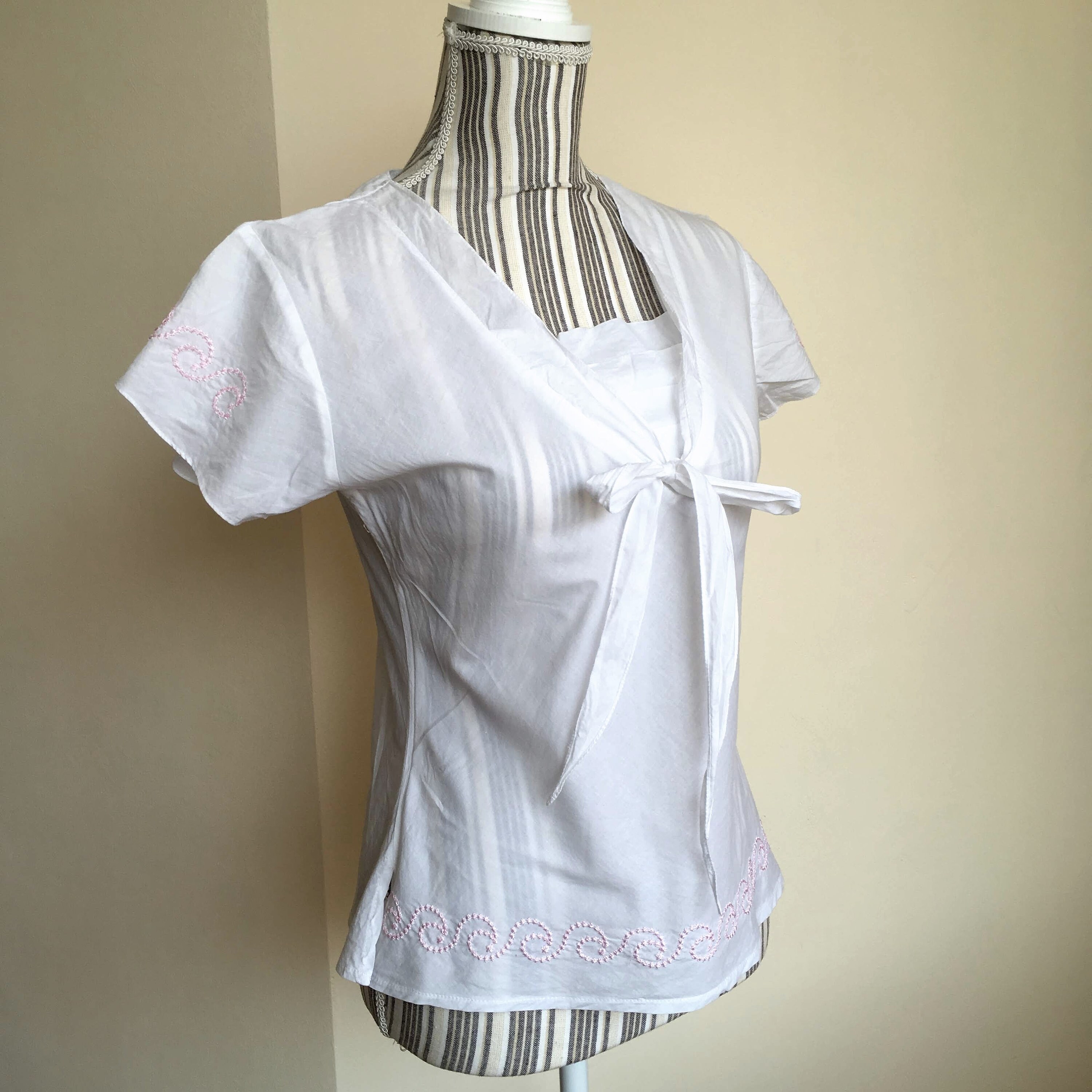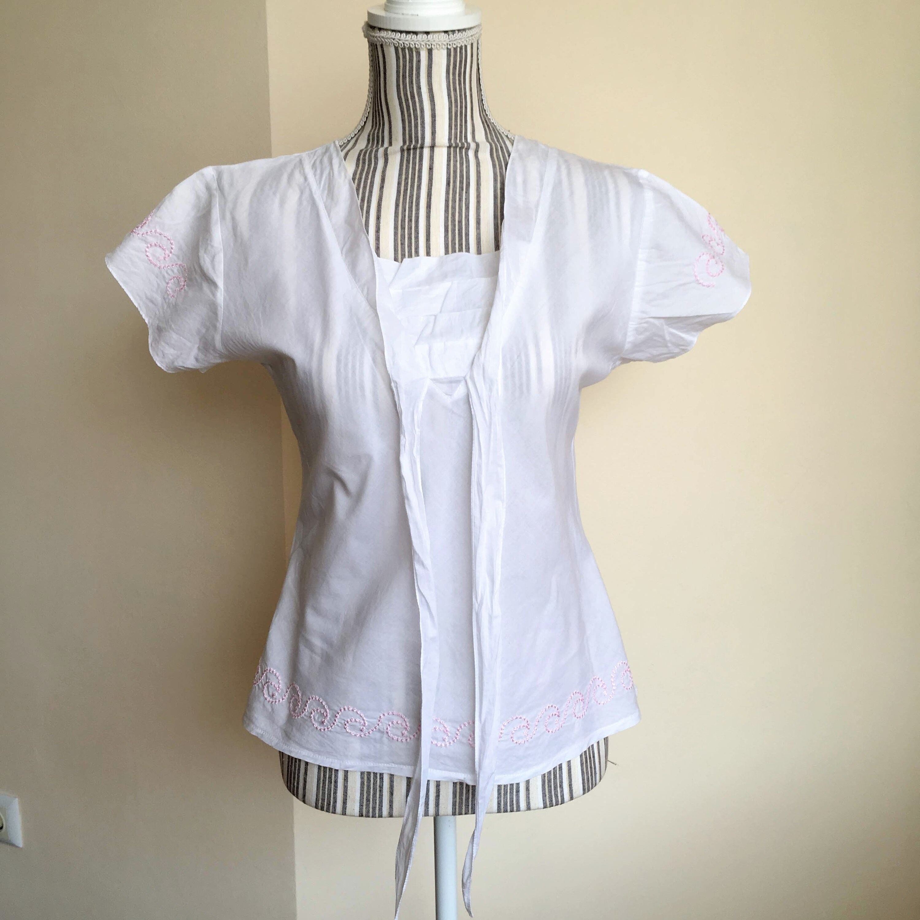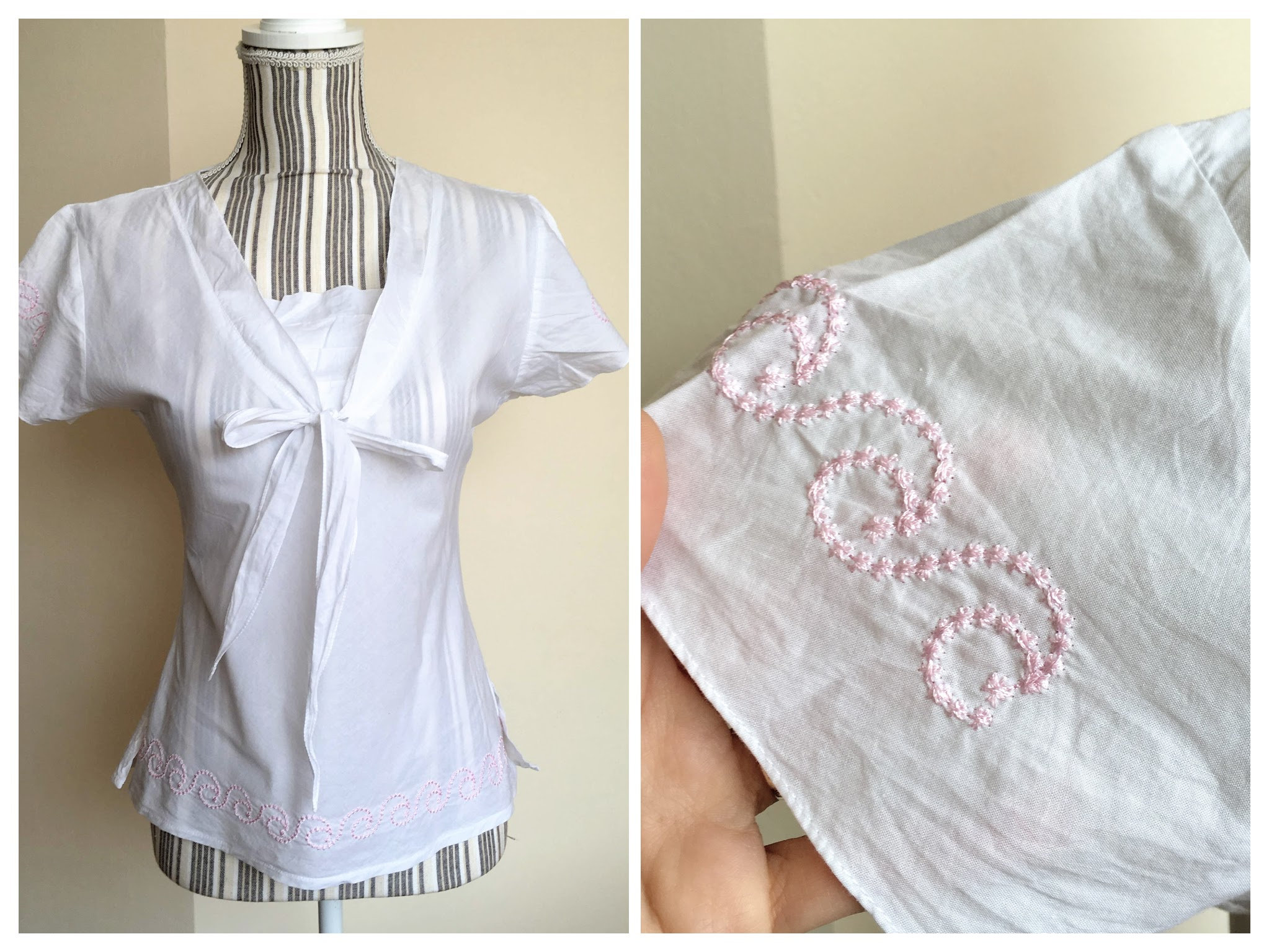 This is a pretty white cotton summer top with geometric embroidery detailing at the hem and the sleeves. This bow tie shirt fits like size small, US 6, EUR 36, although the size marked on the label is XL.