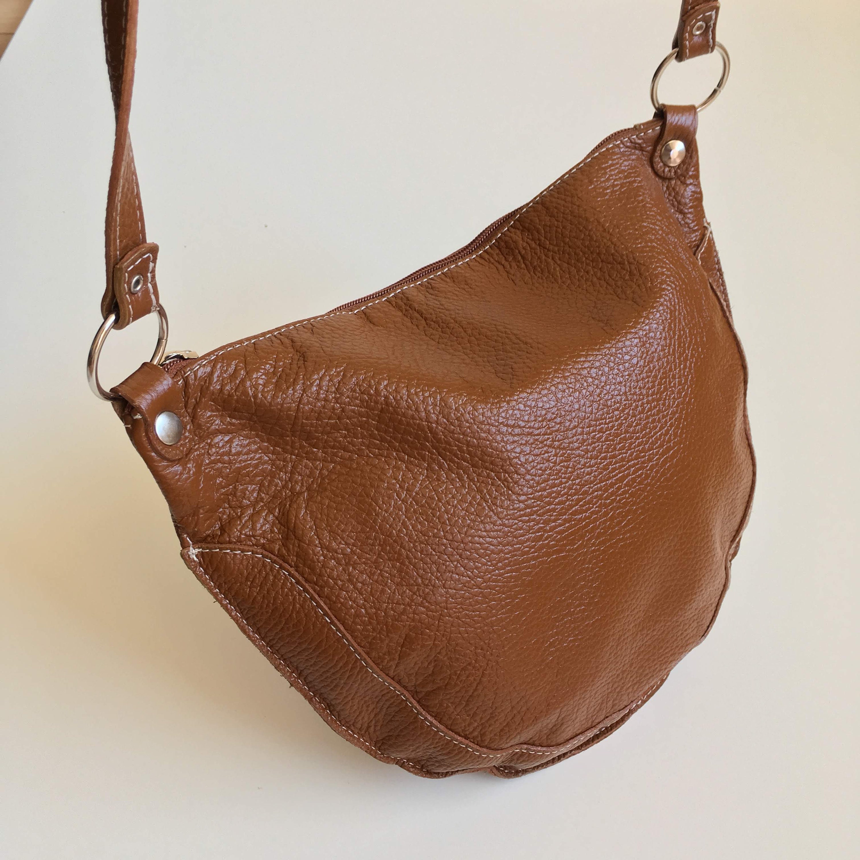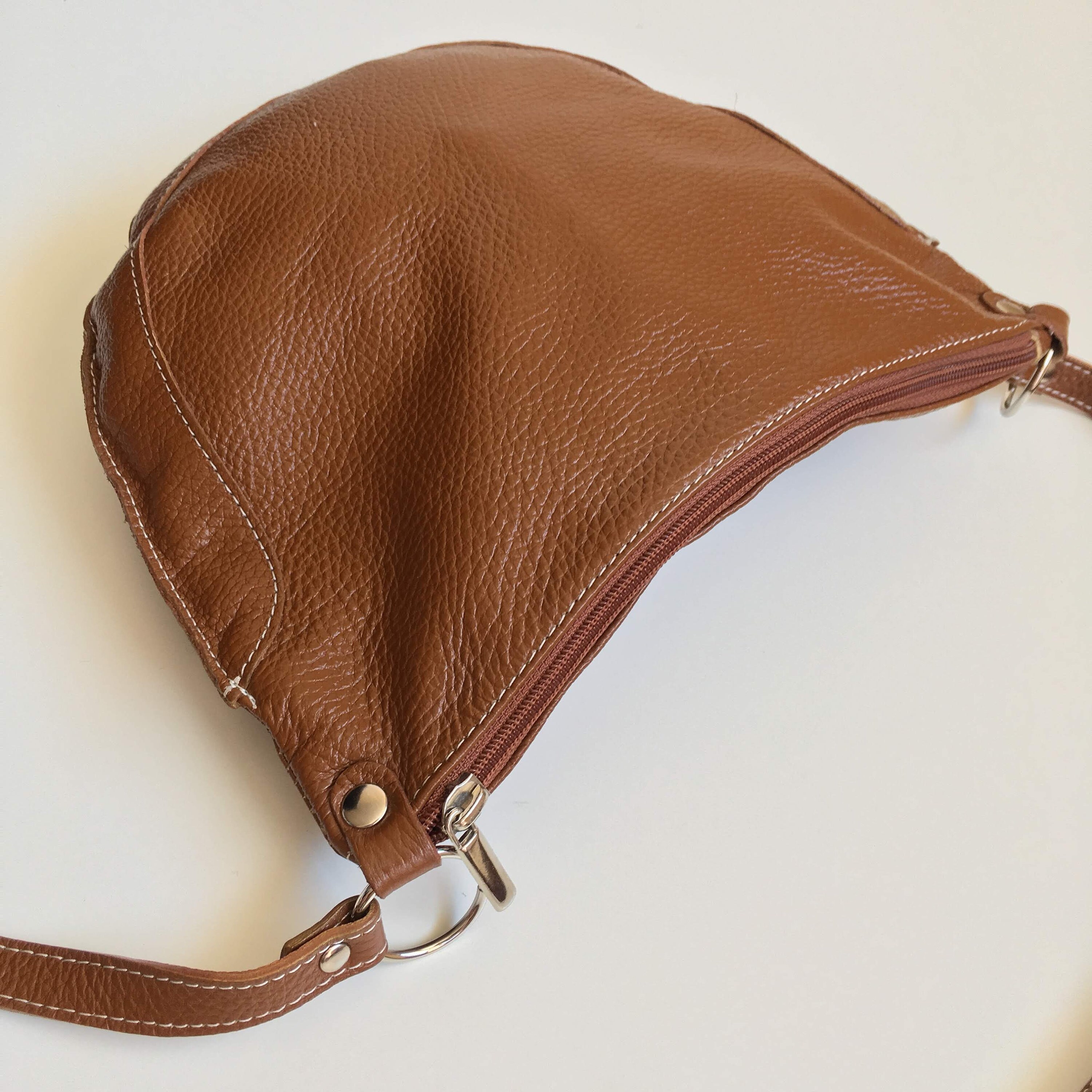 This is a cute boho u shaped vinyl leather shoulder purse with adjustable strap. You can wear this pebbled faux leather purse as a shoulder or a crossbody bag. Perfect to use everyday. It has top zip closure. There is one compartment, one pocket with zip closure and one slip pocket inside. It is very comfy and lightweight.