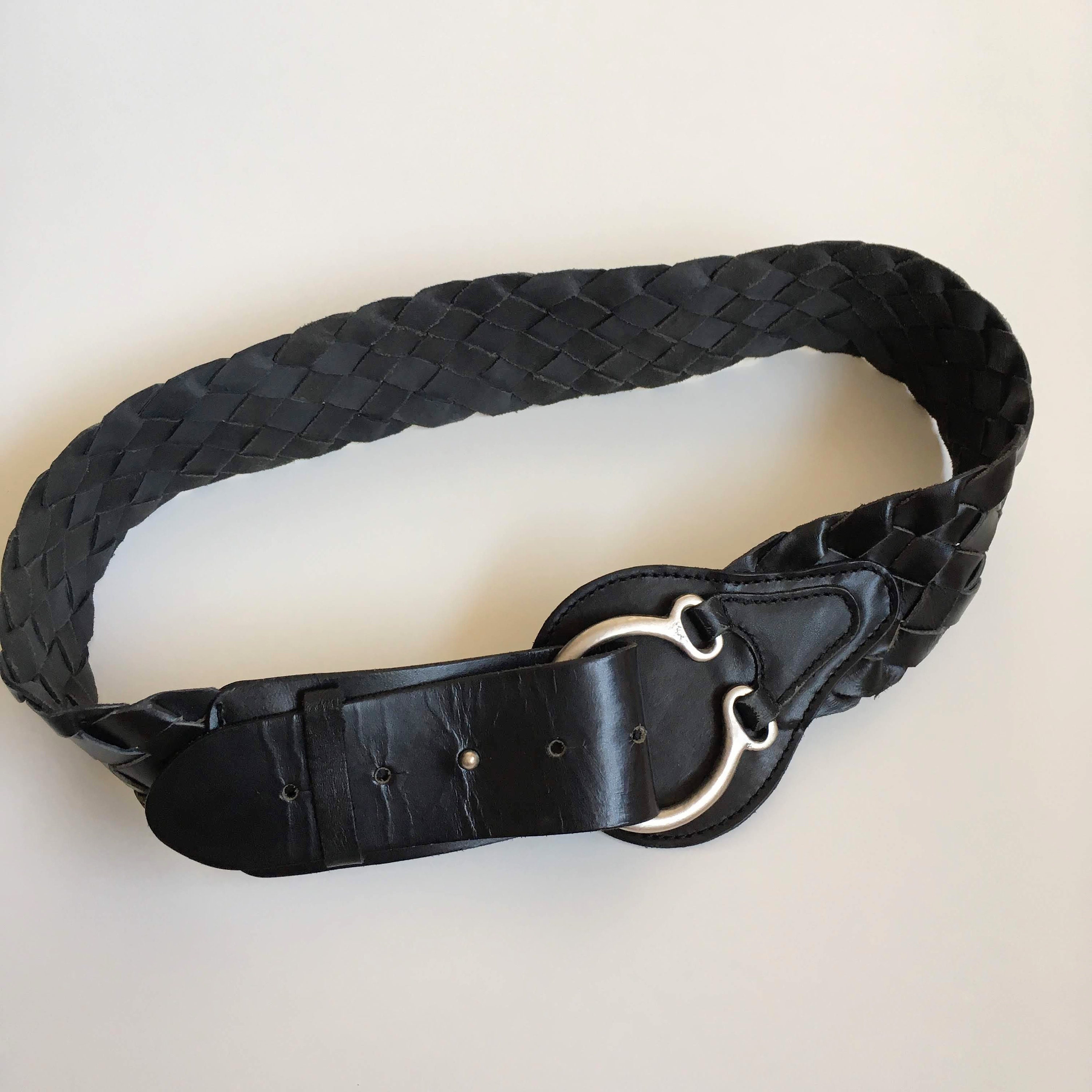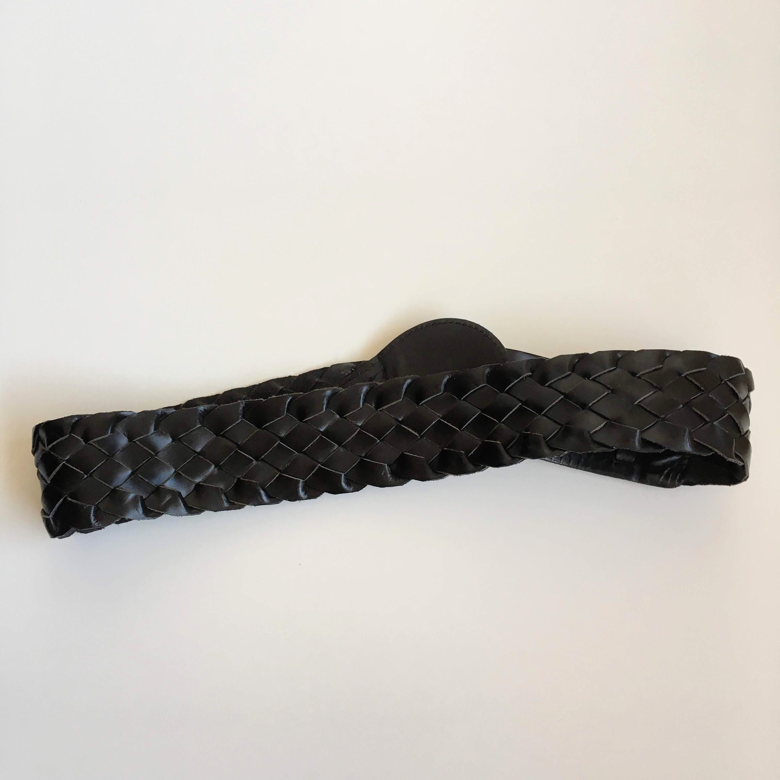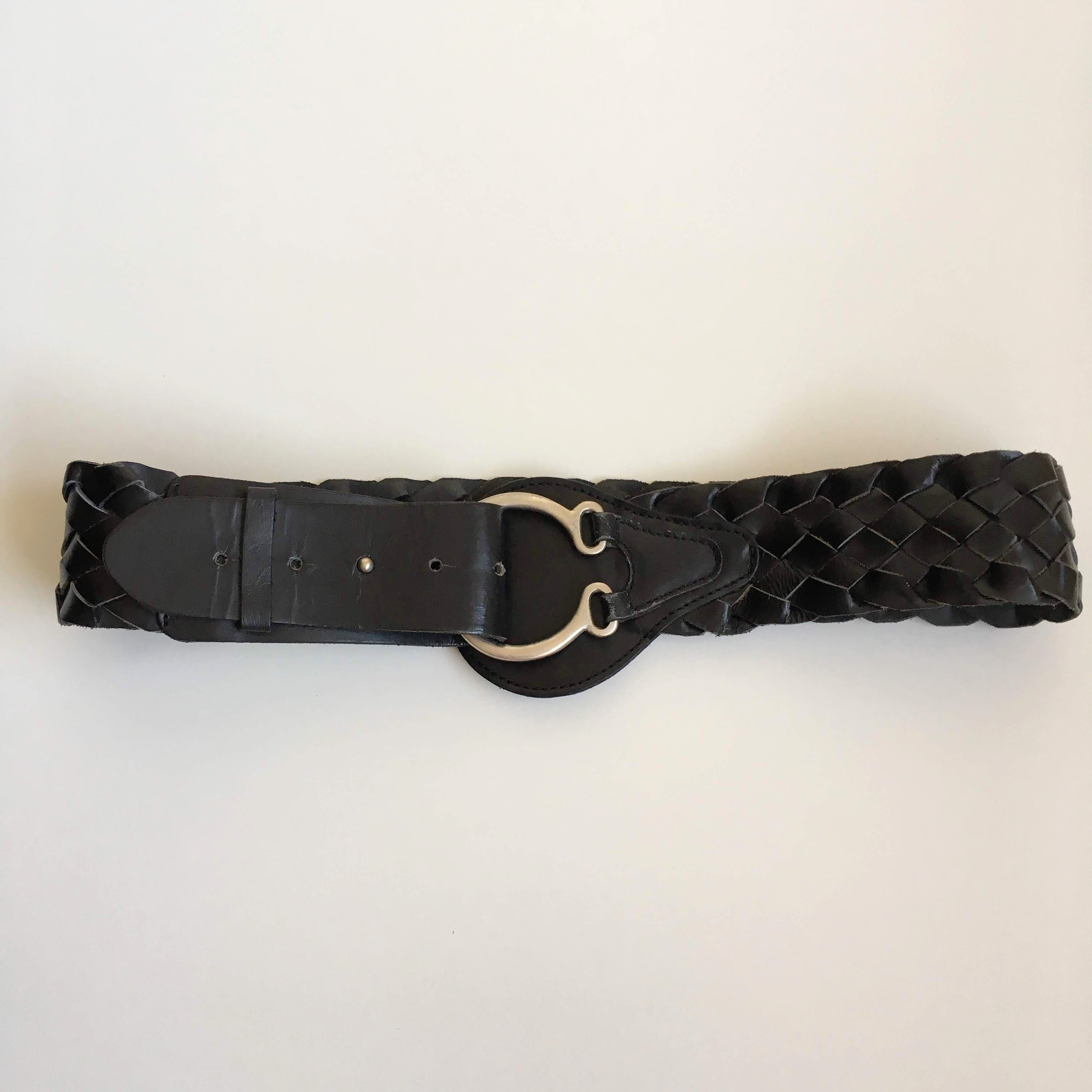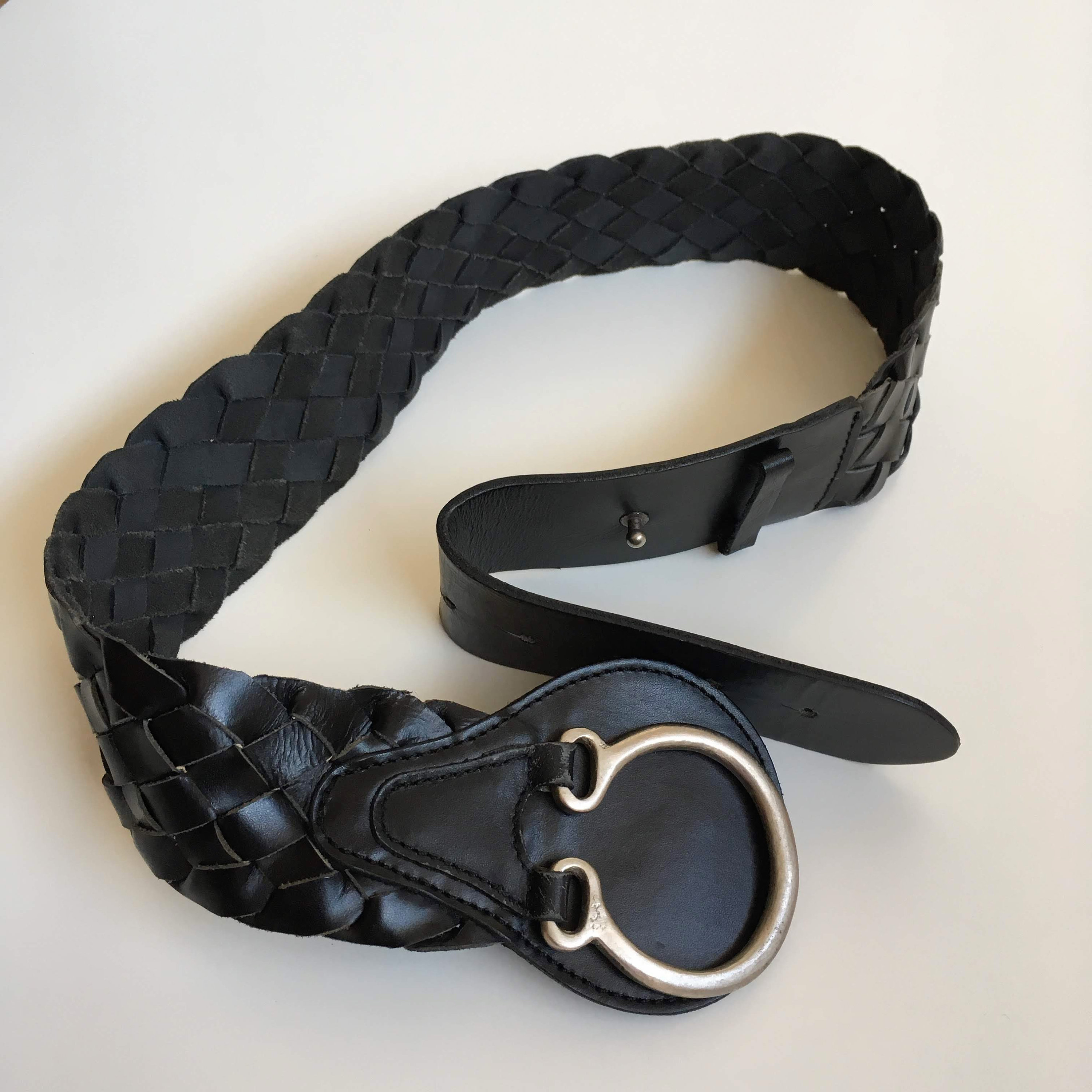 This is a vintage 90s black leather belt for women with silver tone toggle clasp on the front. This natural leather belt is made of woven leather pieces beautifully braided together. This moto belt can adjust from 29.9" / 76 to 32.7" / 83 cm. It is 2.2" / 5.5 cm wide. The size marked on the belt is 85 cm.