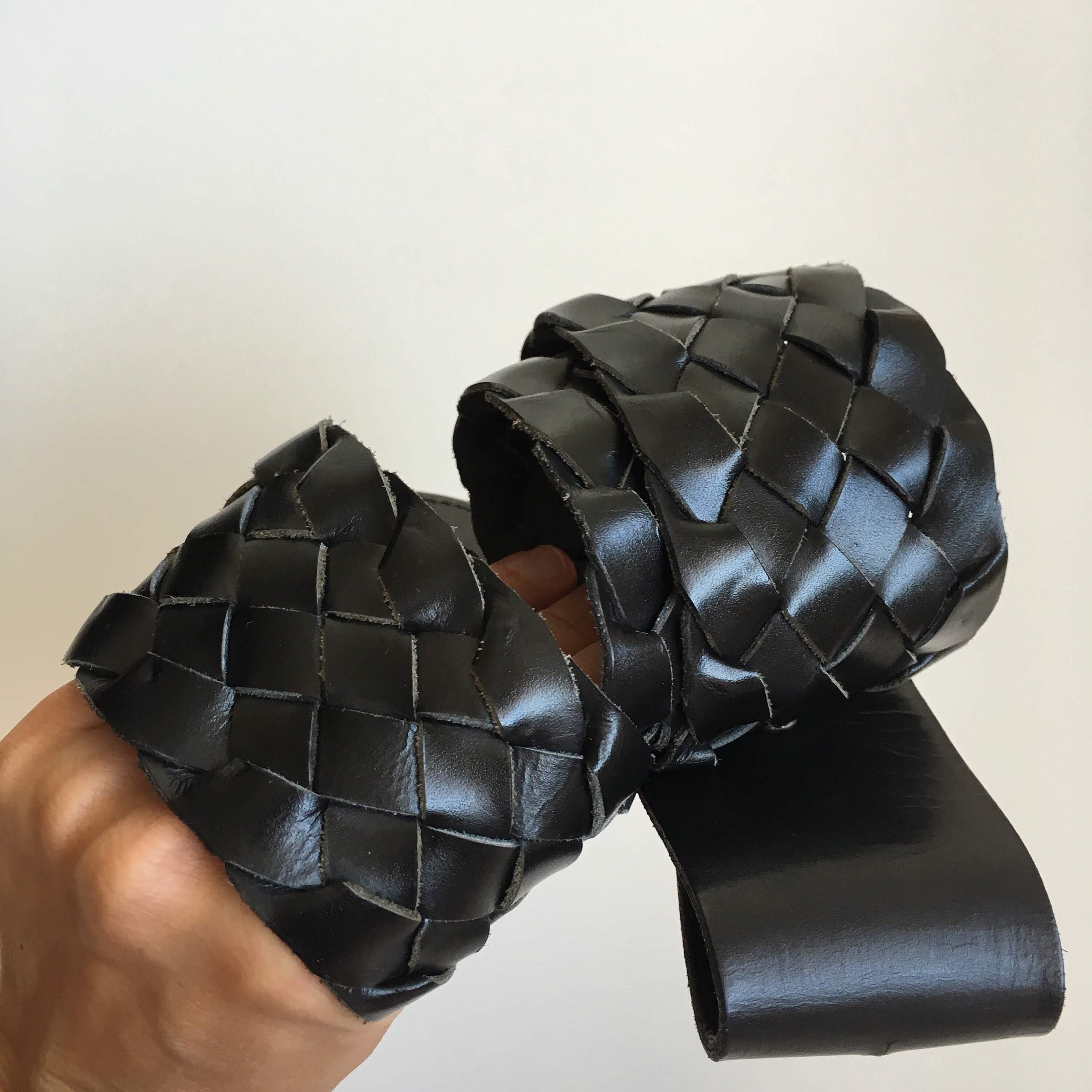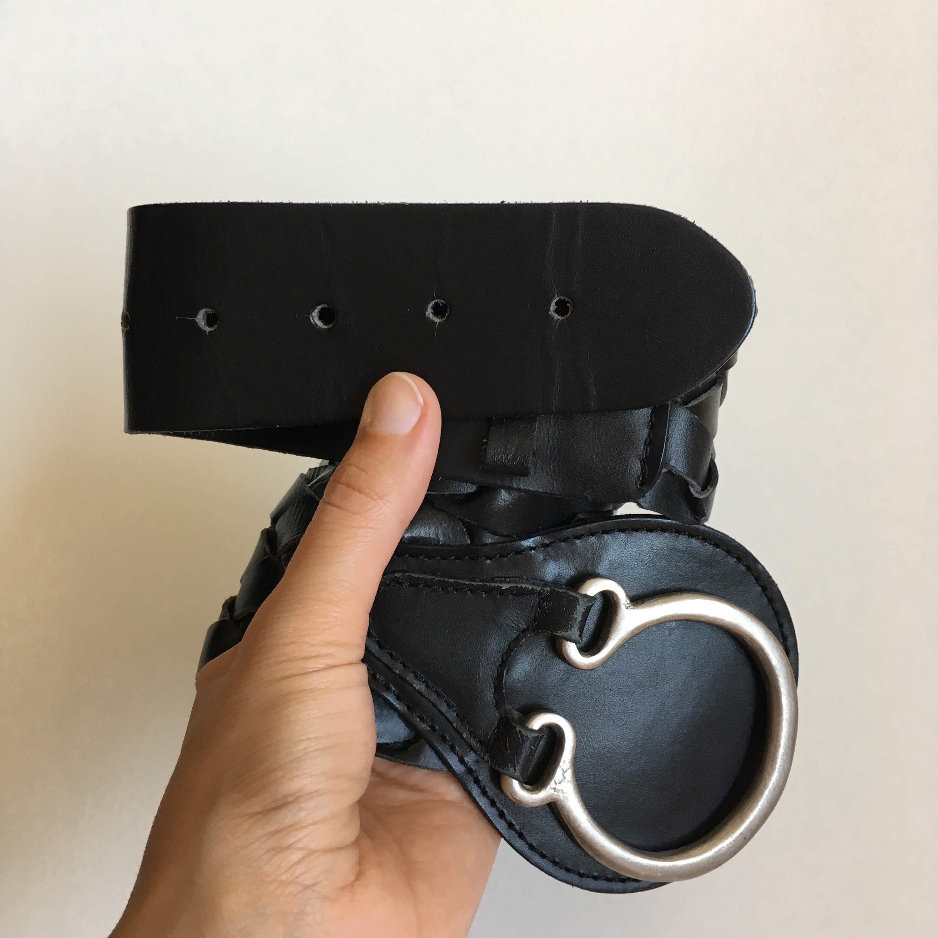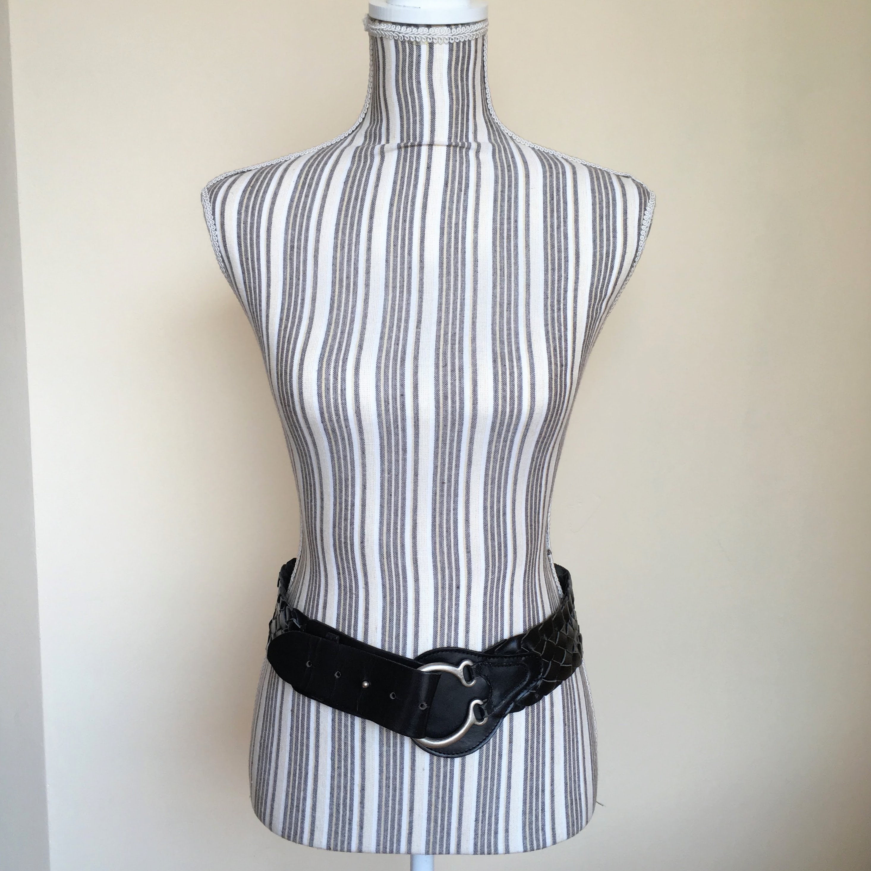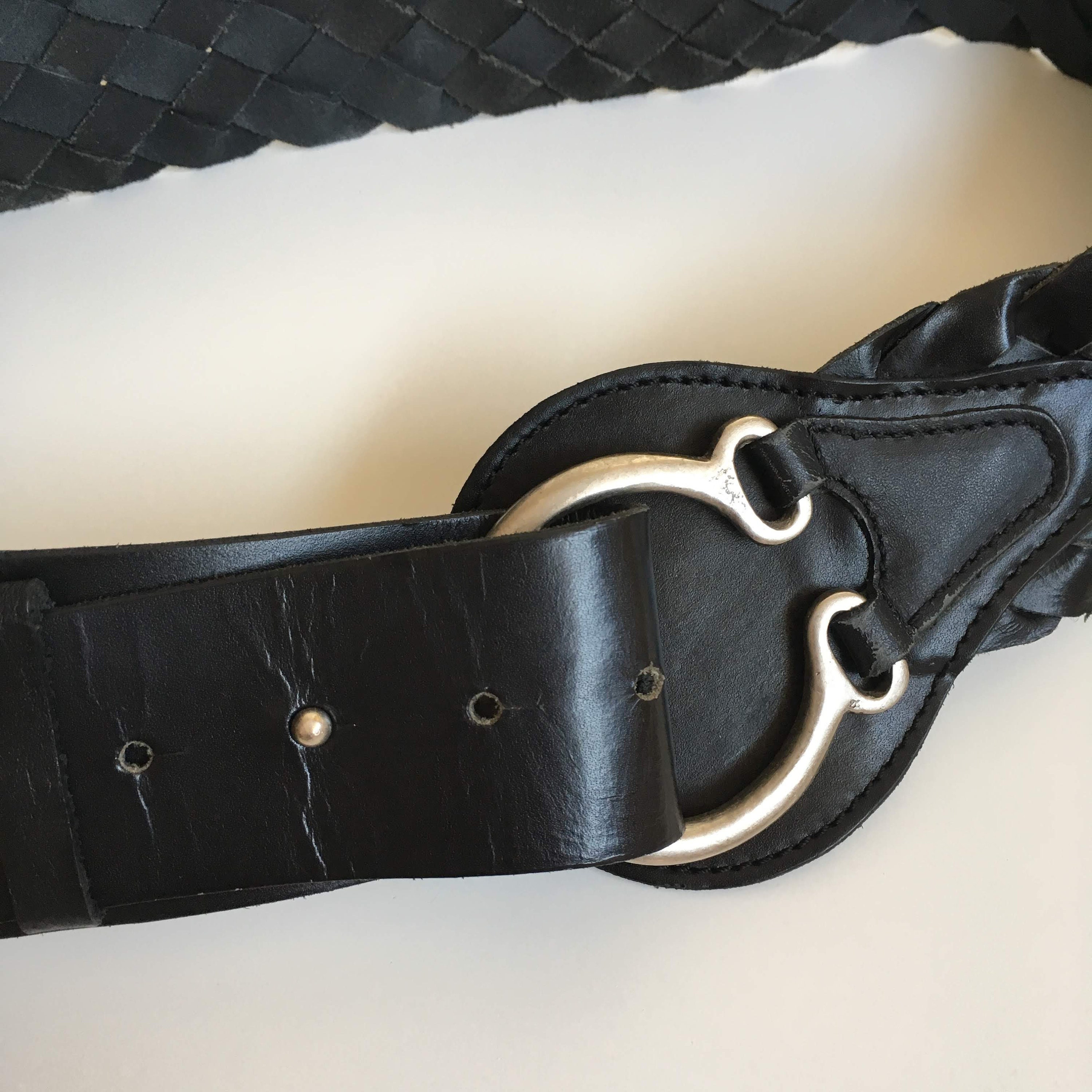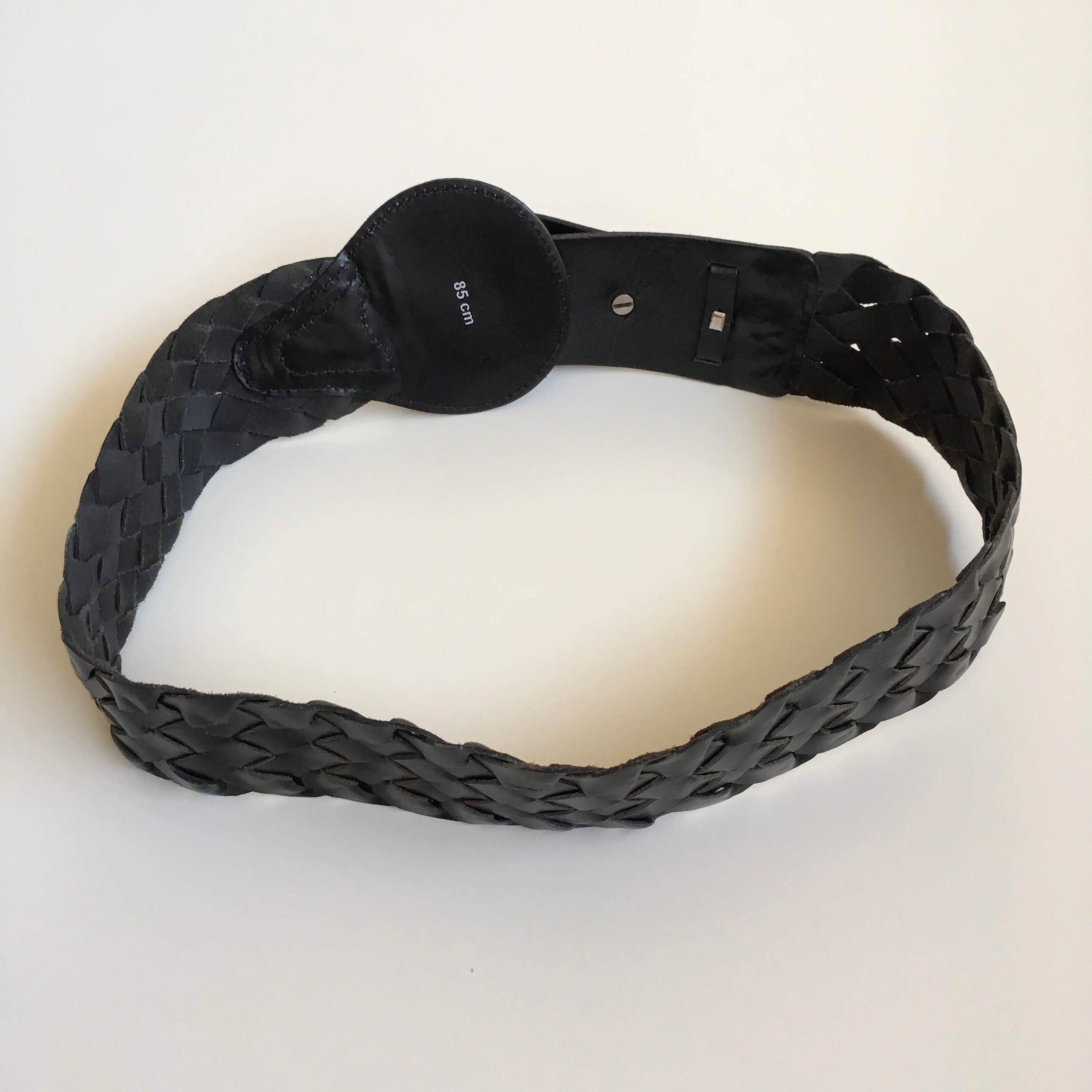 This is a vintage 90s black leather belt for women with silver tone toggle clasp on the front. This natural leather belt is made of woven leather pieces beautifully braided together. This moto belt can adjust from 29.9" / 76 to 32.7" / 83 cm. It is 2.2" / 5.5 cm wide. The size marked on the belt is 85 cm.