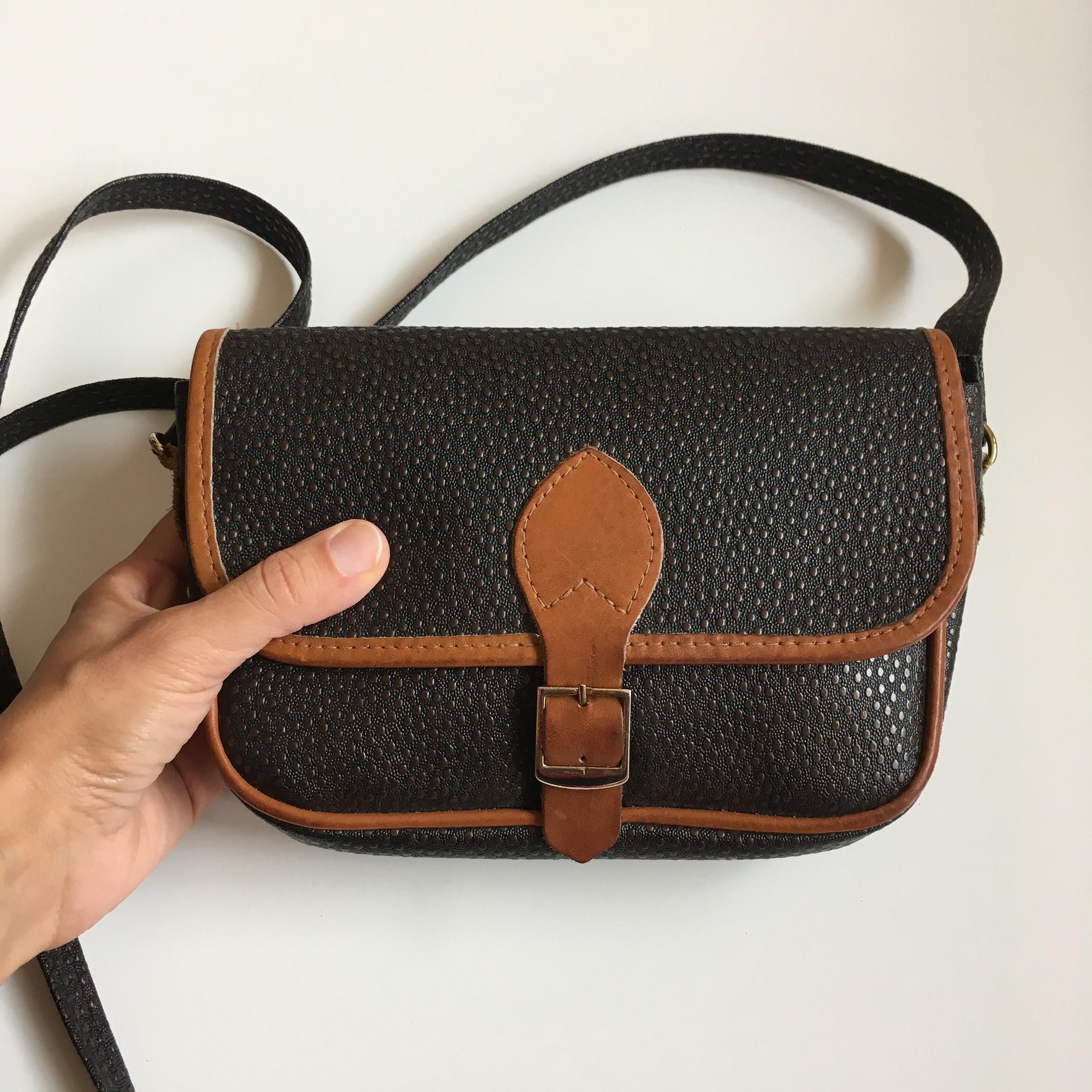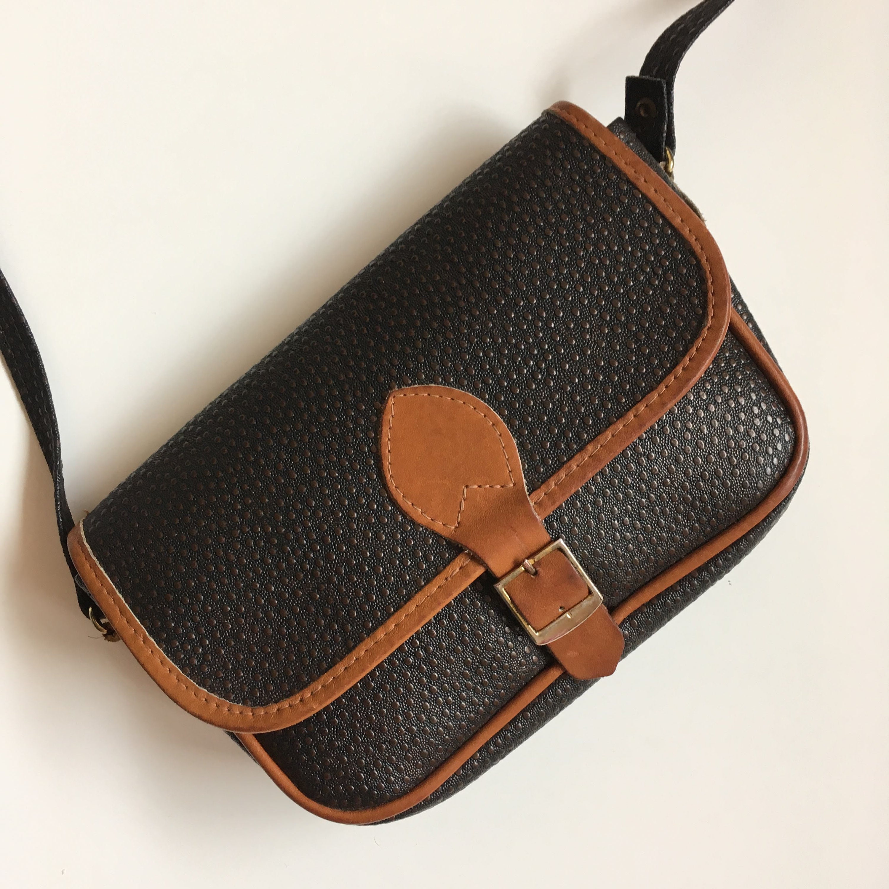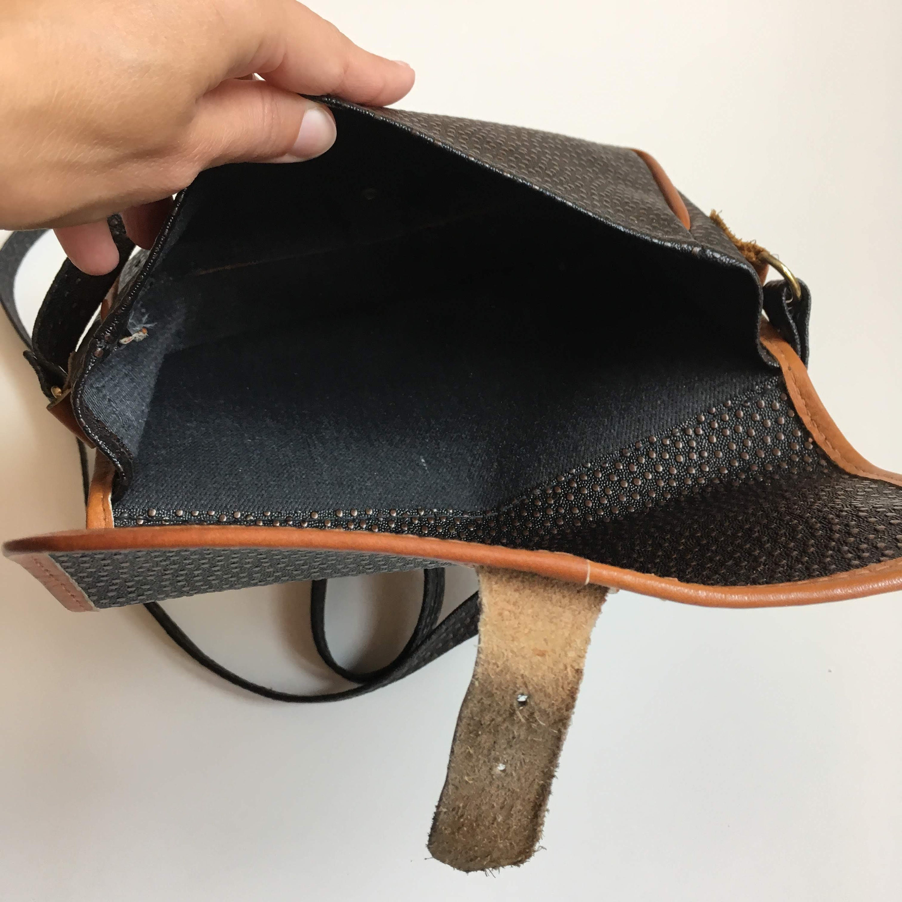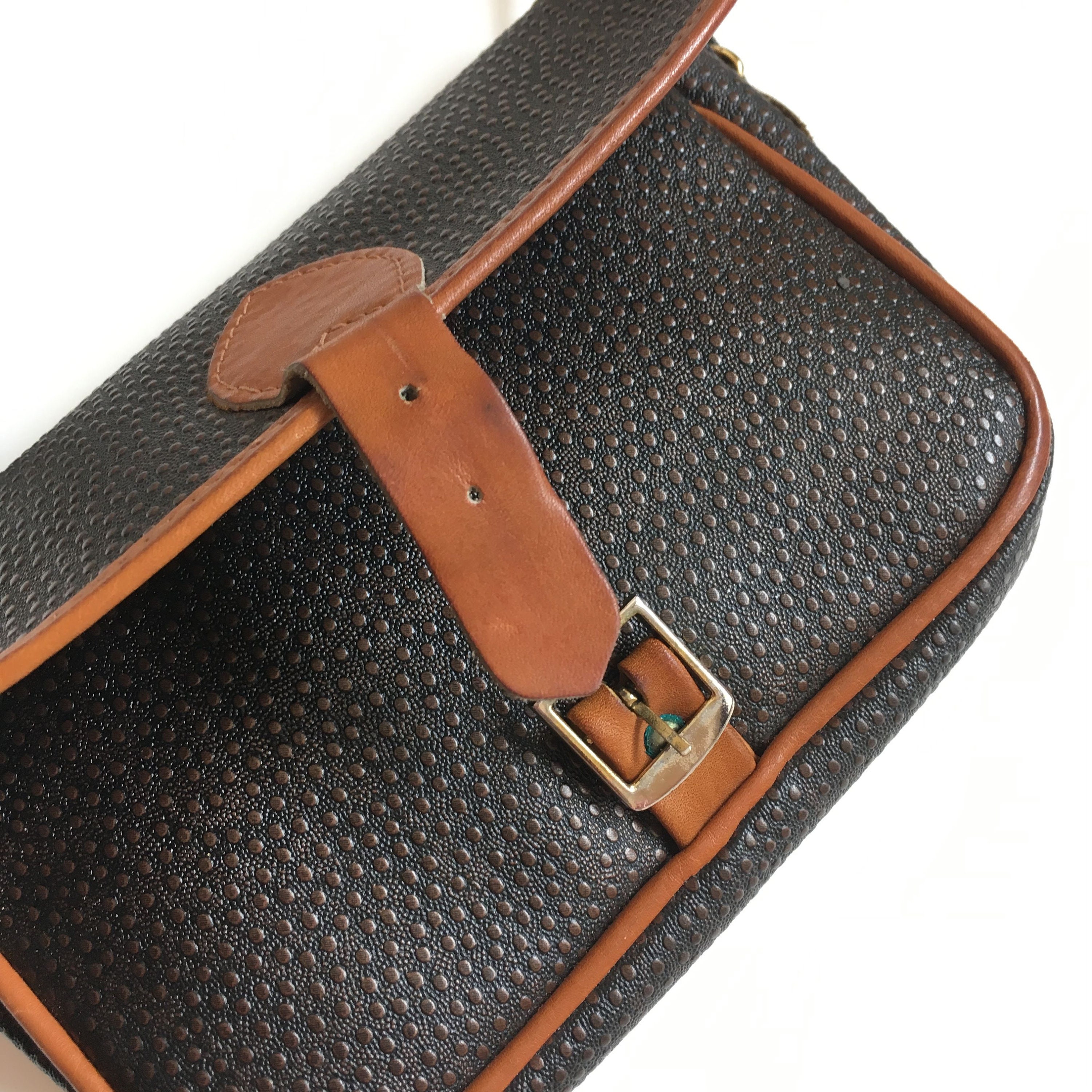 Condition: There is some patina and a few scratches on the metal buckle. Other than that, this small sling bag is in great shape