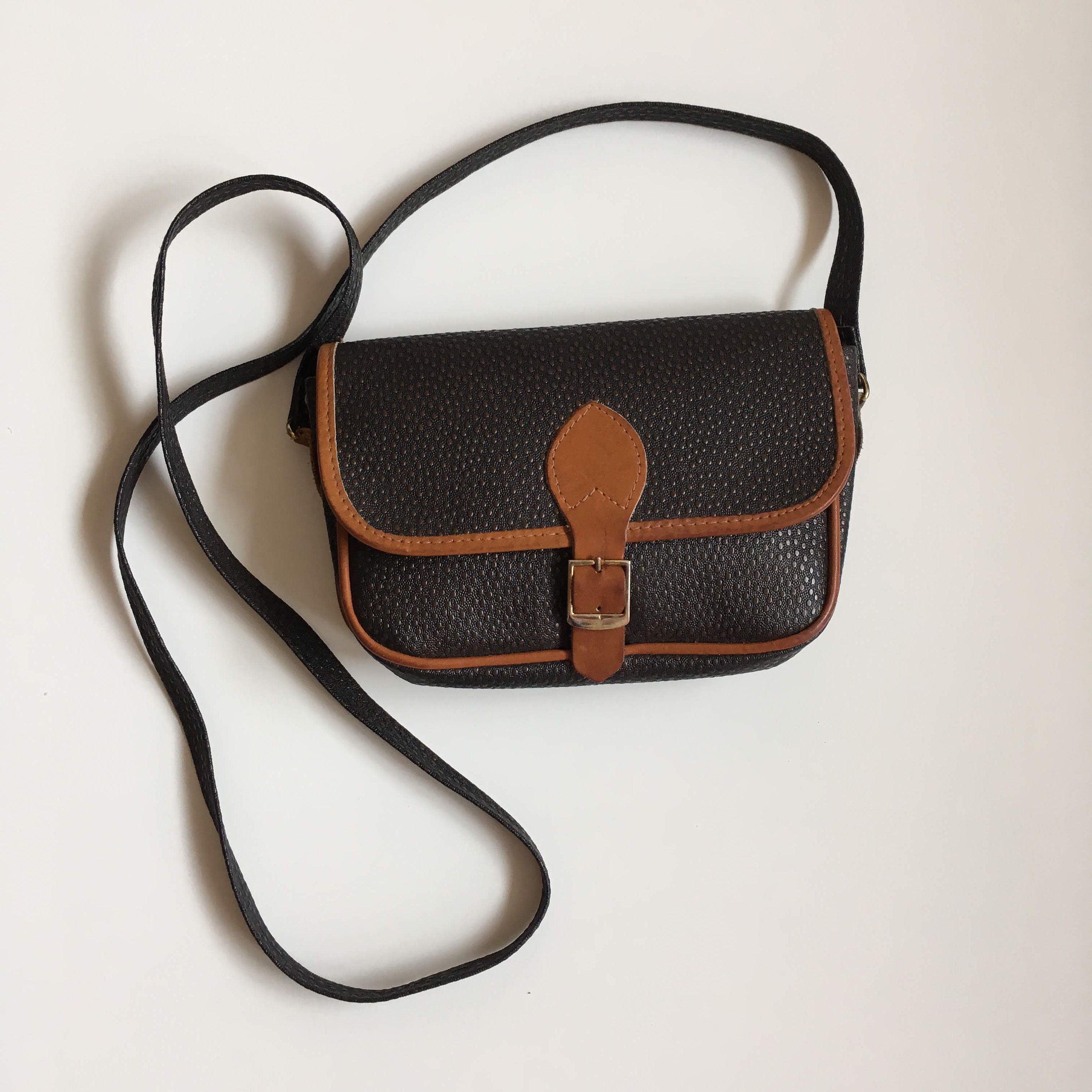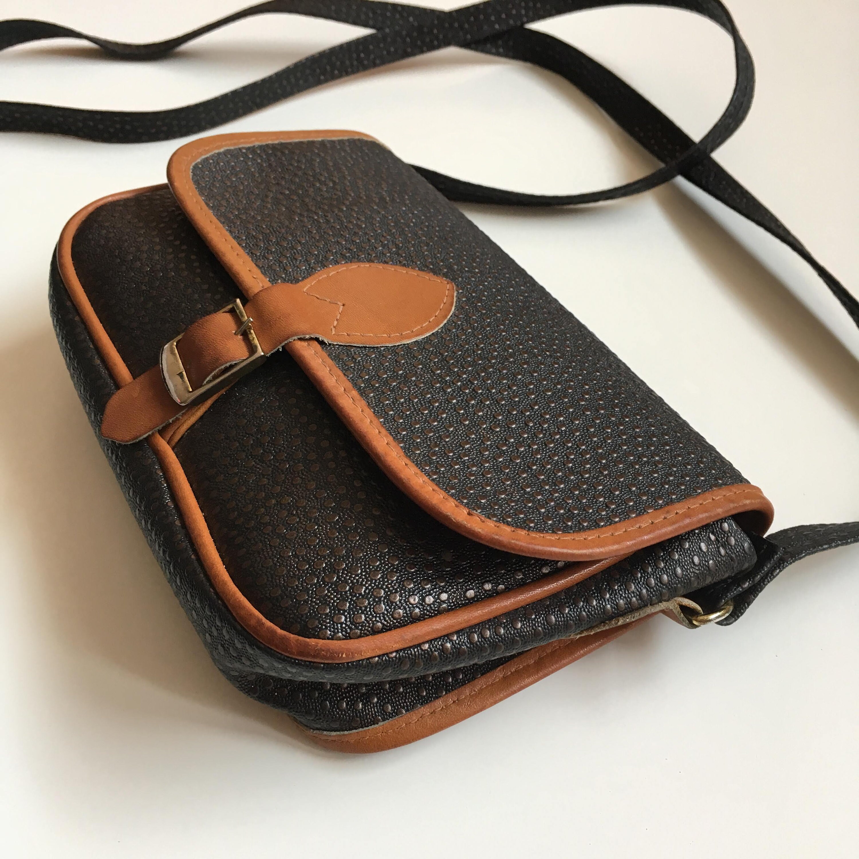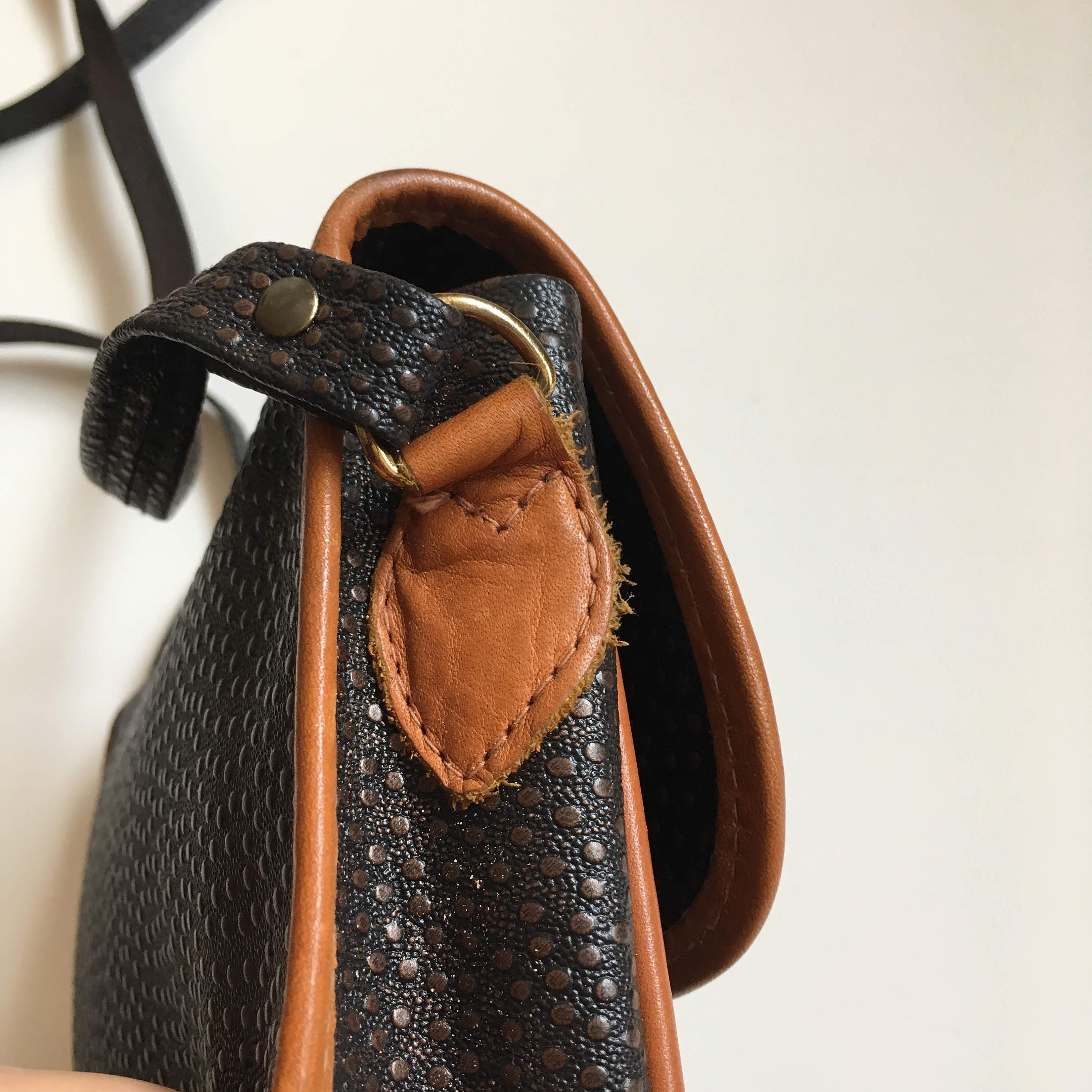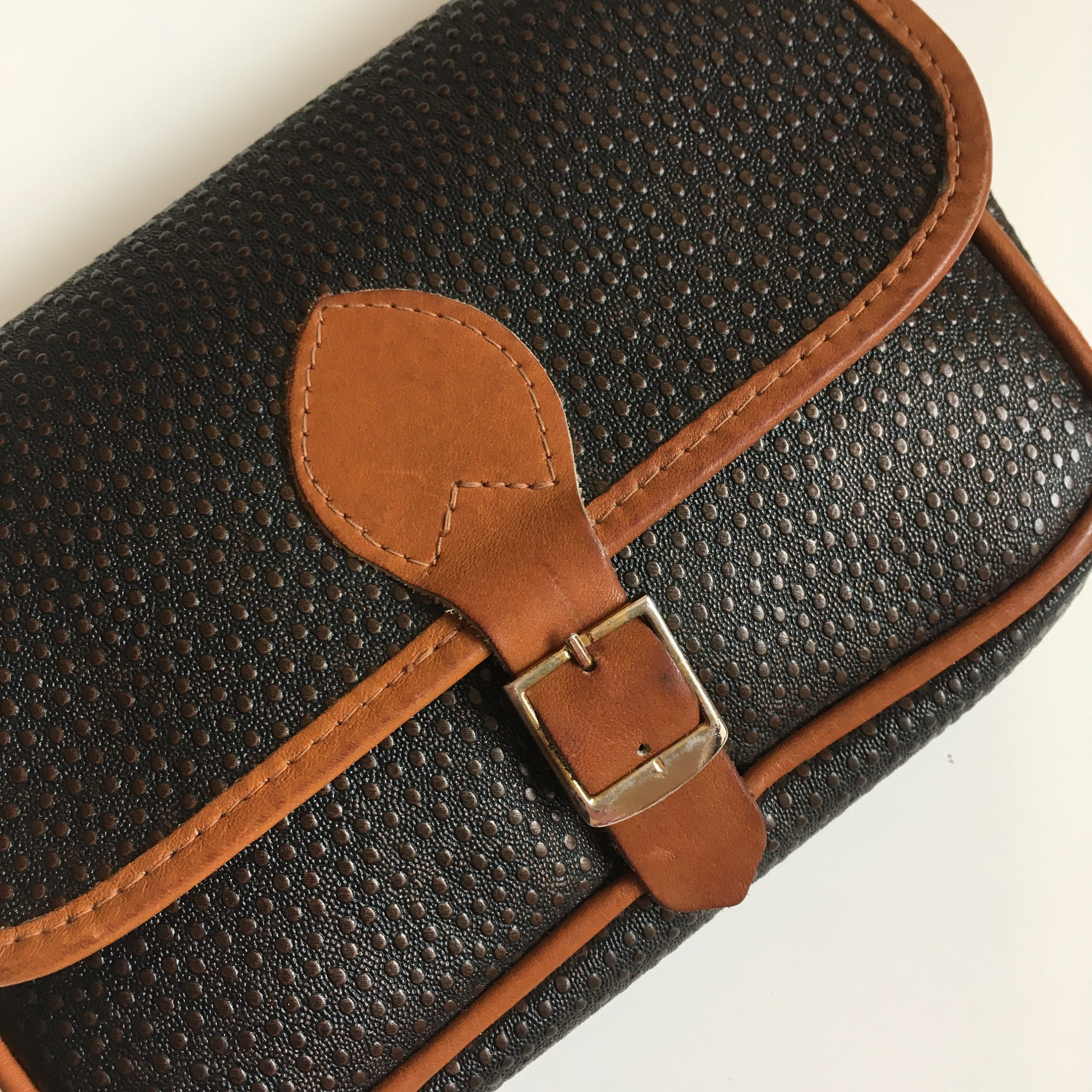 Condition: There is some patina and a few scratches on the metal buckle. Other than that, this small sling bag is in great shape