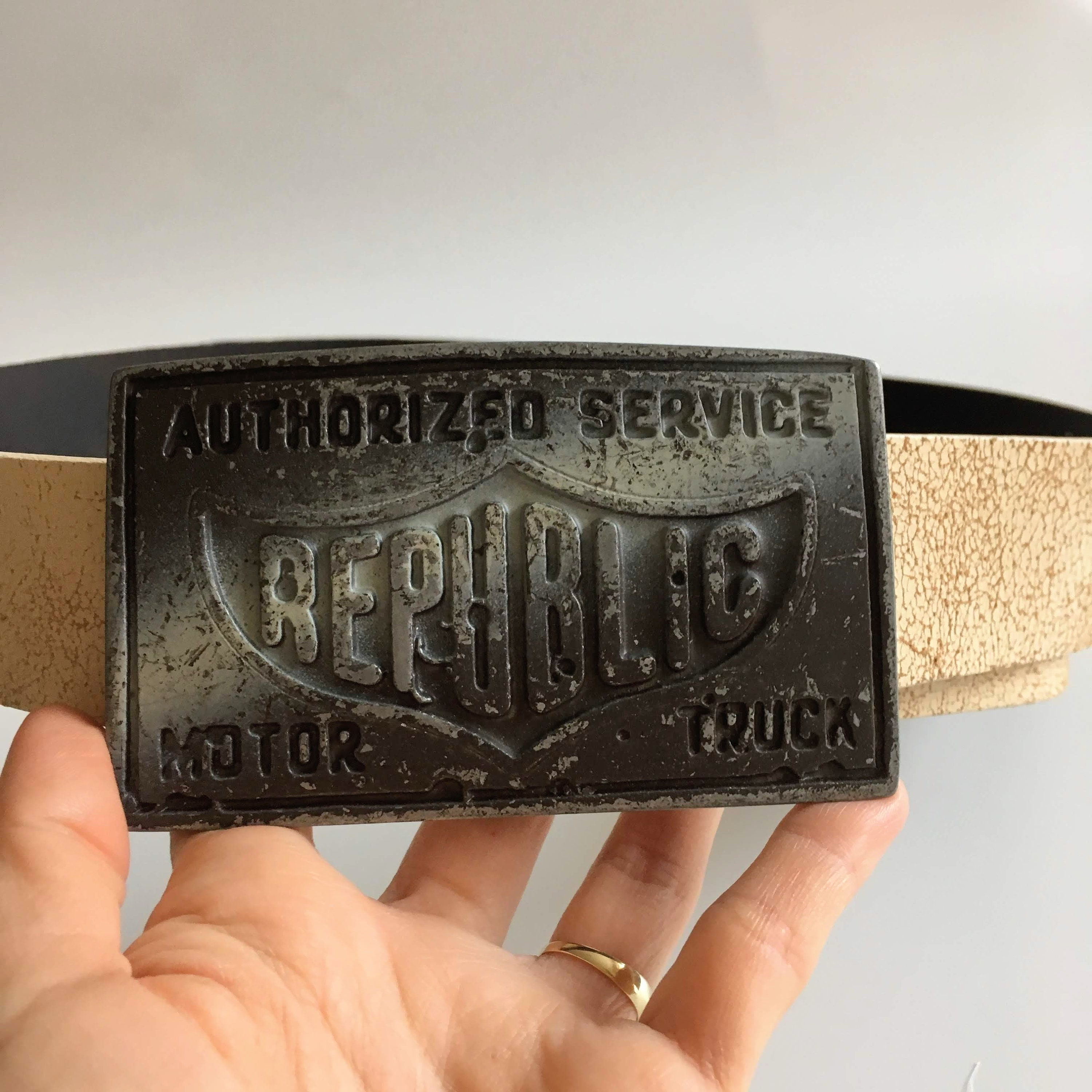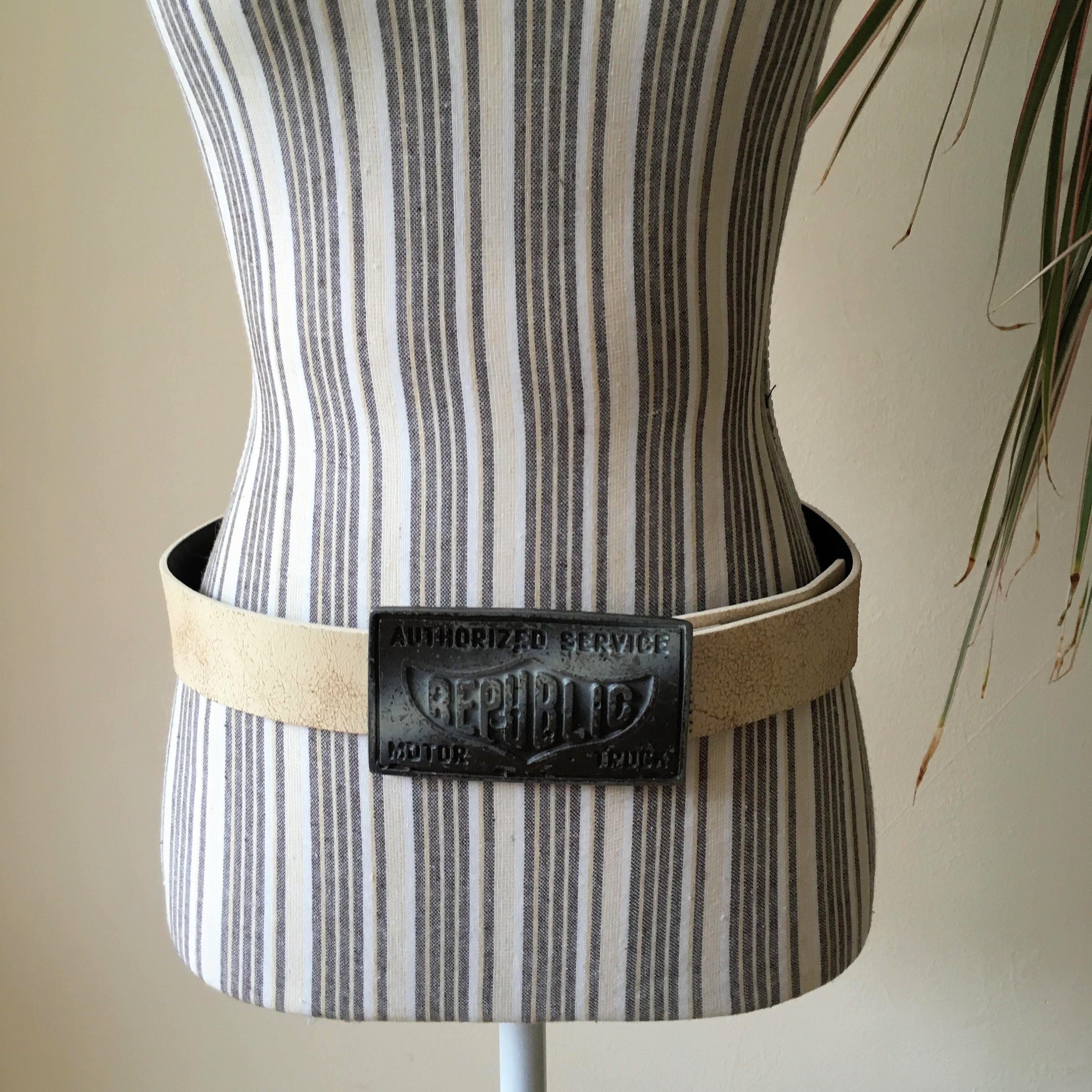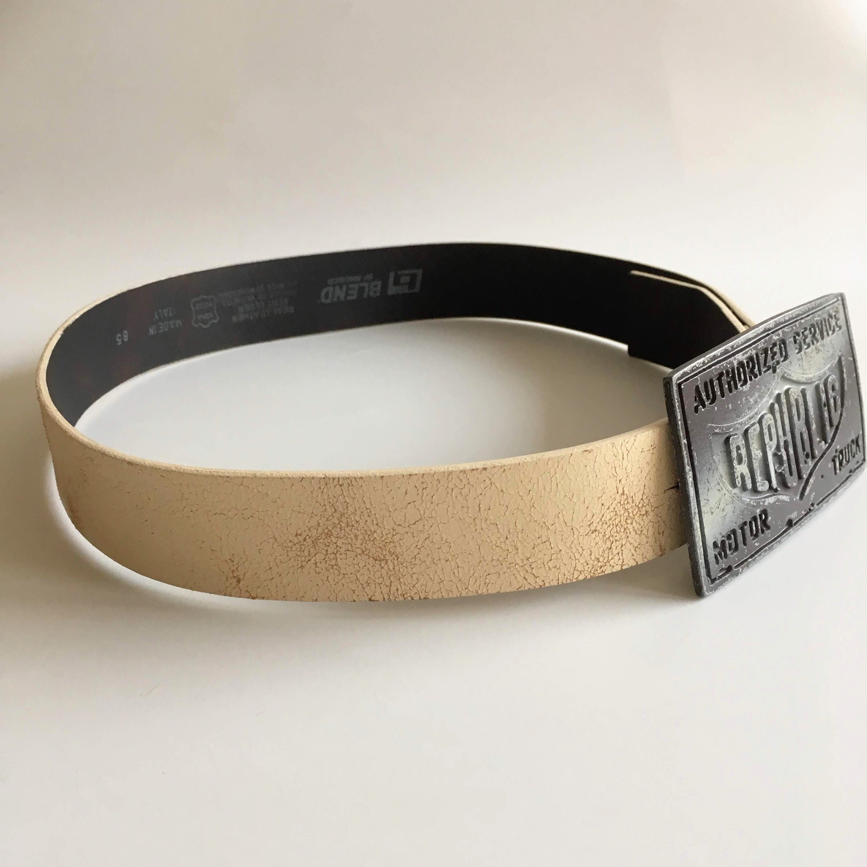 This is a vintage off white cracked leather belt with solid silver tone metal buckle which reads "Authorized Service Republic Motor Truck". This real leather unisex belt is perfect to pair with jeans. The size marked on the belt is 33.5" / 85 cm. It can adjust from 32.3" / 82 cm to 36.2"/92 cm and it is 1.6" /4 cm wide.