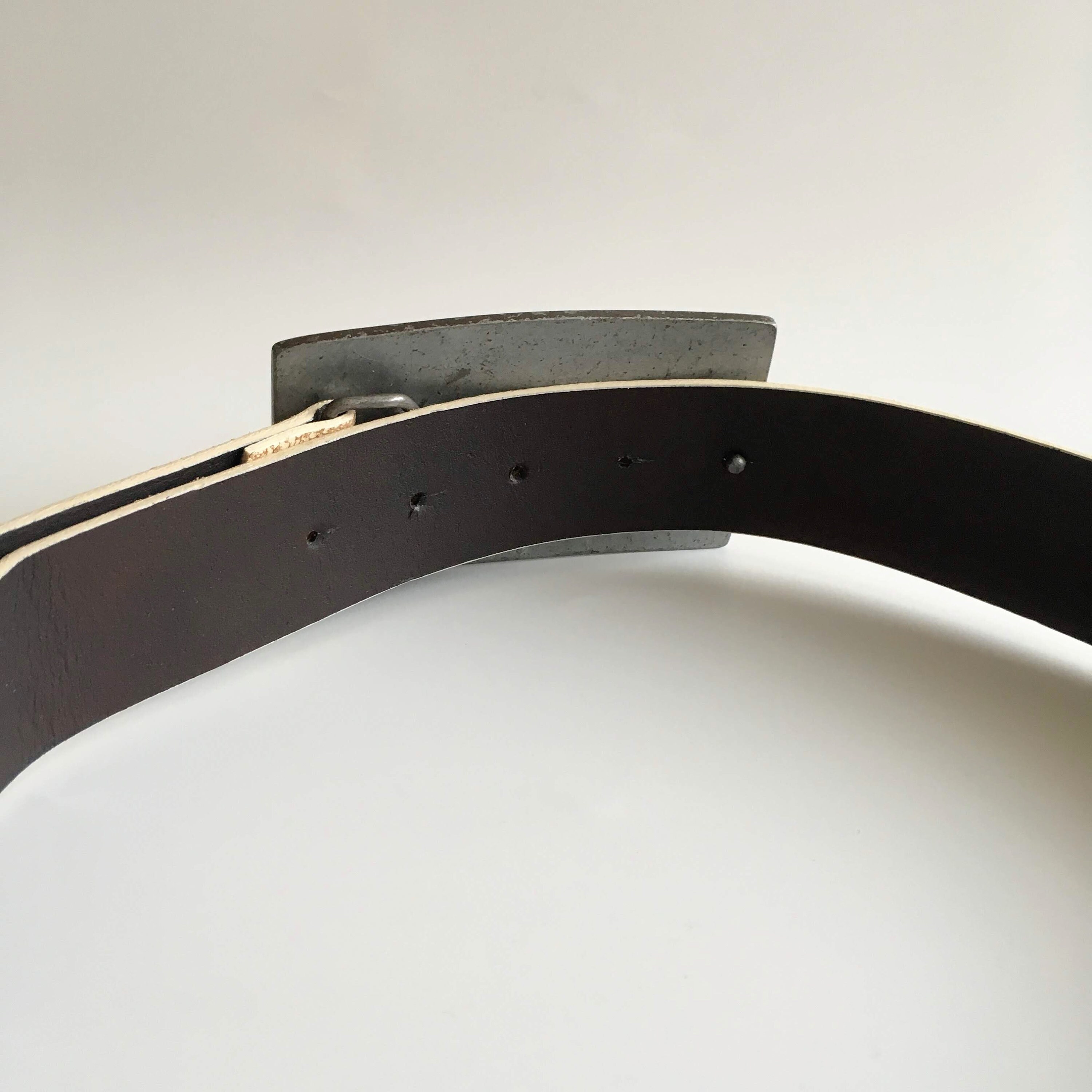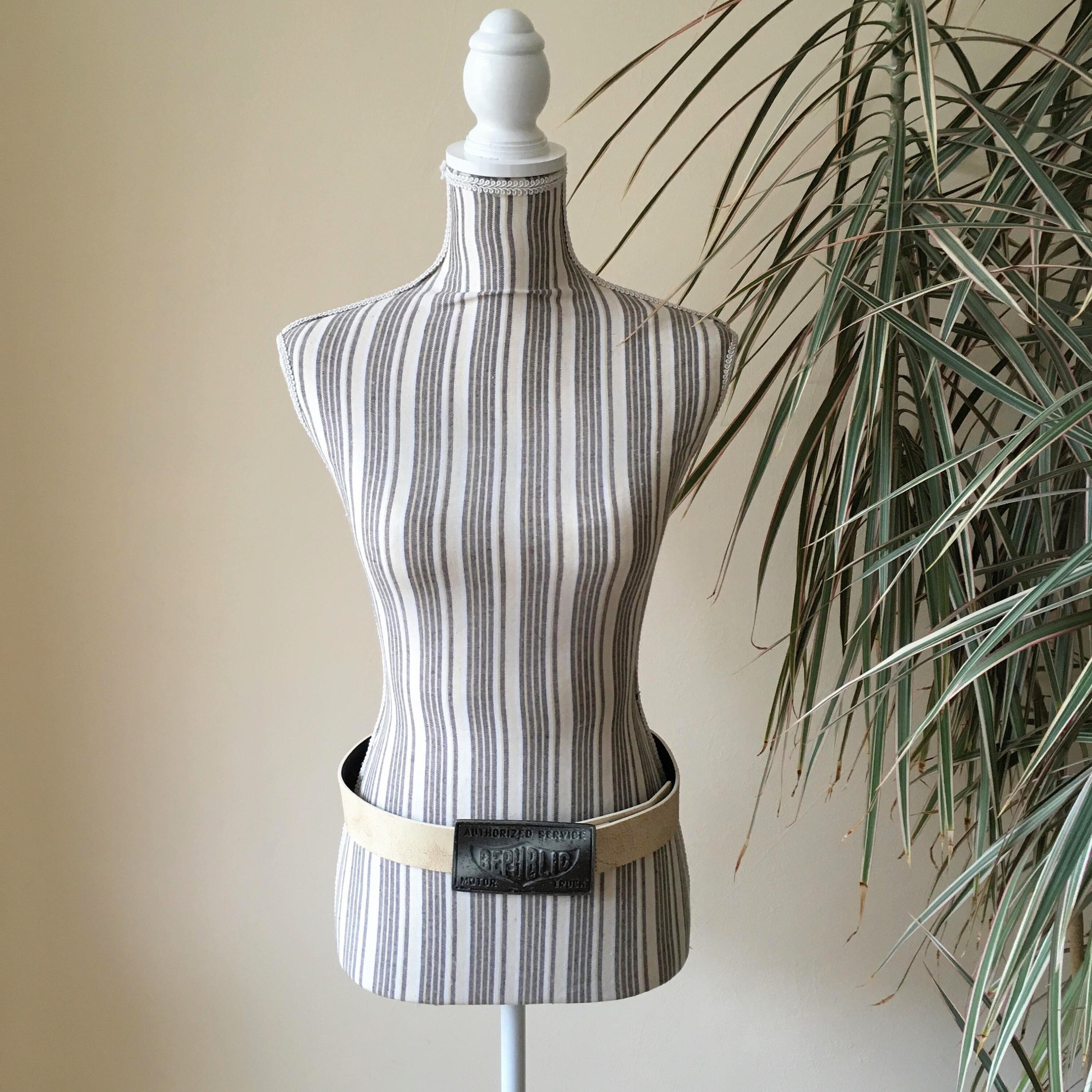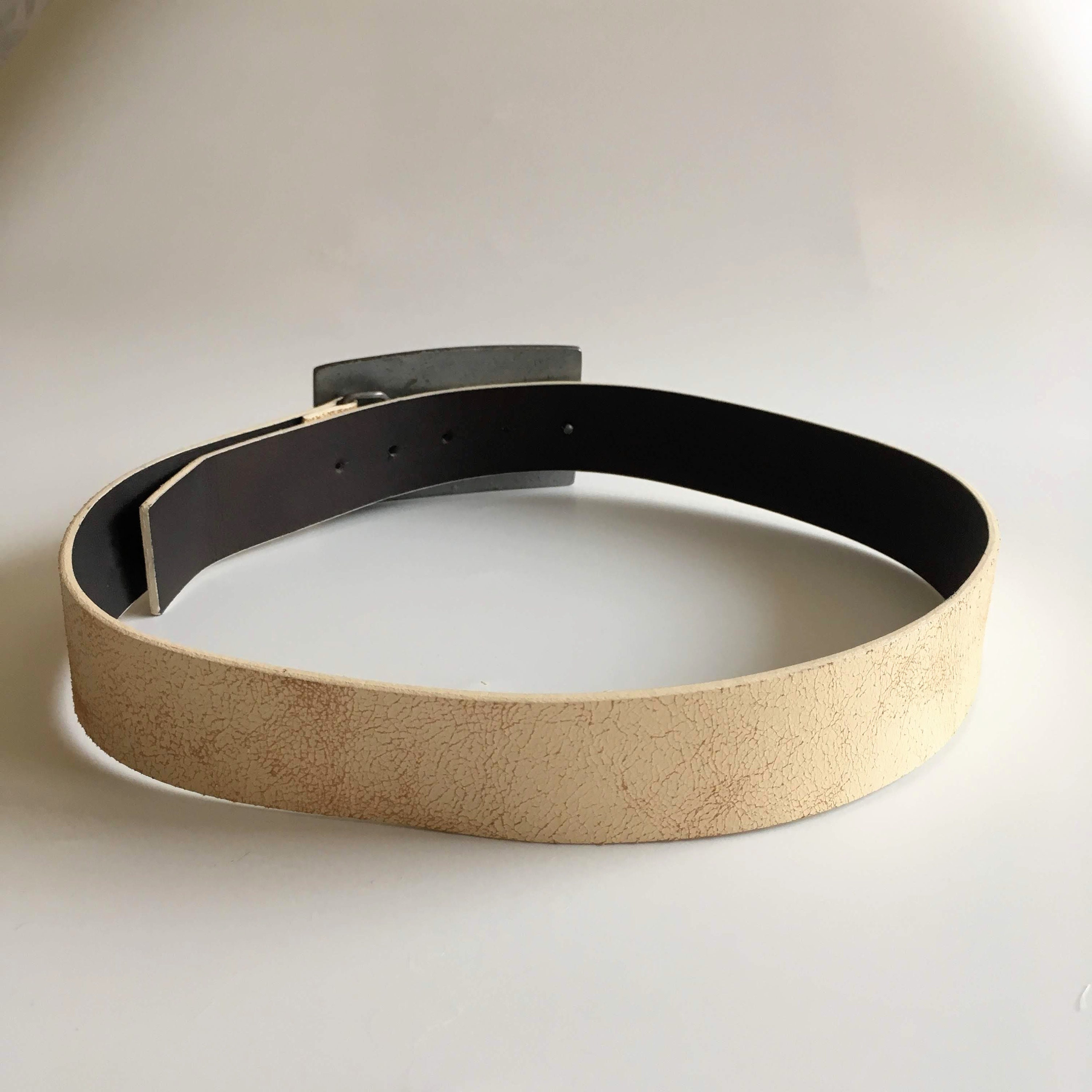 This is a vintage off white cracked leather belt with solid silver tone metal buckle which reads "Authorized Service Republic Motor Truck". This real leather unisex belt is perfect to pair with jeans. The size marked on the belt is 33.5" / 85 cm. It can adjust from 32.3" / 82 cm to 36.2"/92 cm and it is 1.6" /4 cm wide.