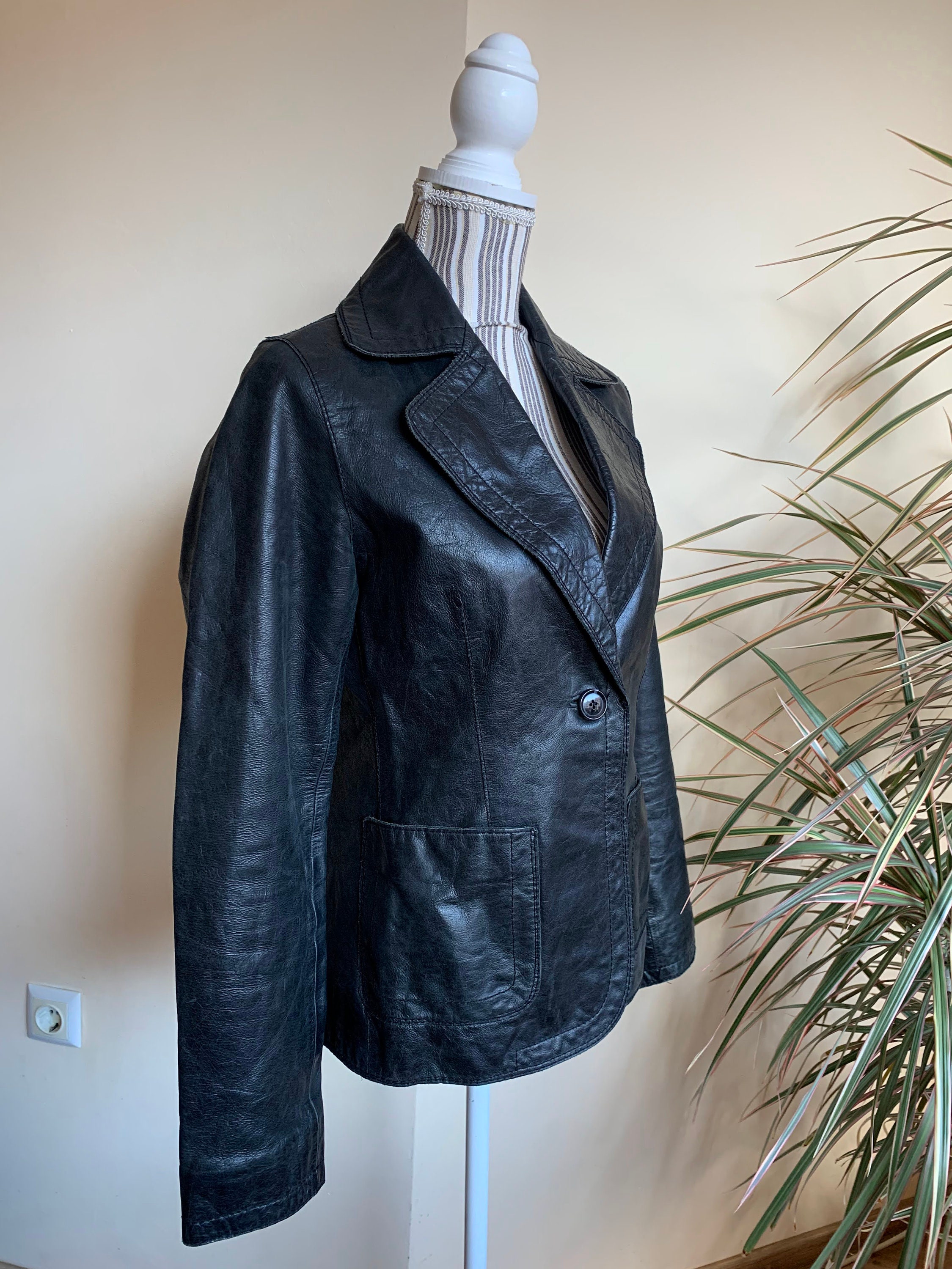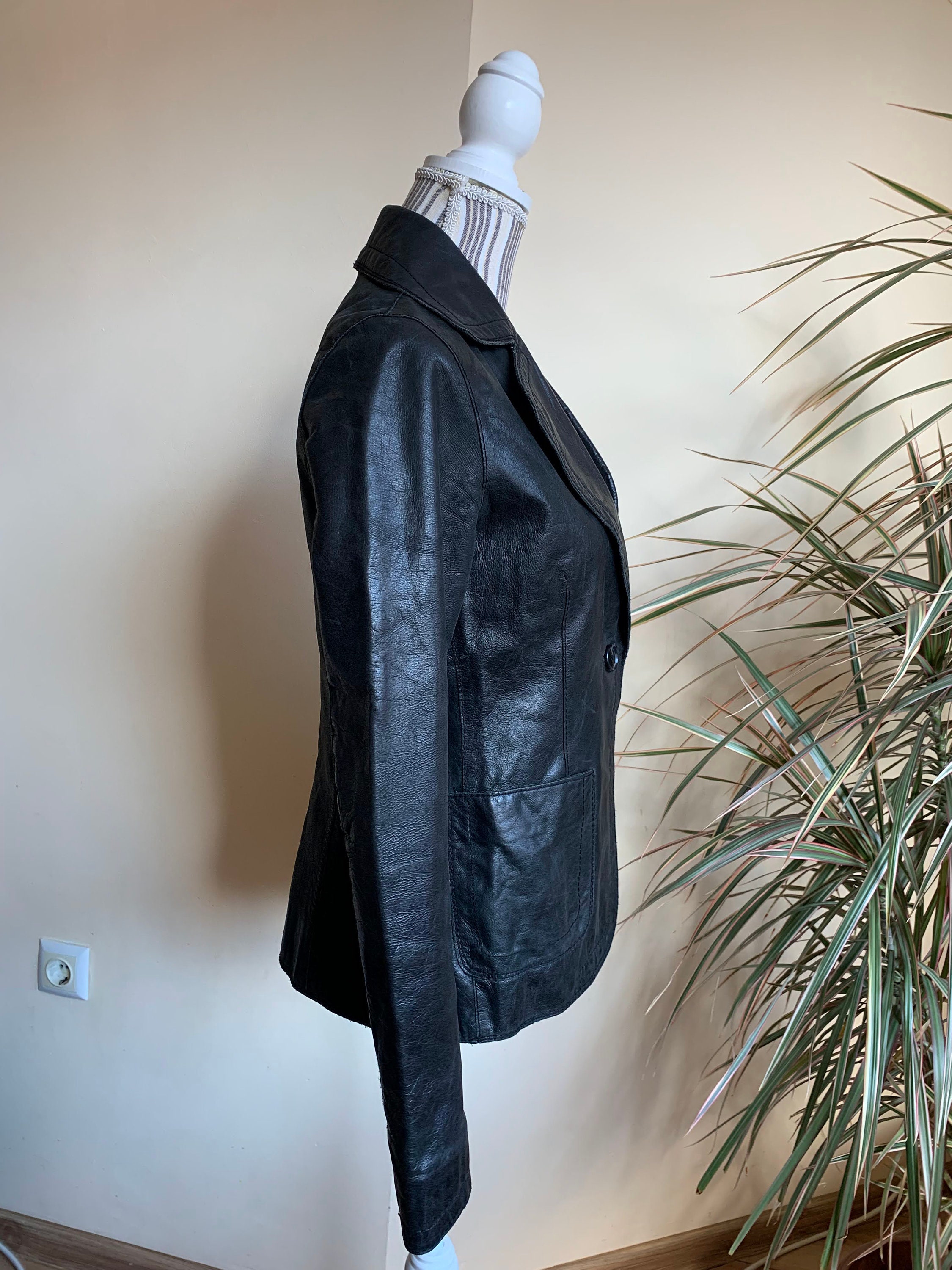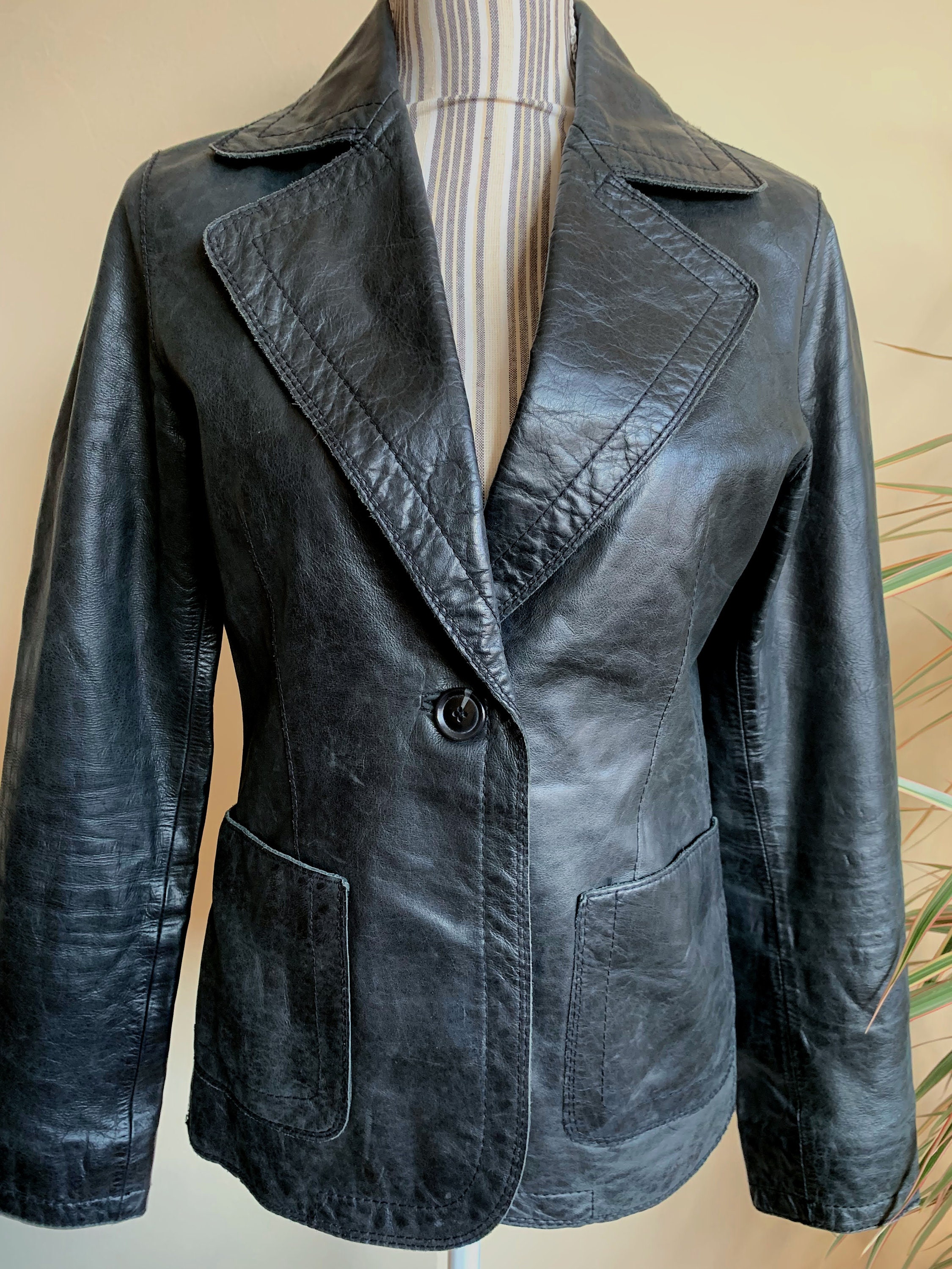 This is a vintage 90s distressed leather blazer jacket with single button. This black leather blazer is made of genuine leather which has an aged look due to the creases and scratches on the leather surface. This slim fit leather blazer has single button closure and two side pockets. It has polyester lining. This real leather blazer jacket is by the brand Bik Bok. The size marked is M, it fits like S/M. Please check the measurements below.