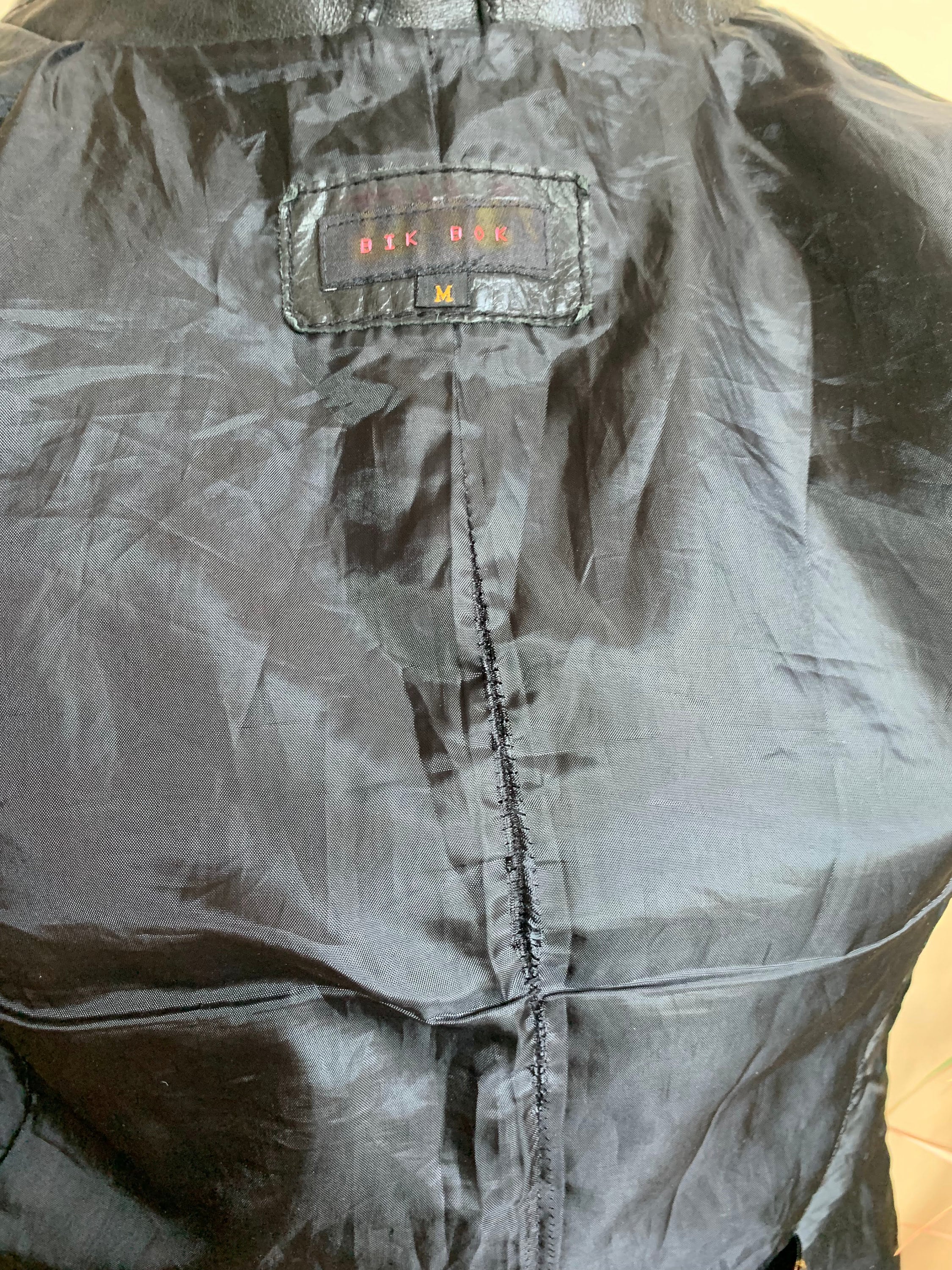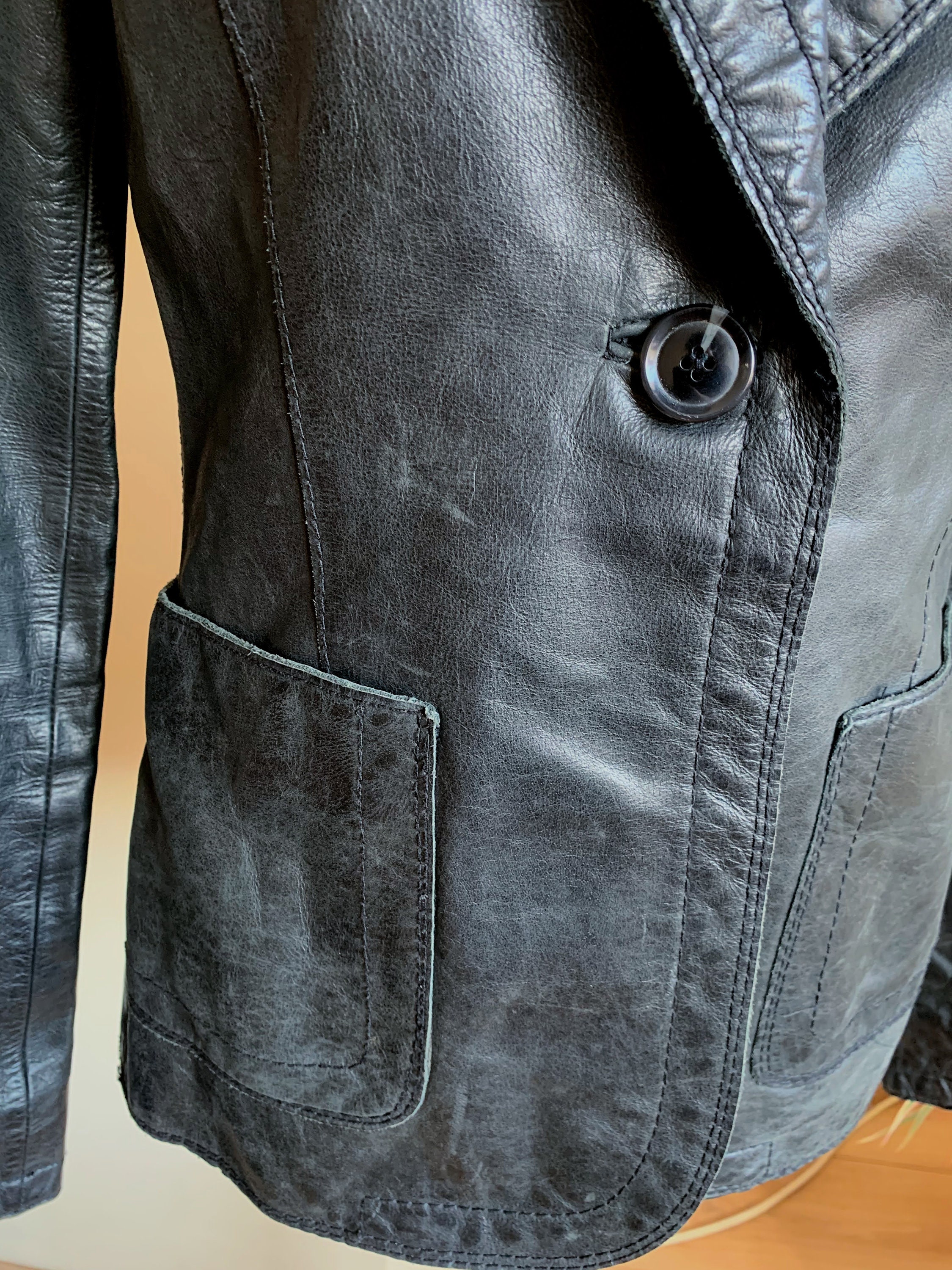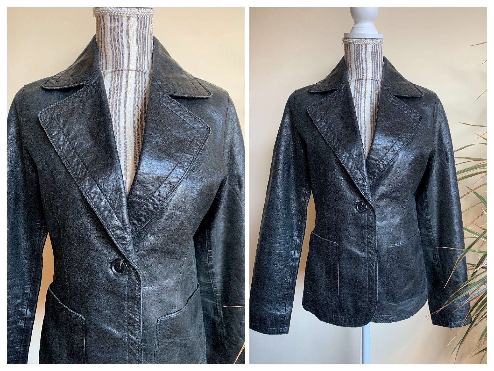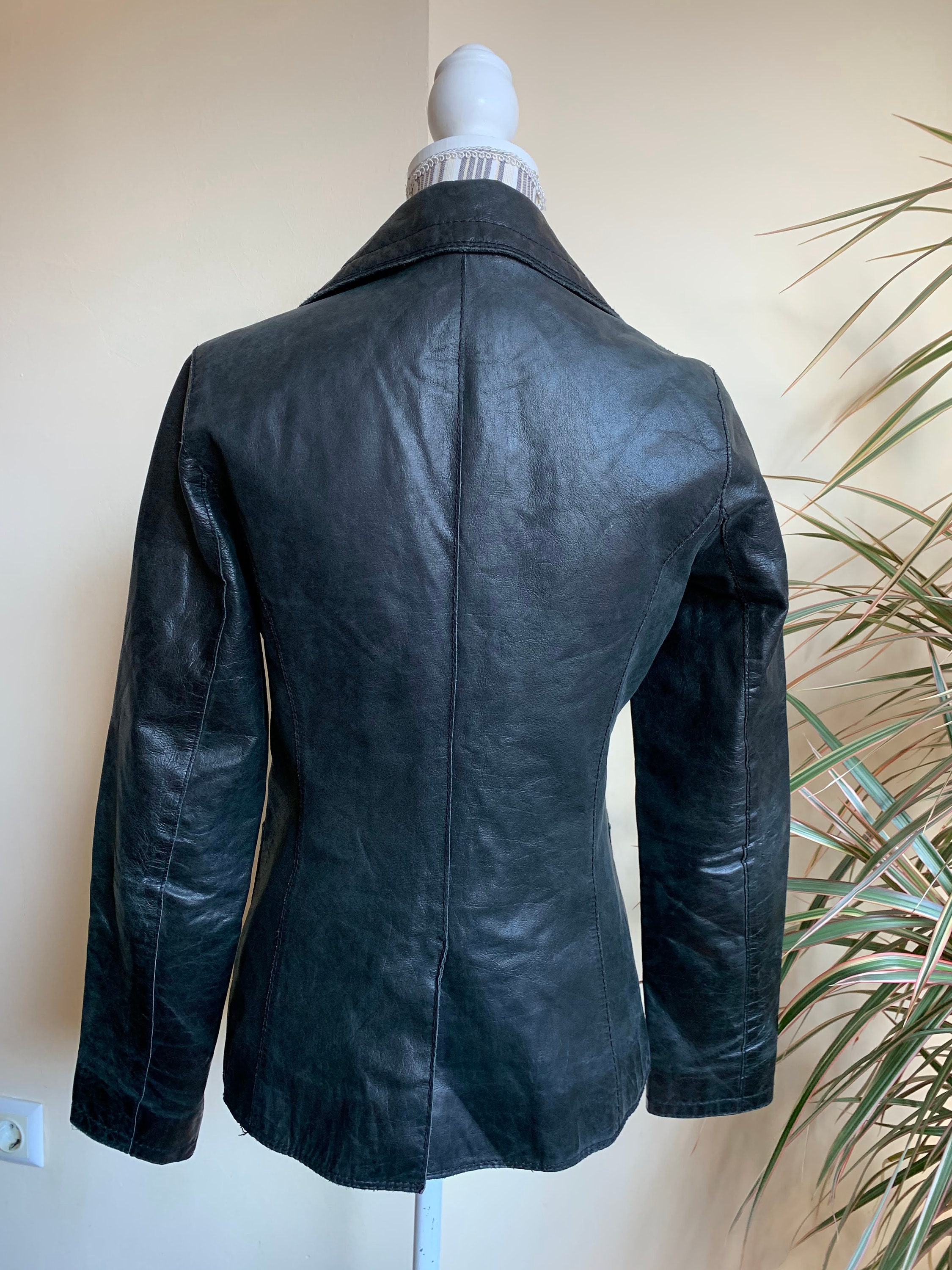This is a vintage 90s distressed leather blazer jacket with single button. This black leather blazer is made of genuine leather which has an aged look due to the creases and scratches on the leather surface. This slim fit leather blazer has single button closure and two side pockets. It has polyester lining. This real leather blazer jacket is by the brand Bik Bok. The size marked is M, it fits like S/M. Please check the measurements below.