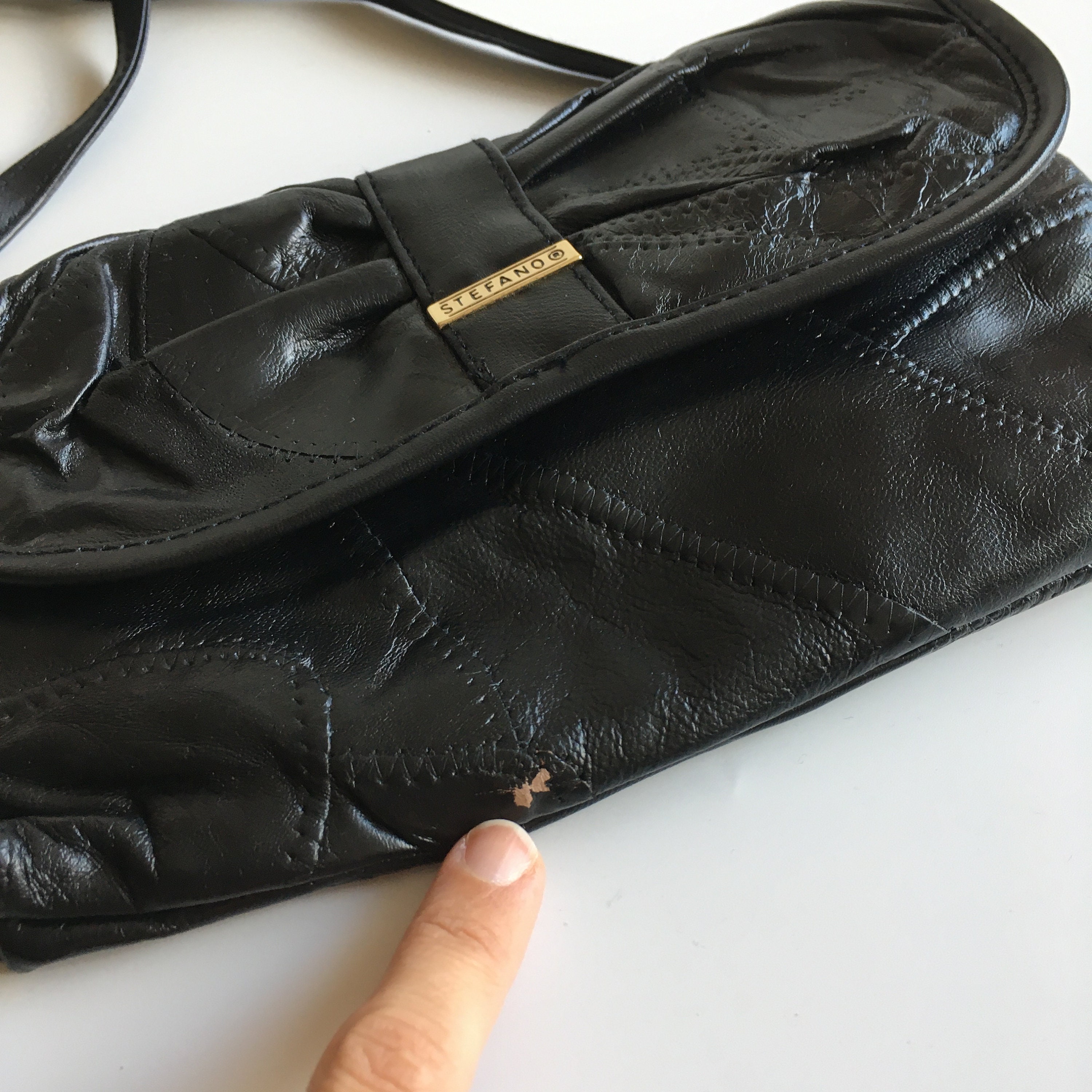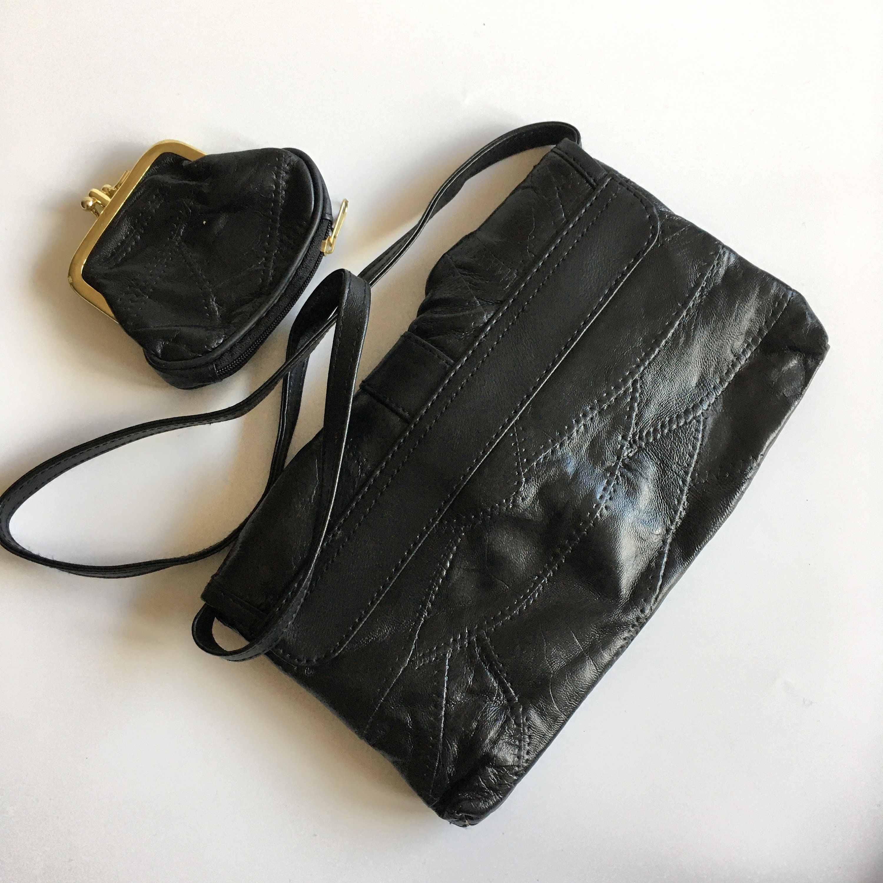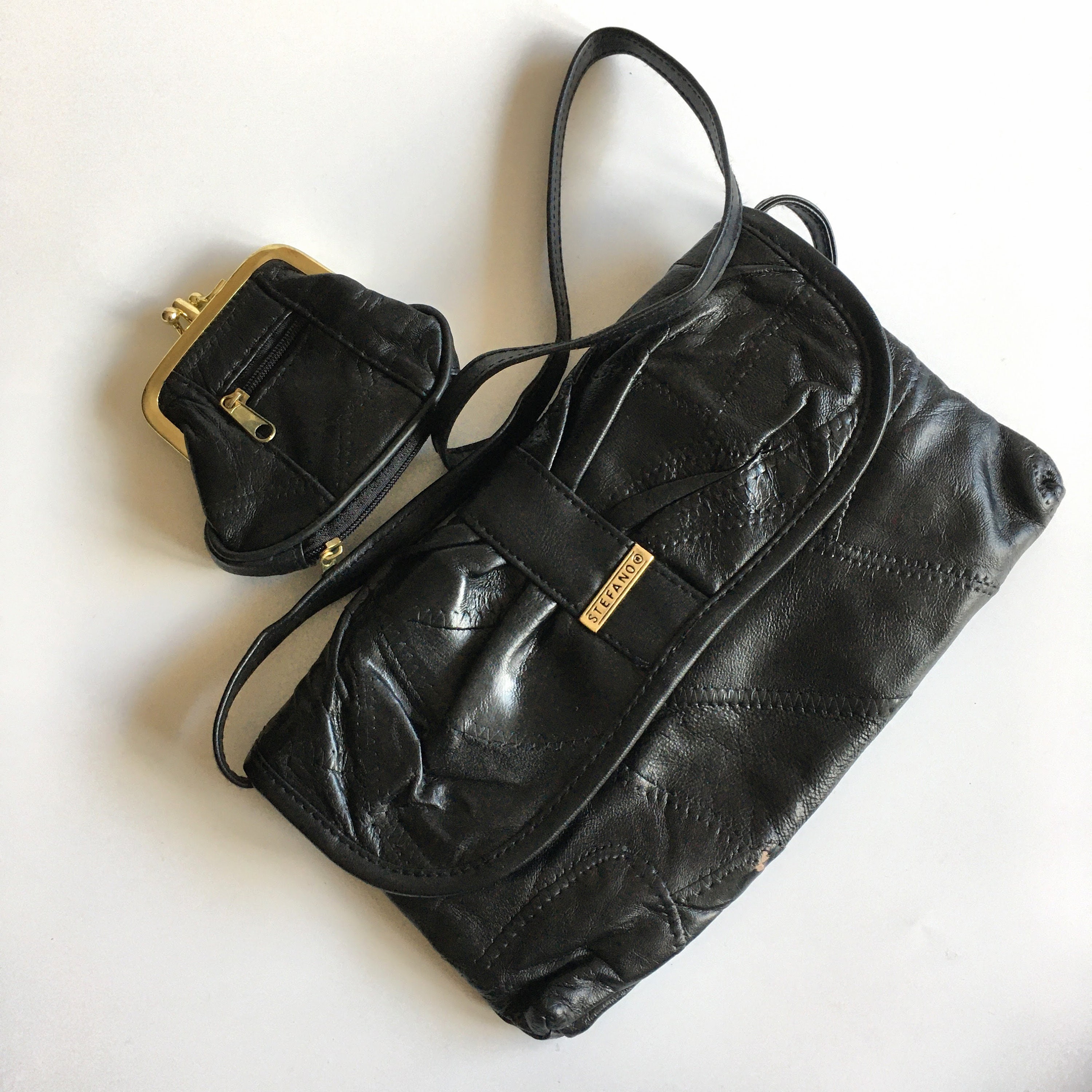 This is a soft patchwork clutch purse with detachable shoulder strap and small kiss lock coin purse. This set is by the brand Stefano. It is made of soft black genuine leather pieces. The interior is lined in black monogrammed polyester fabric. The clutch has one compartment and one pocket with zip closure. The kiss lock coin purse has two compartments and two zipper pockets.