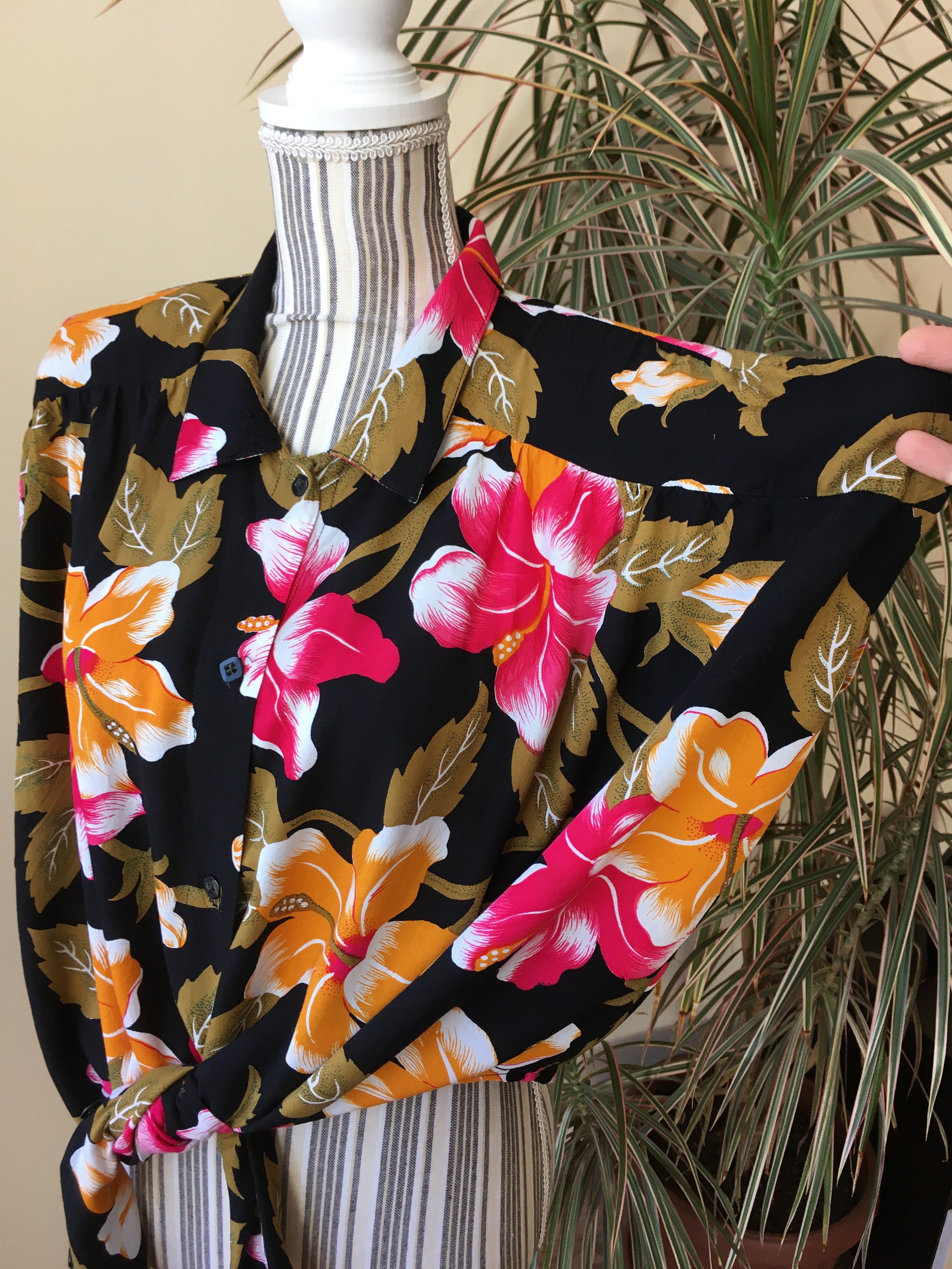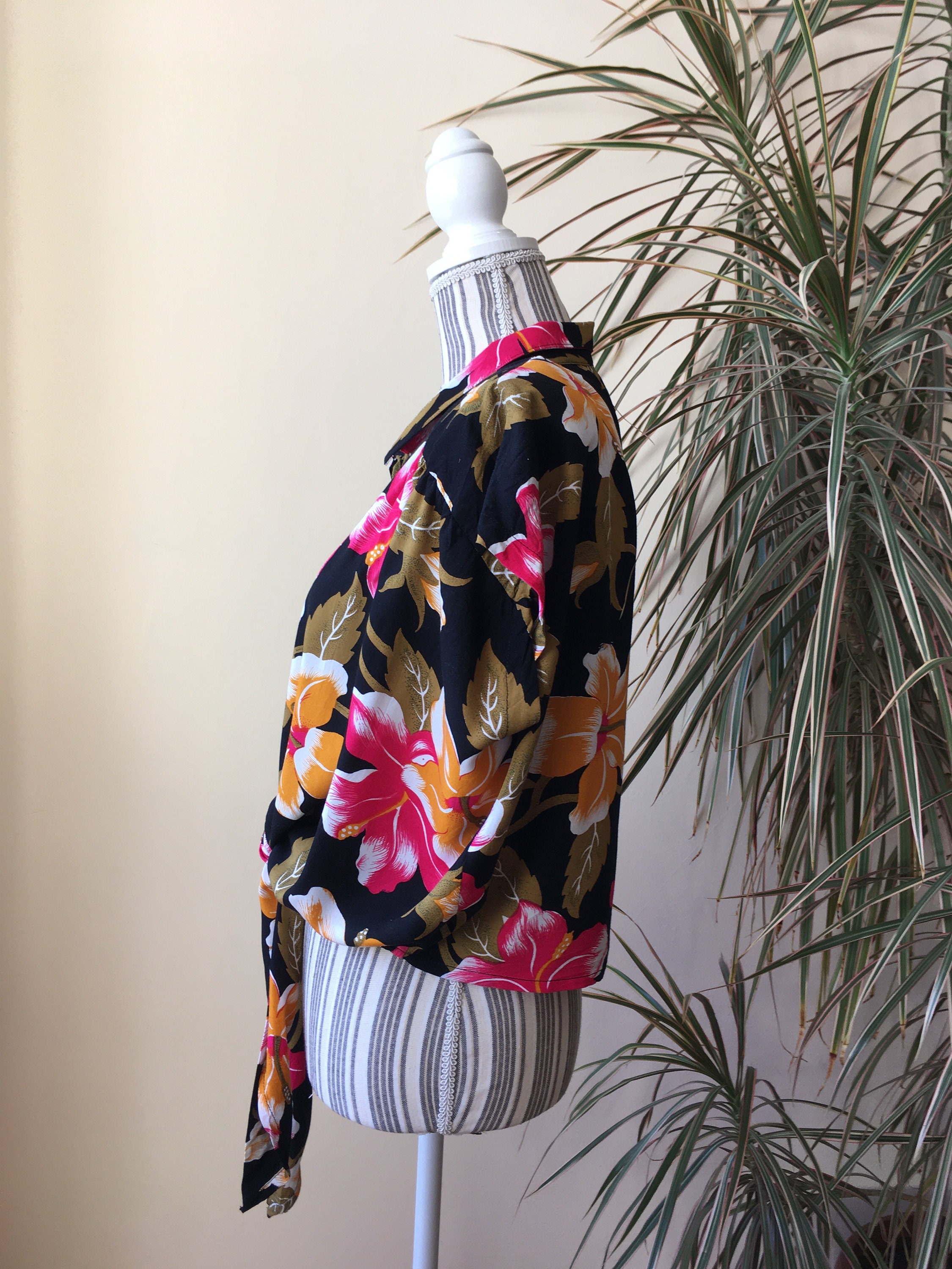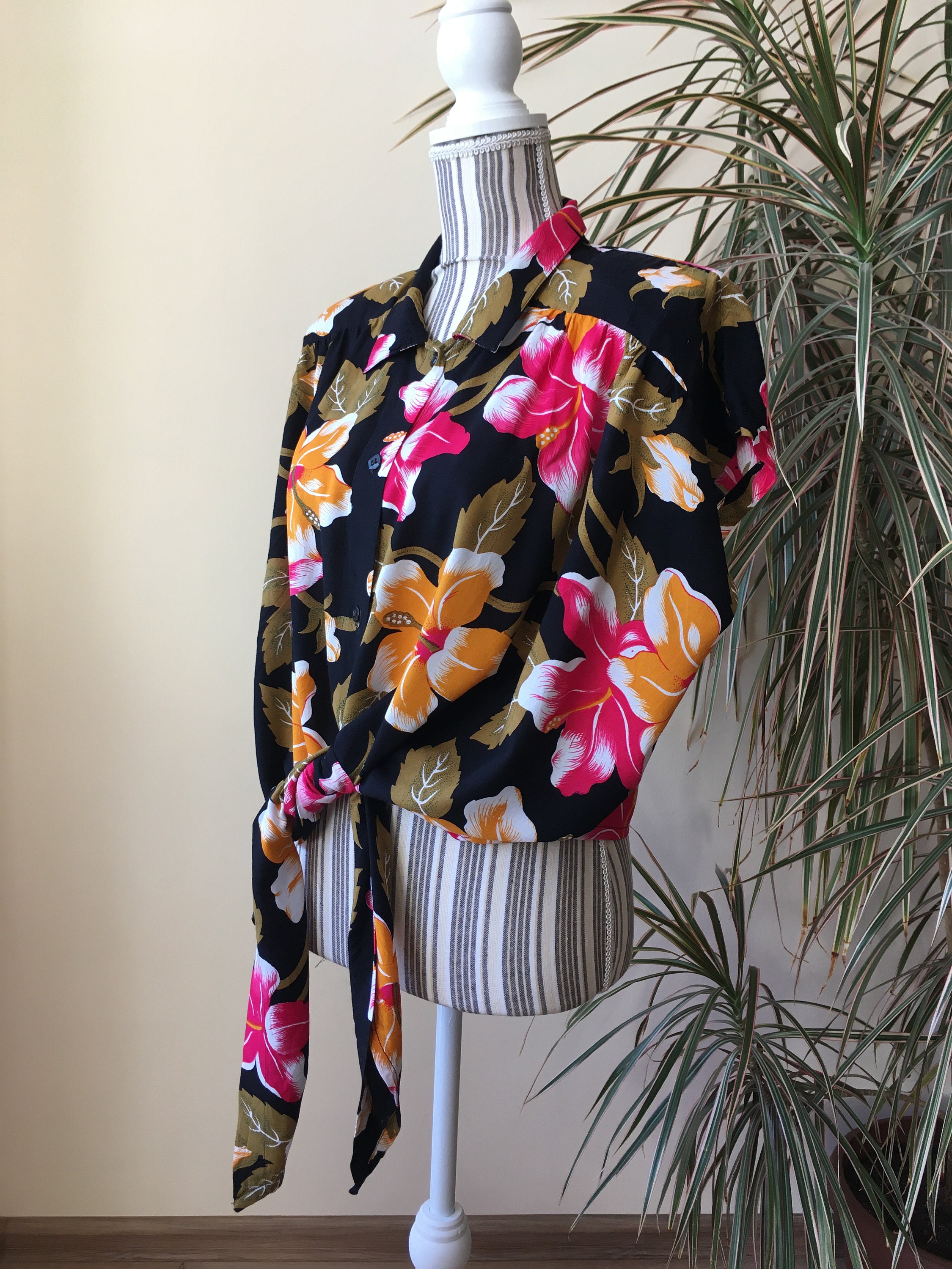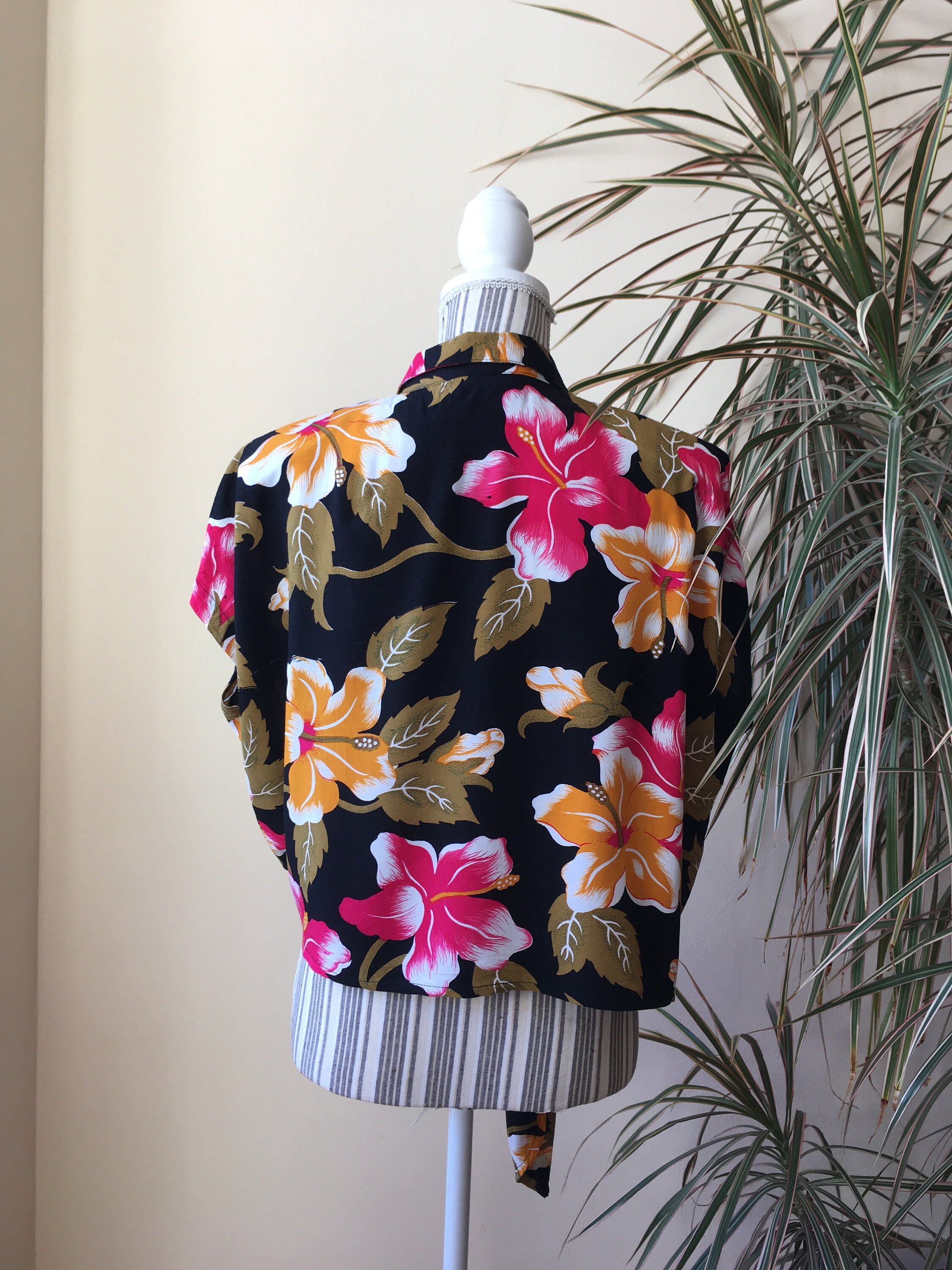 This is a vintage 80s tropical shoulder pad button down shirt with tie front. It is asymmetrical - shorter at the back and longer at the front. There is no size marked, but this Hawaiian shirt fits like size M.