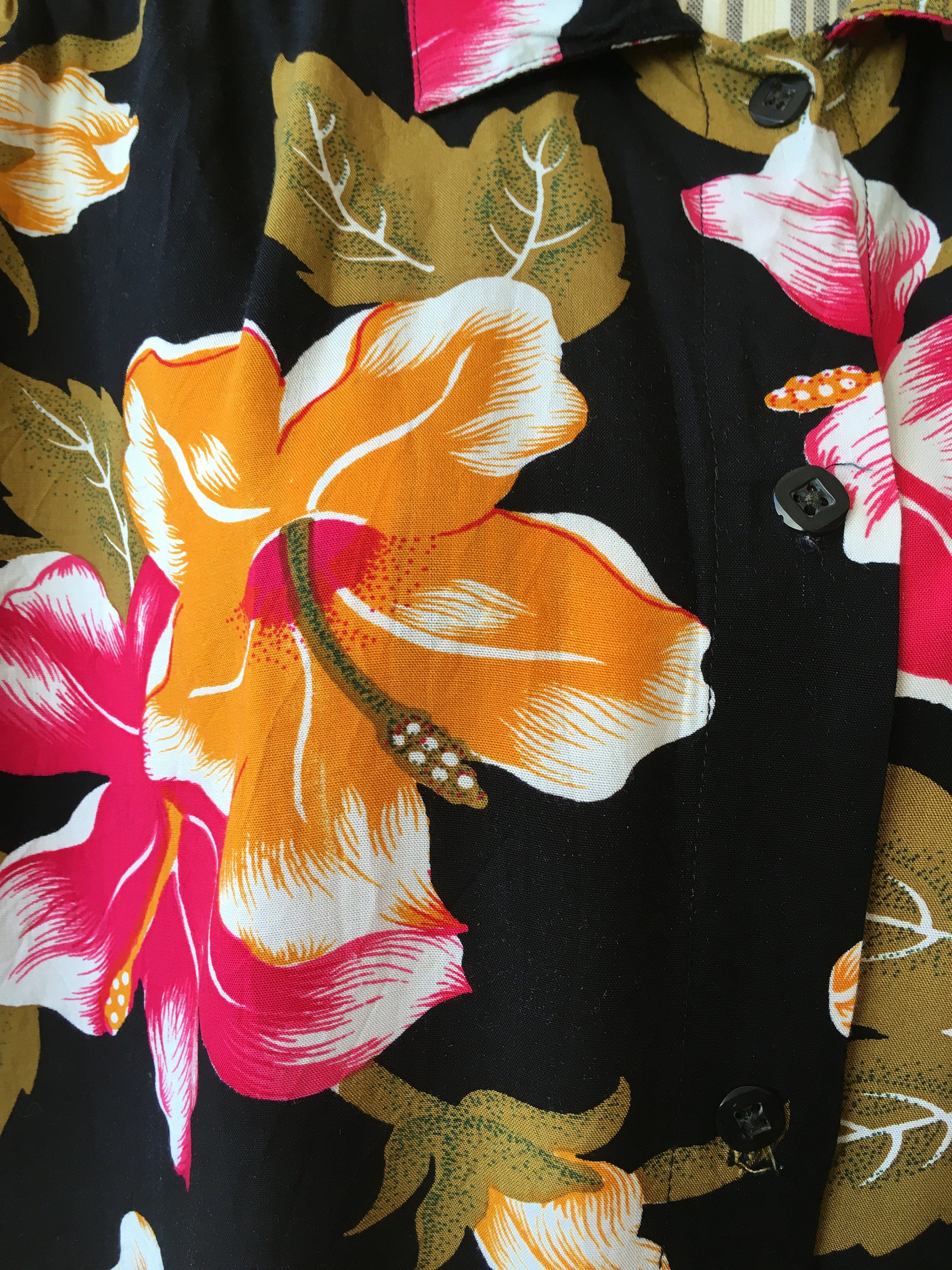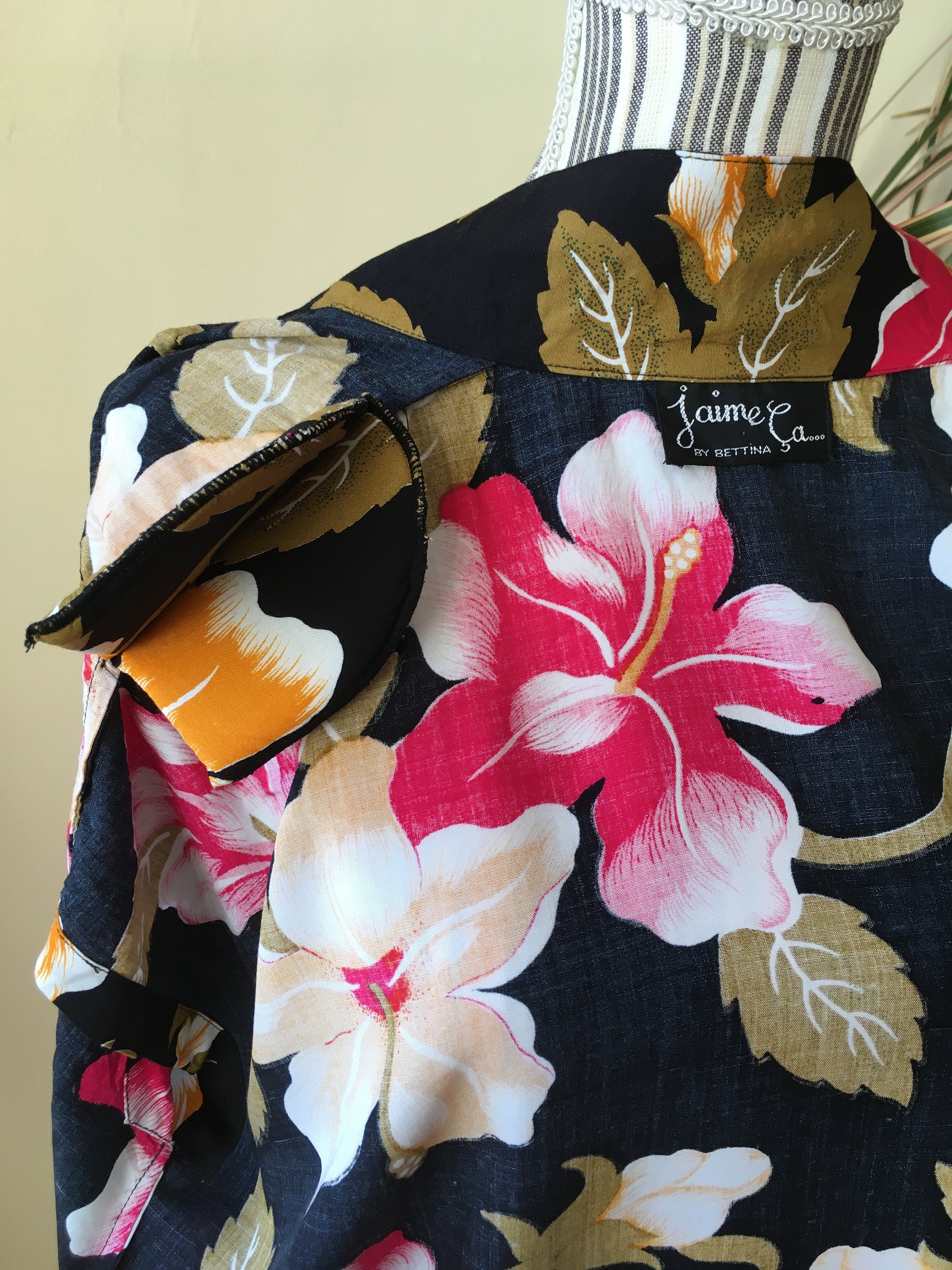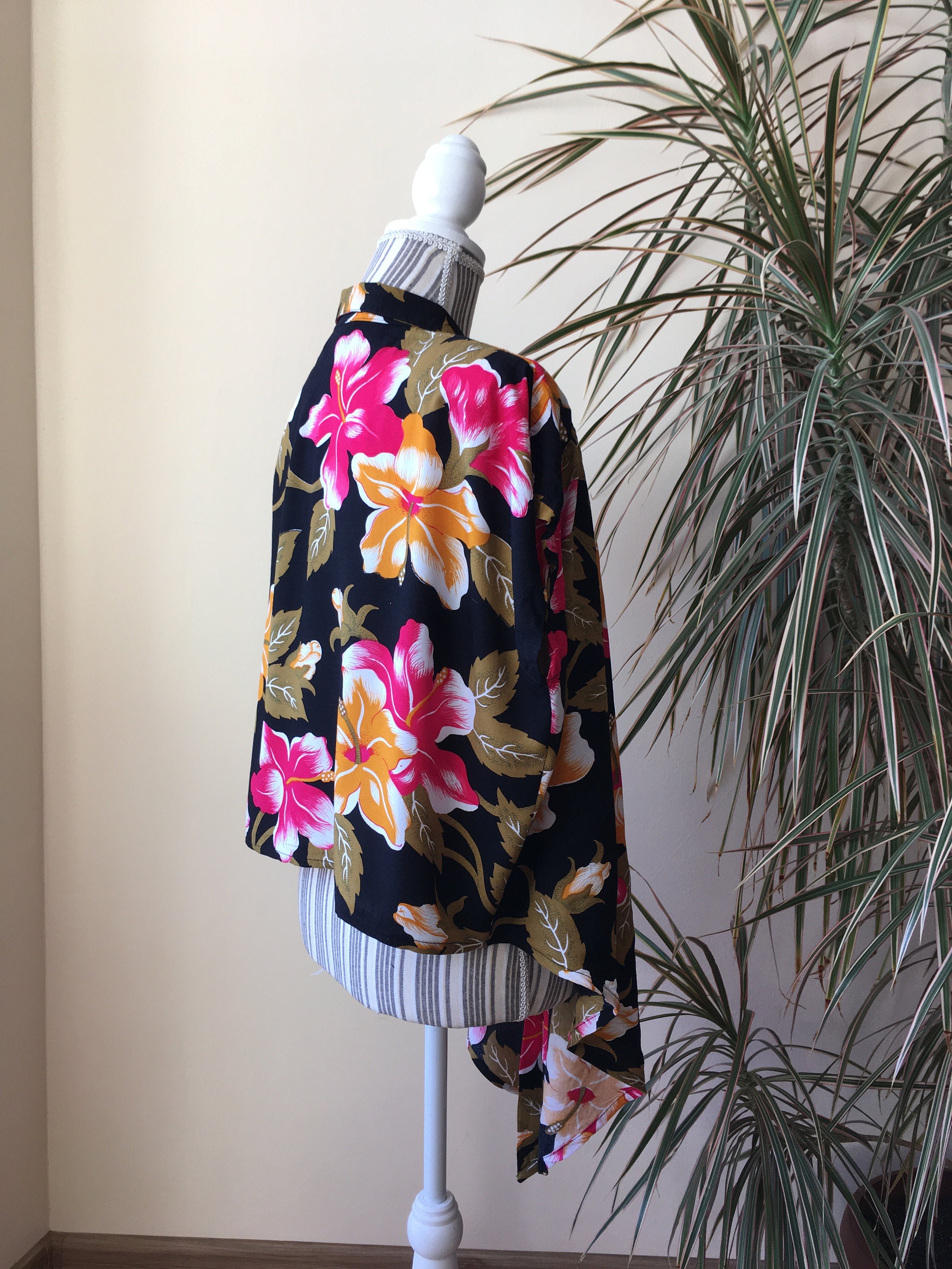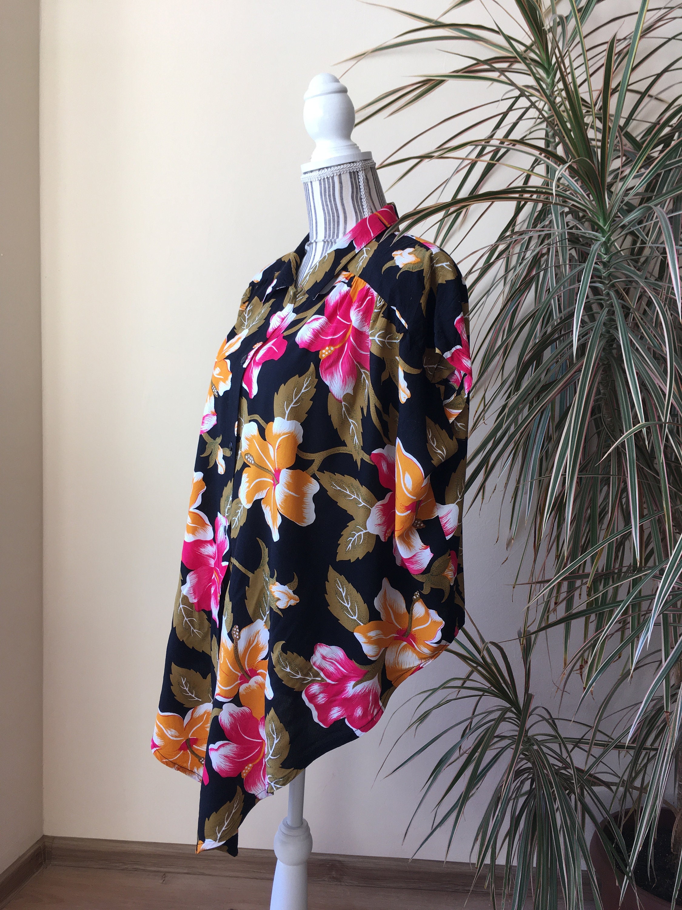 This is a vintage 80s tropical shoulder pad button down shirt with tie front. It is asymmetrical - shorter at the back and longer at the front. There is no size marked, but this Hawaiian shirt fits like size M.