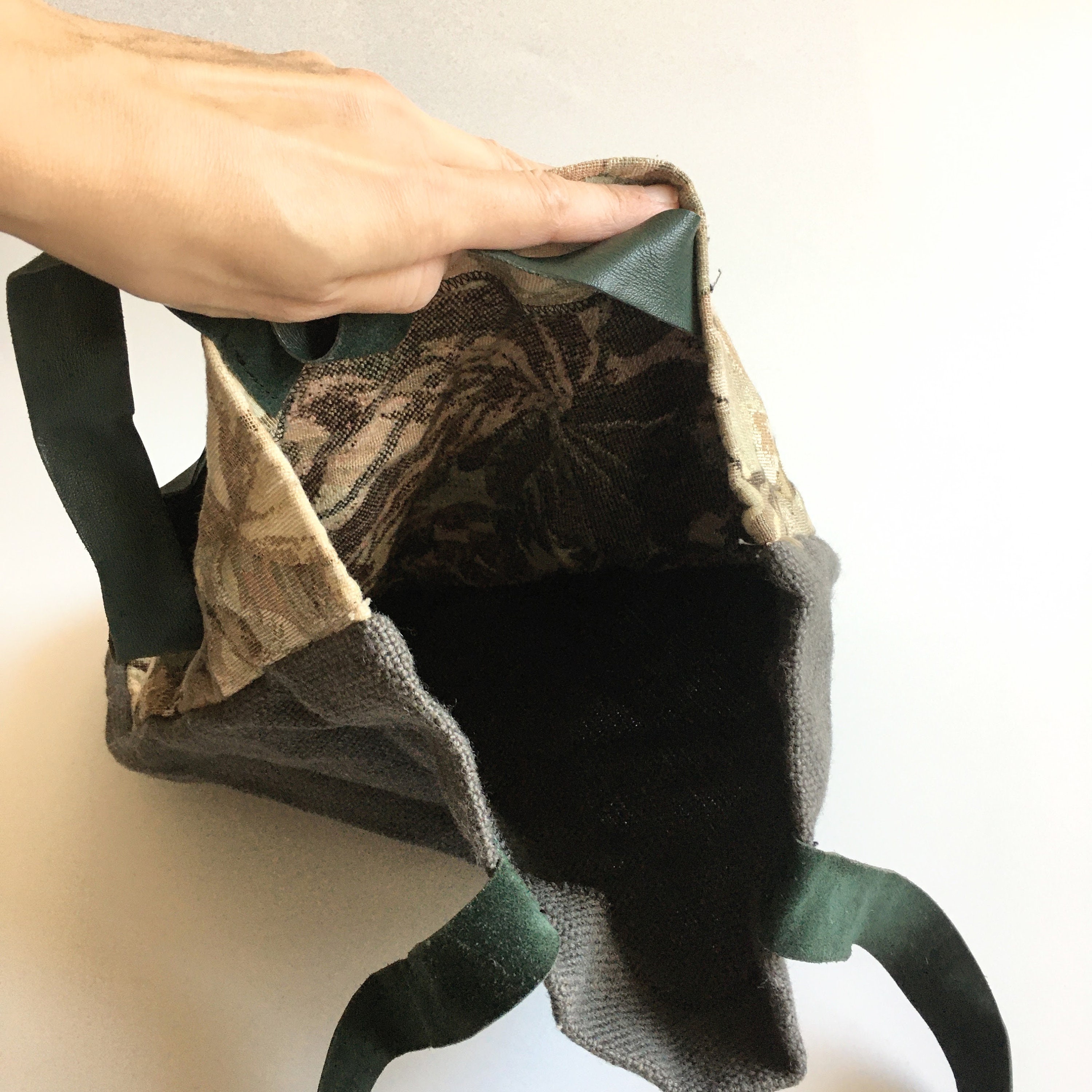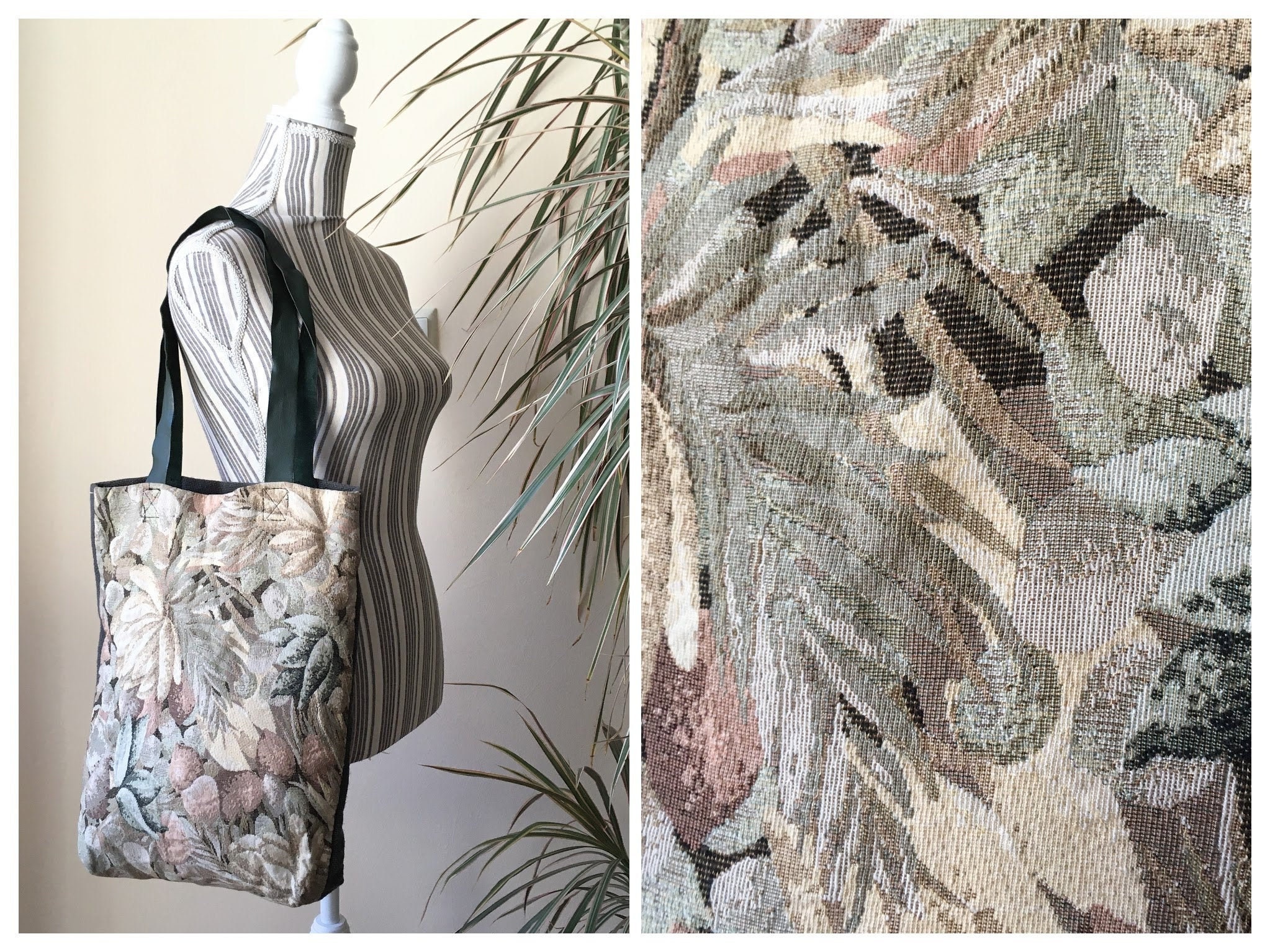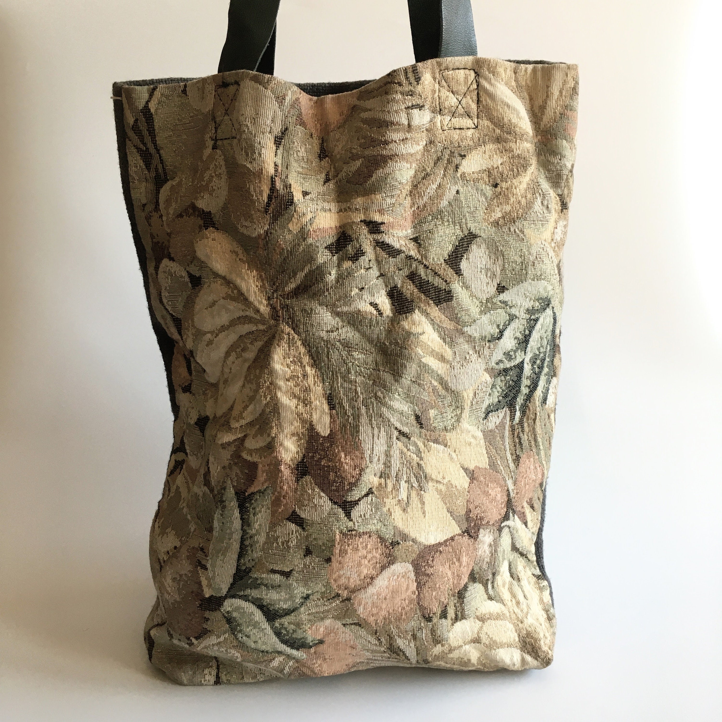 This is a cute tapestry book tote bag with genuing leather straps. This boho handbag is made of cotton gobelin fabric at the front and rough linen burlap fabric at the back. There is no lining inside. This simple 70s handbag has one compartment.