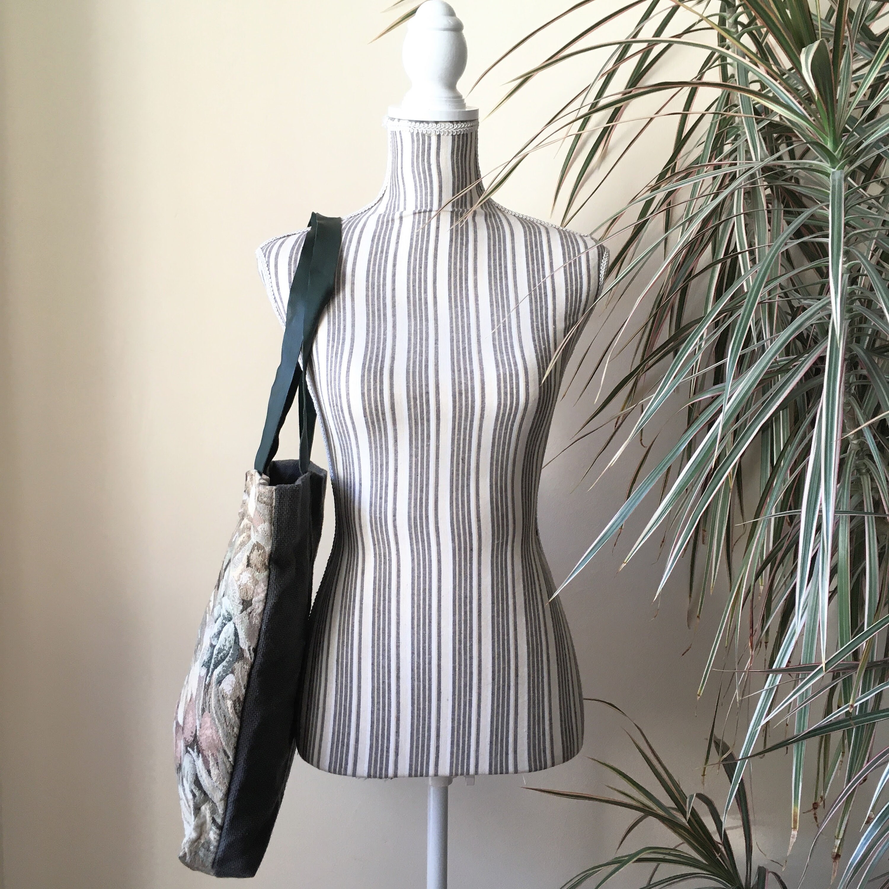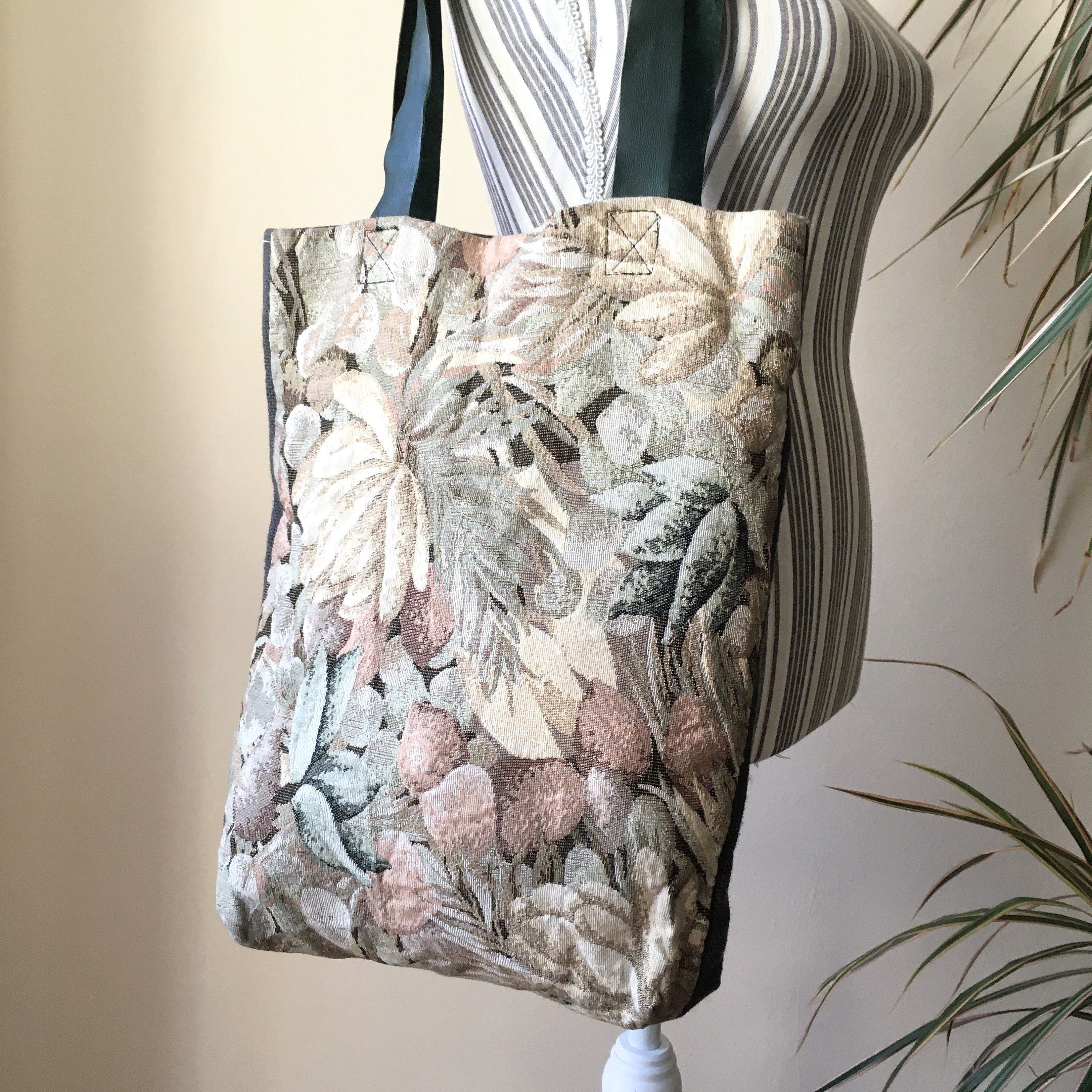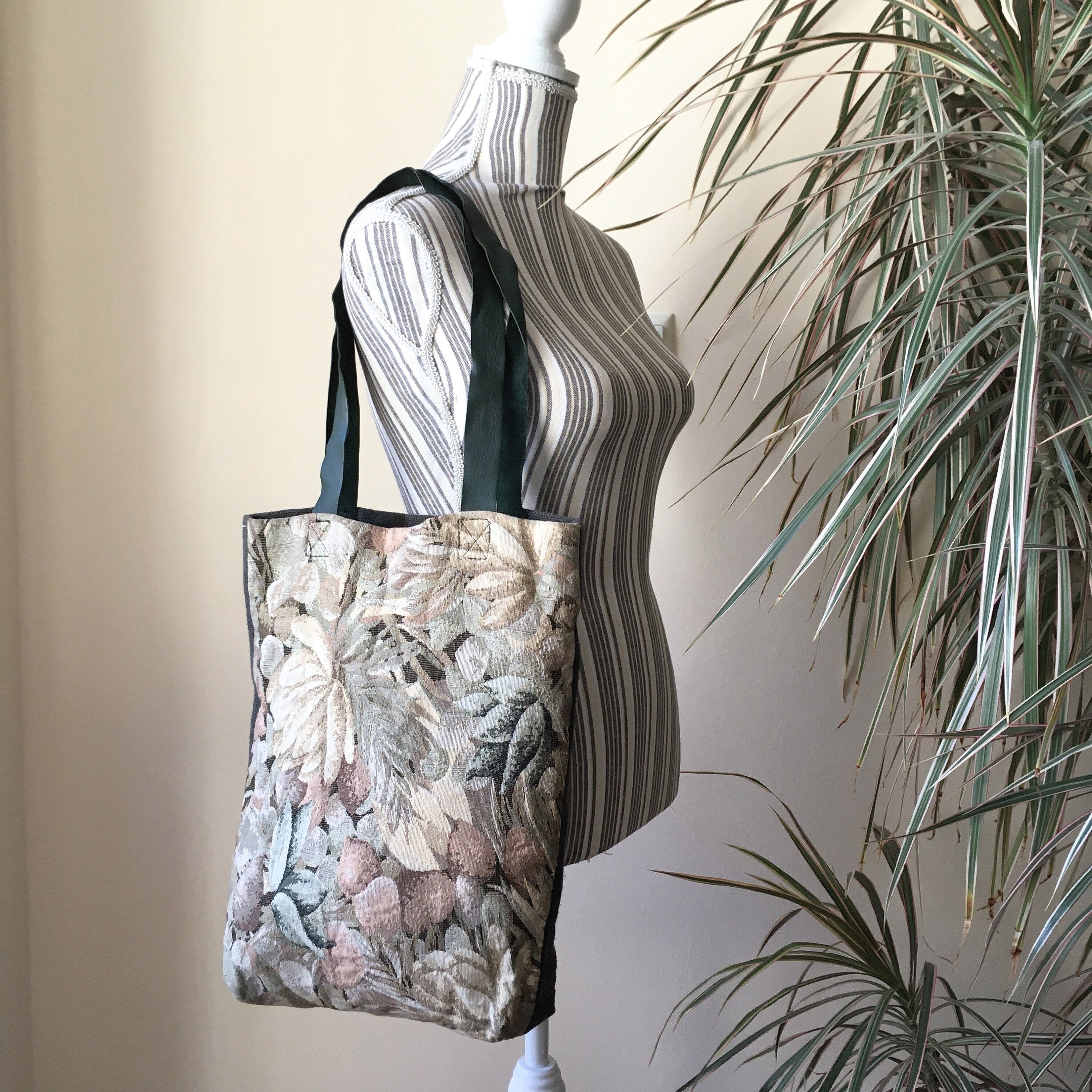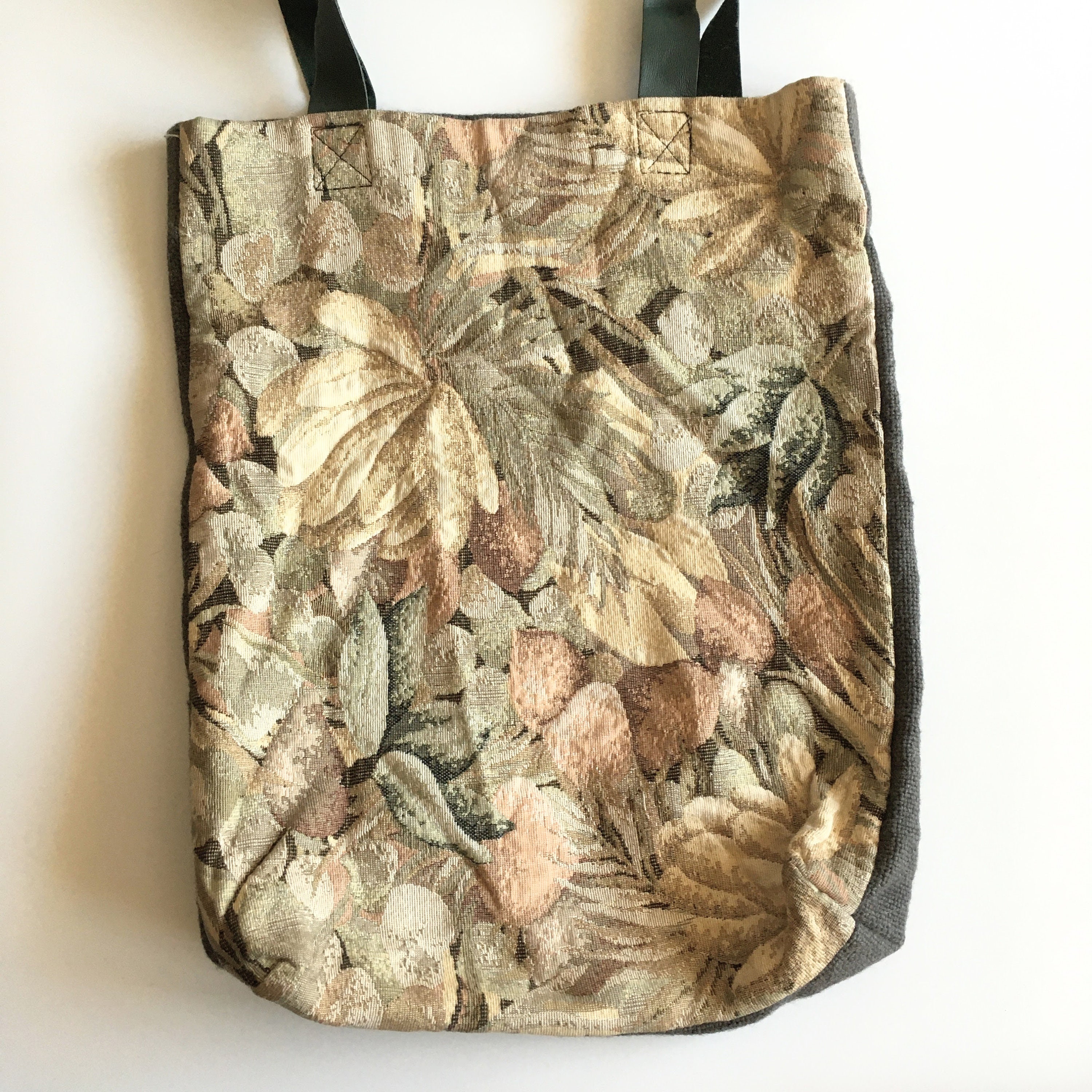 This is a cute tapestry book tote bag with genuing leather straps. This boho handbag is made of cotton gobelin fabric at the front and rough linen burlap fabric at the back. There is no lining inside. This simple 70s handbag has one compartment.