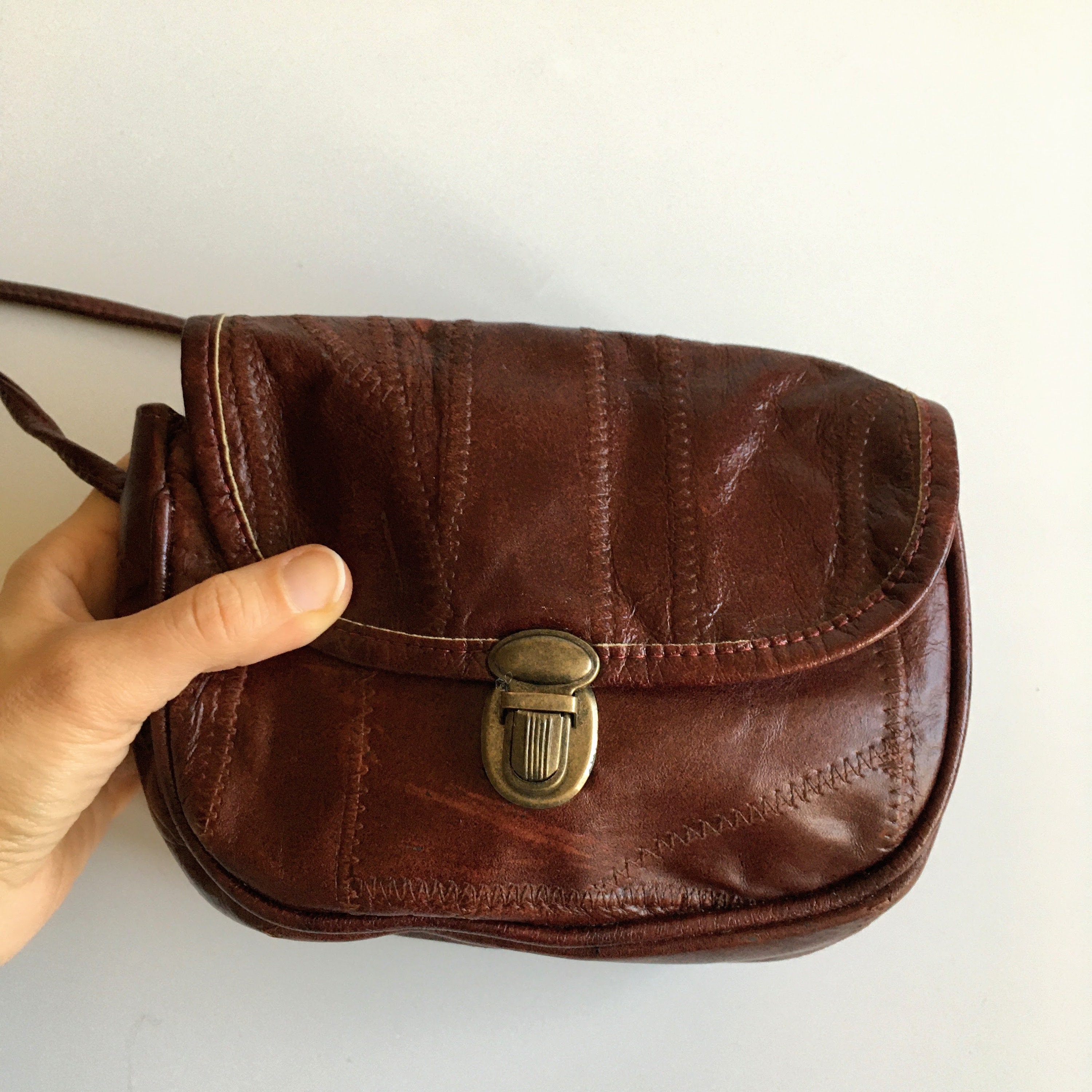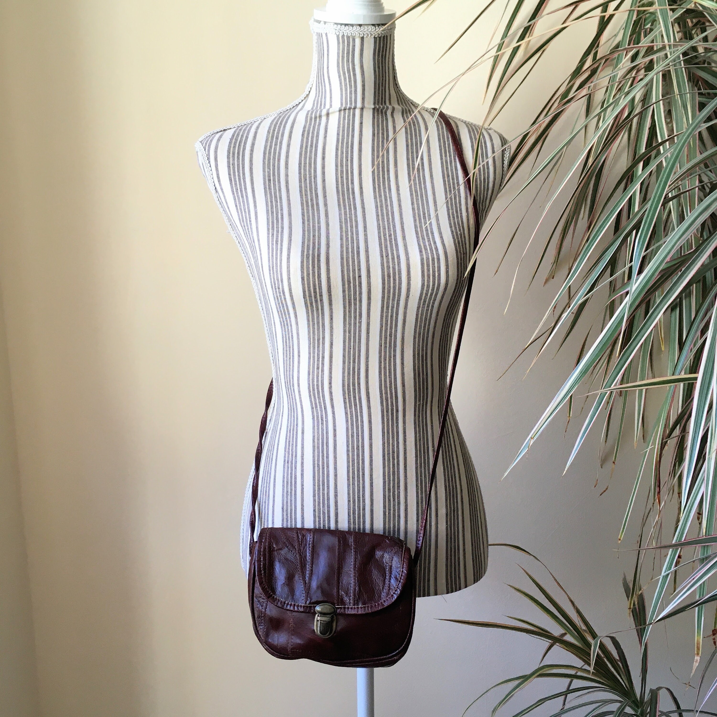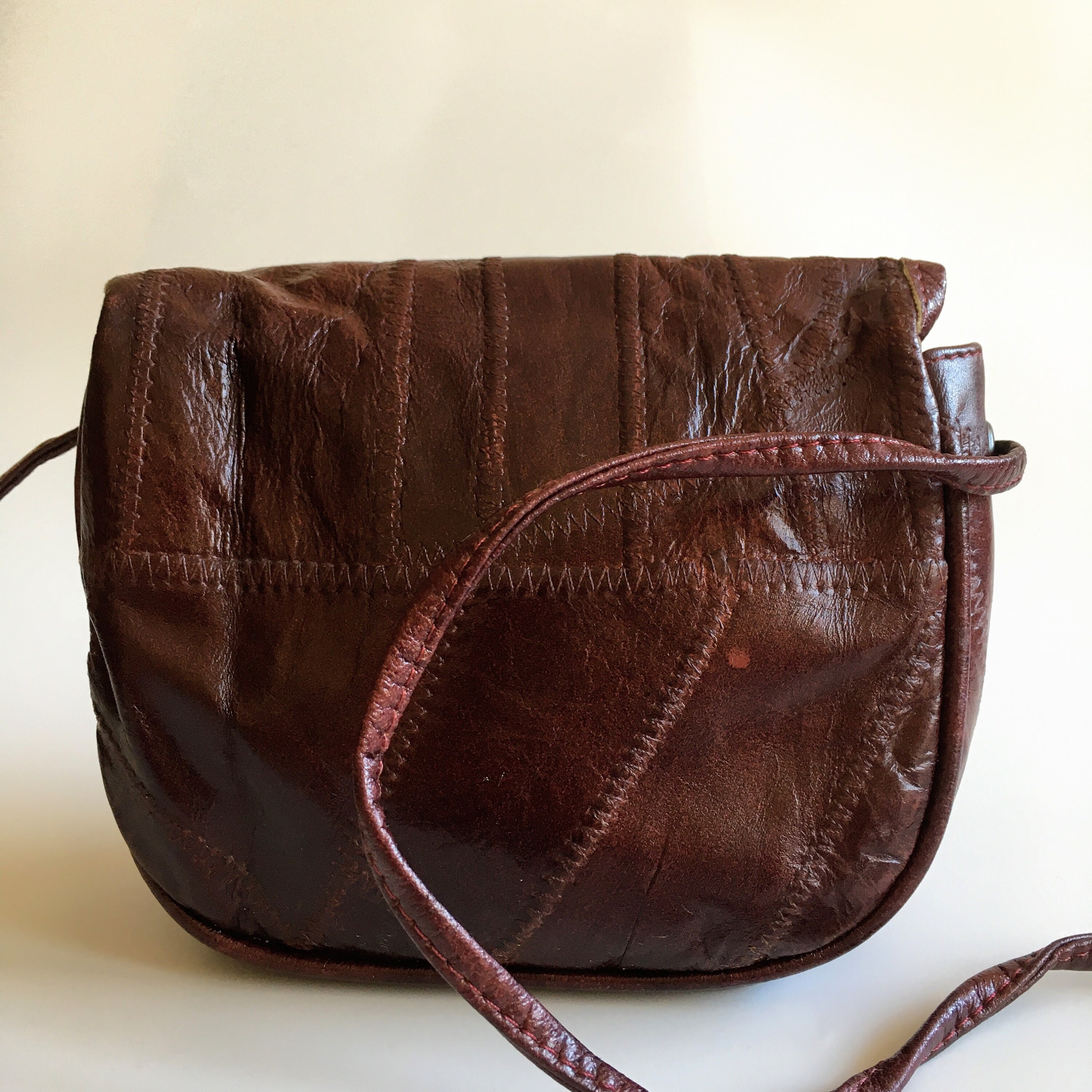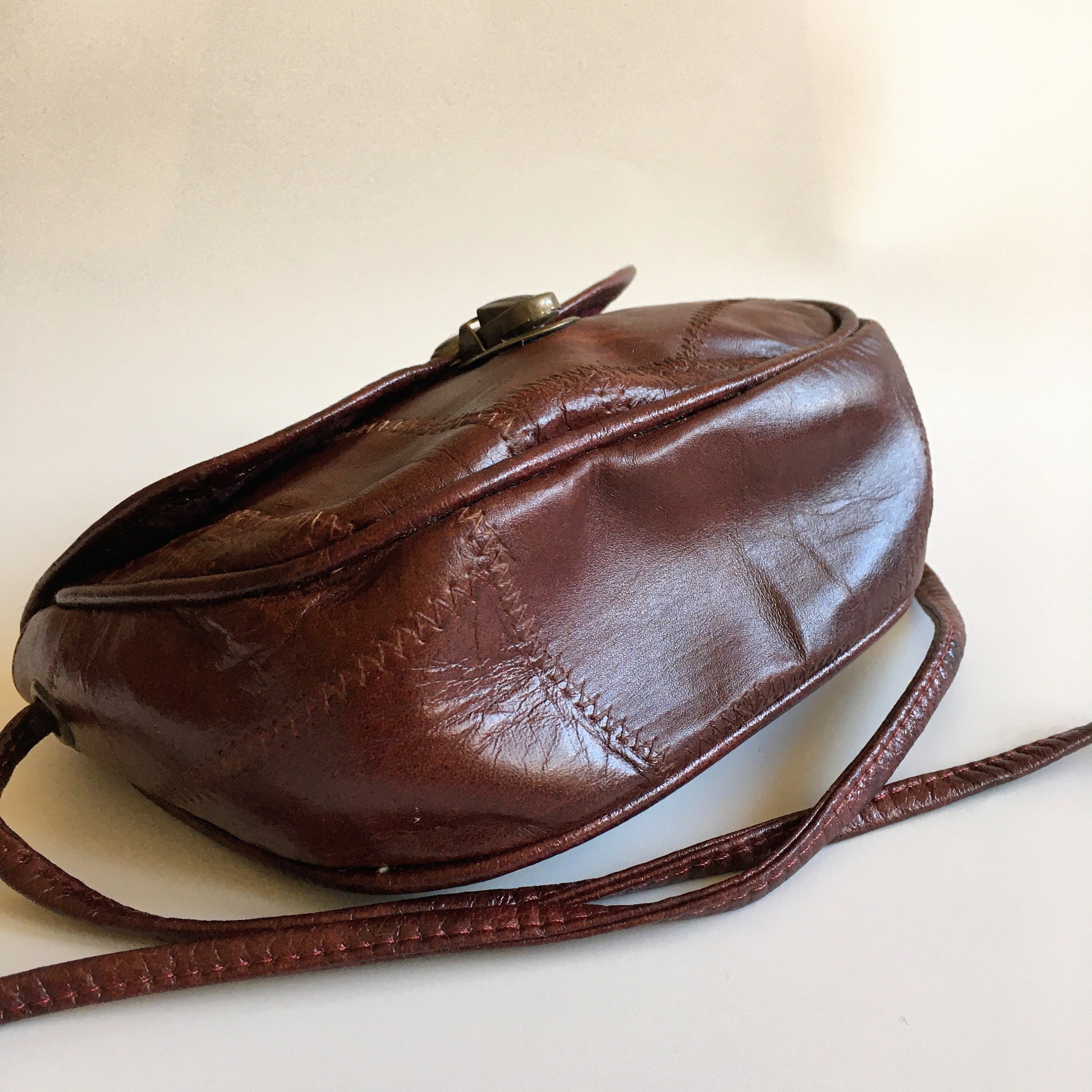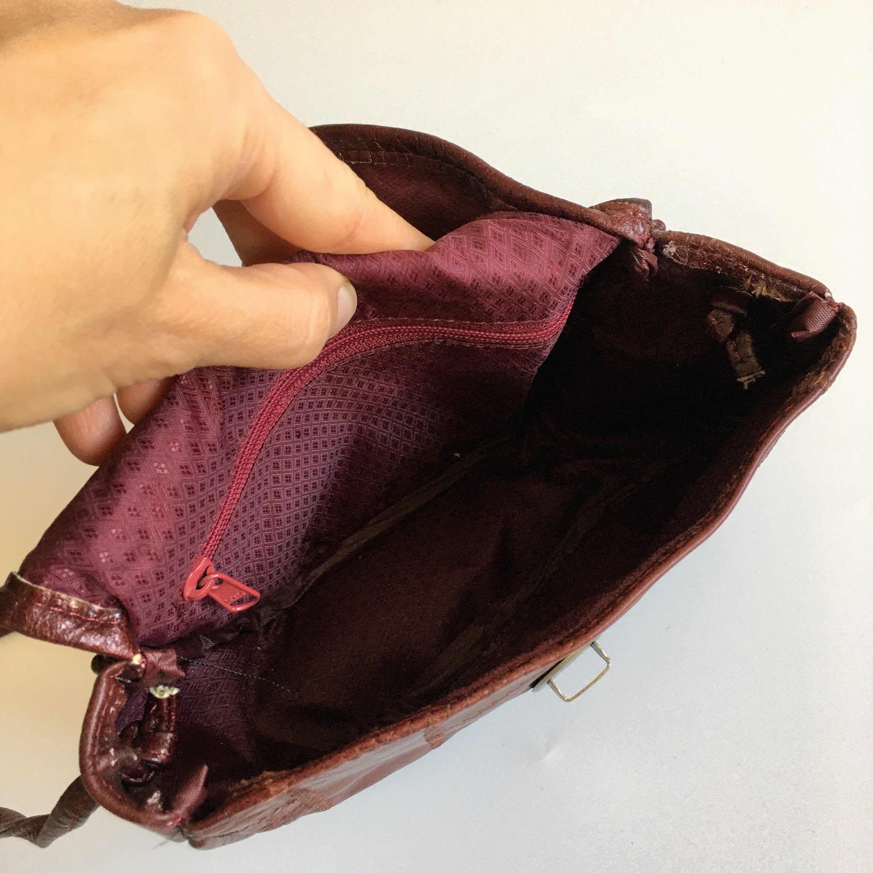 This is small crossbody bag for women, made of genuine leather with faux leather trim. This mini crossbody is made of patches of leather in oxblood color. It has a brass buckle closure. The interior is lined in synthetic fabric. There is one compartment and one pocket with zip closure. The strap can be adjusted when you tie the knots inside the purse.