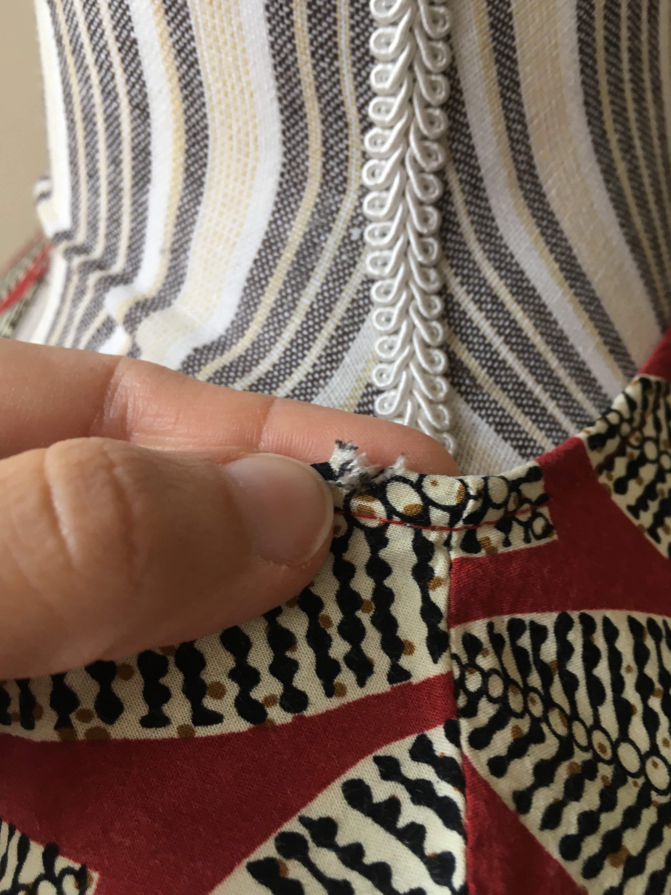 Condition: There is a 5 mm tear close to the stitch on the left shoulder, which I have captured in the close up photo, as well as 2 mm tear at the right armpit . This can hаrdly be spotted when worn. There are some loose stitches around the neckline hem - at the back of the neck and the right armpit, each is about an inch, but again, as this is just the hem, it does not affect wearing the garment.