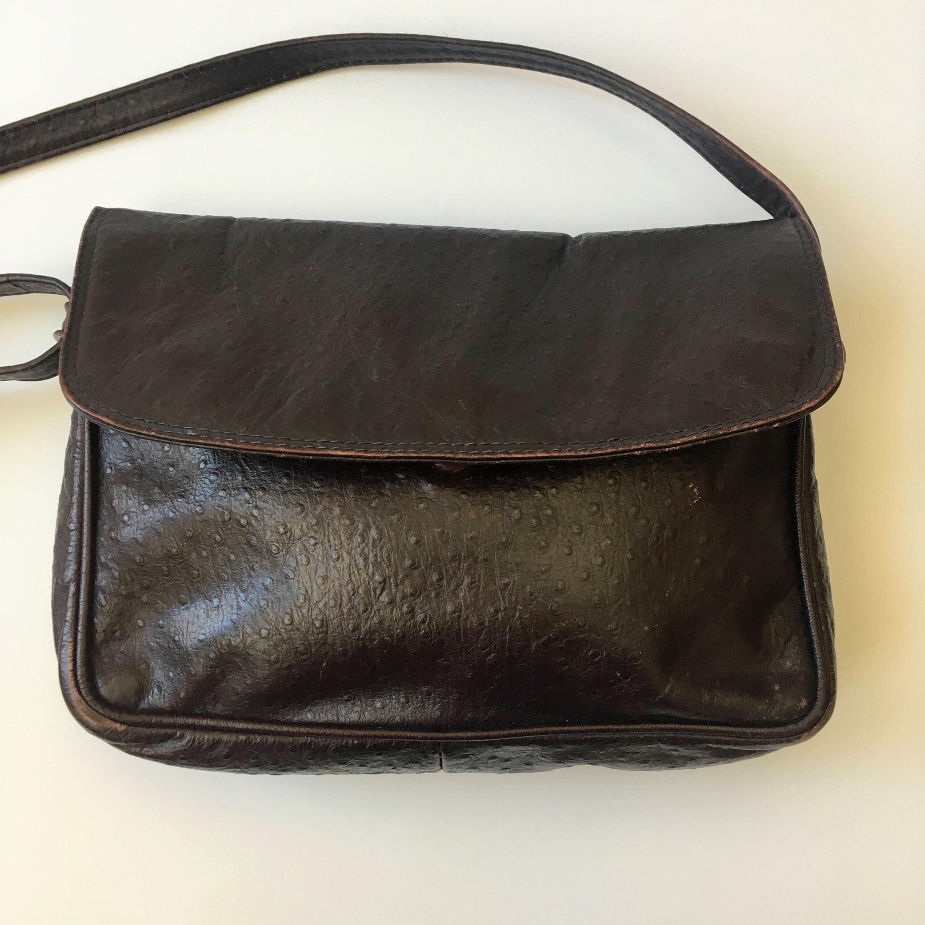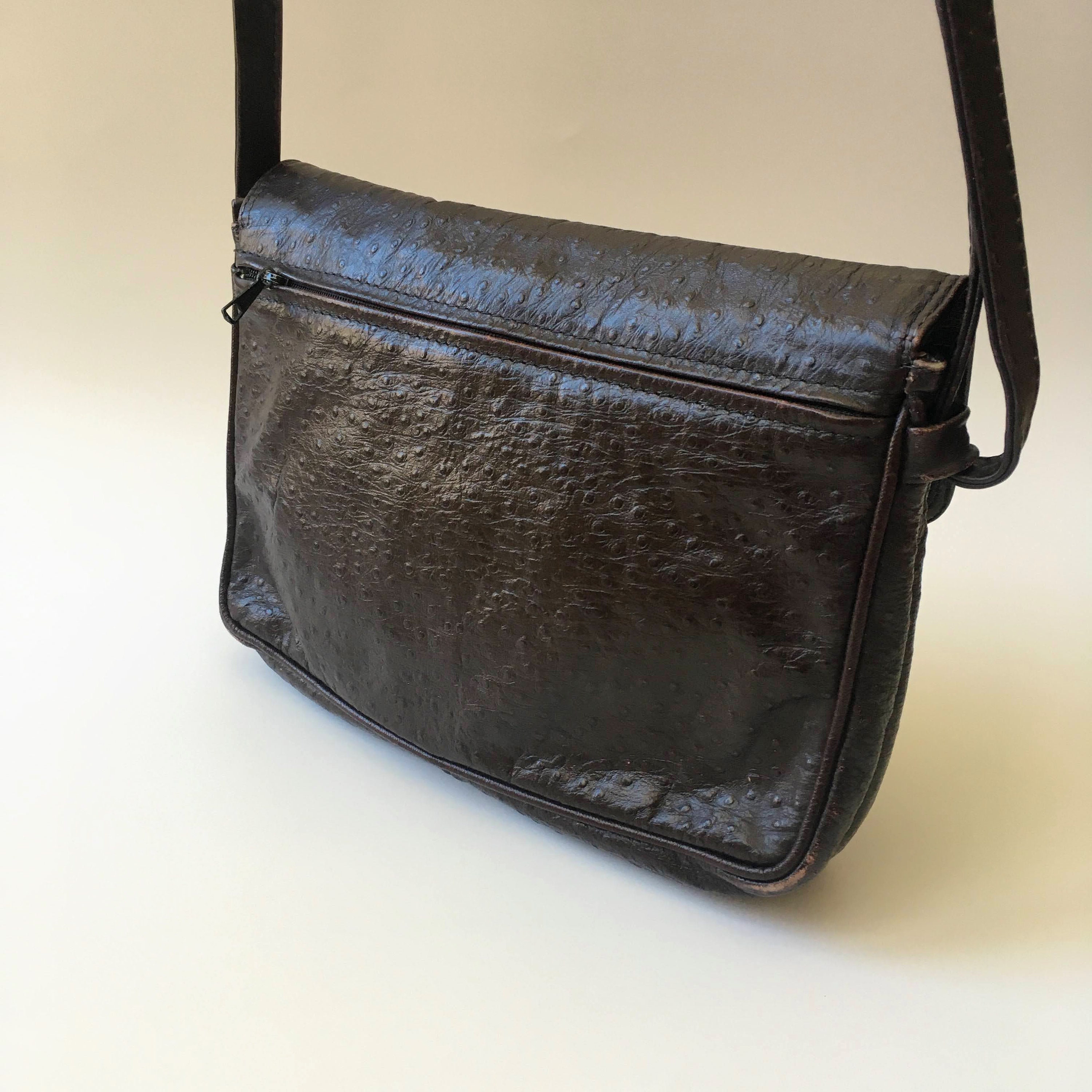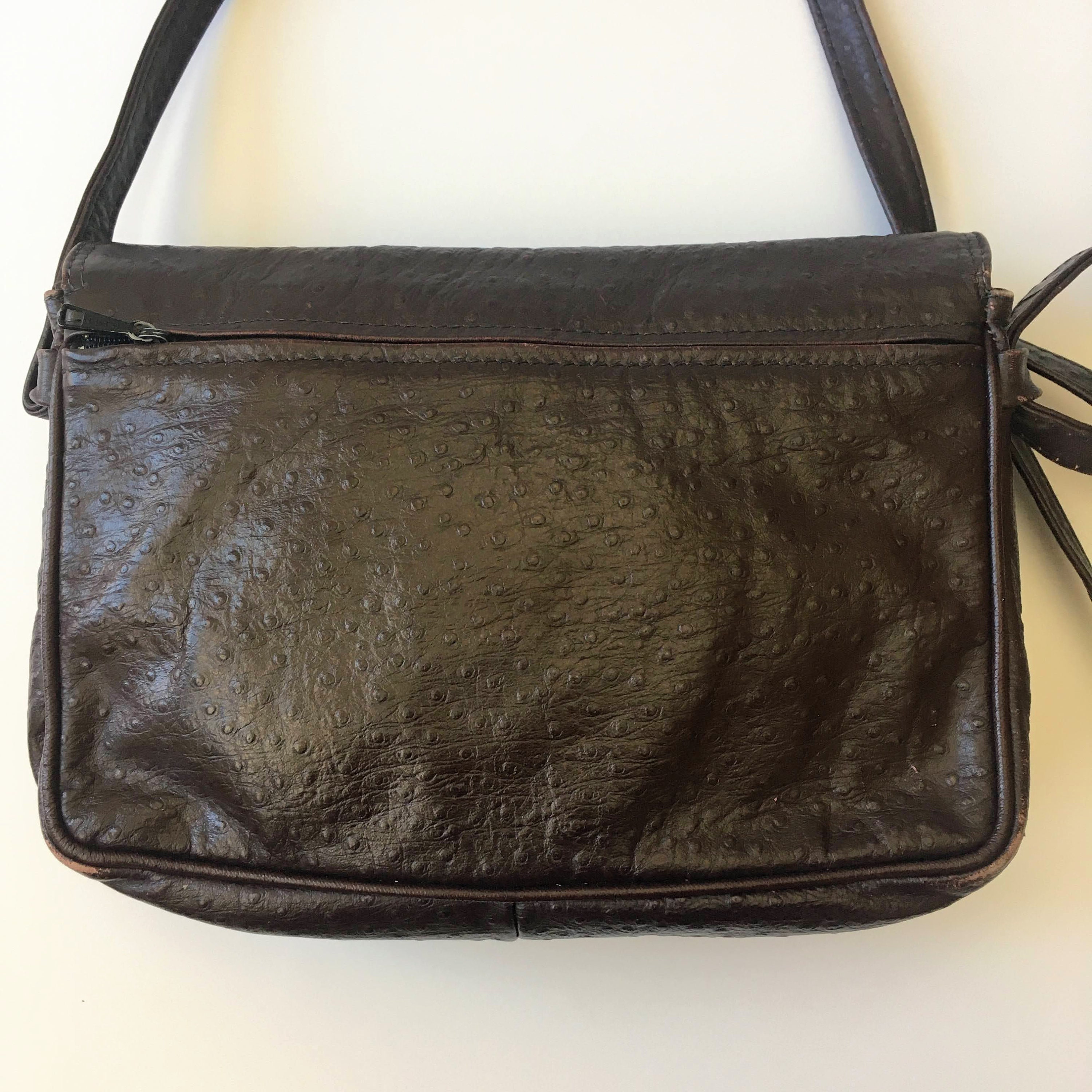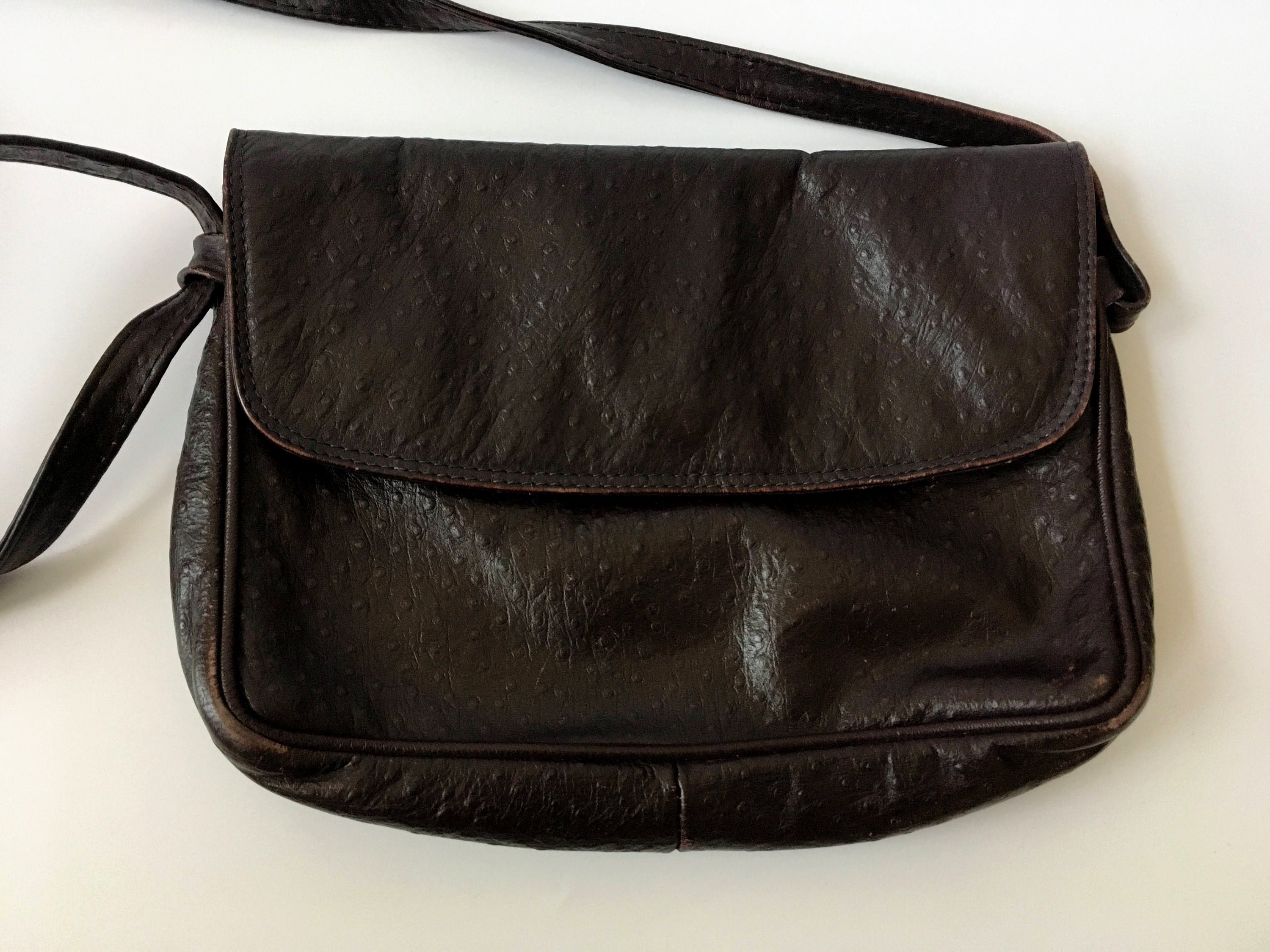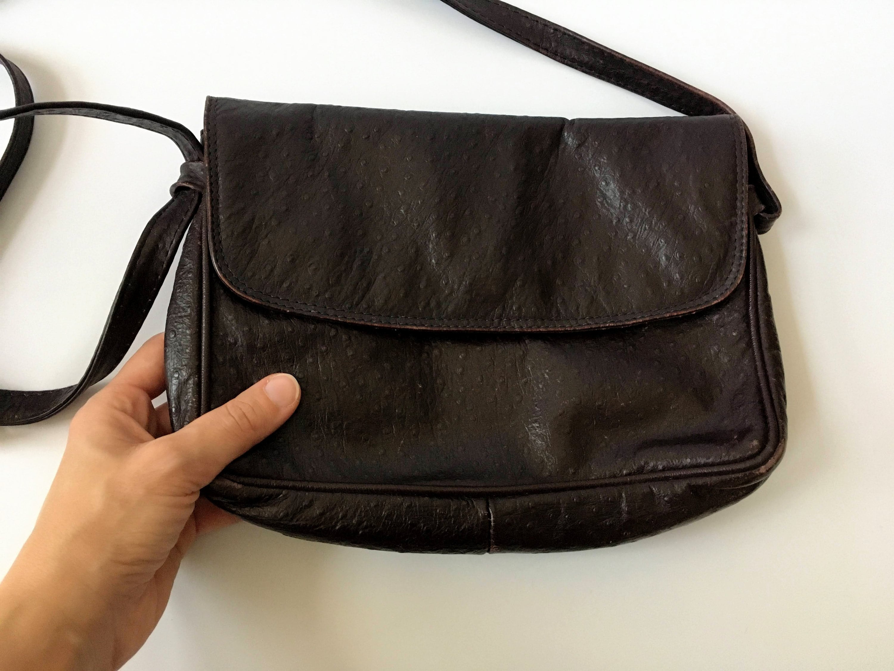 This is a beautiful vintage 80s ostrich leather brown crossbody bag with adjustable shoulder strap. This textured leather shoulder purse has distressed leather look. It has magnetic closure. There are two compartments and two pockets with zip closure inside. There is one more zipper pocket at the back. Cute little everyday purse that you can use every day of the week.